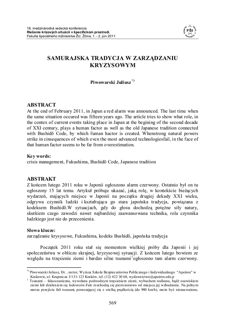 16. medzinárodná vedecká konferencia Riešenie krízových situácií v špecifickom prostredí, Fakulta špeciálneho inžinierstva ŽU, Žilina, 1. - 2. jún 2011 SAMURAJSKA TRADYCJA W ZARZĄDZANIU KRYZYSOWYM Piwowarski Juliusz *) ABSTRACT At the end of February 2011, in Japan a red alarm was announced. The last time when the same situation occured was fifteen years ago. The article tries to show what role, in the contex of current events taking place in Japan at the begining of the second decade of XXI century, plays a human factor as well as the old Japanese tradition connected with Bushidō Code, by which fuman hactor is created. Whenstrong natural powers strike in cinsequences of which even the most advanced technologiesfail, in the face of that human factor seems to be far from overestimation. Key words: crisis management, Fukushima, Bushidō Code, Japanese tradition ABSTRAKT Z końcem lutego 2011 roku w Japonii ogłoszono alarm czerwony. Ostatnio był on tu ogłoszony 15 lat temu. Artykuł próbuje ukazać, jaką rolę, w kontekście bieżących wydarzeń, mających miejsce w Japonii na początku drugiej dekady XXI wieku, odgrywa czynnik ludzki i kształtująca go stara japońska tradycja, powiązana z kodeksem Bushidō.W sytuacjach, gdy do głosu dochodzą potężne siły natury, skutkiem czego zawodzi nawet najbardziej zaawansowana technika, rola czynnika ludzkiego jest nie do przecenienia. Słowa klucze: zarządzanie krysysowe, Fukushima, kodeks Bushidō, japońska tradycja Początek 2011 roku stał się momentem wielkiej próby dla Japonii i jej społeczeństwa w obliczu skrajnej, kryzysowej sytuacji. Z końcem lutego bowiem ze względu na trzęsienie ziemi i bardzo silne tsunami 1ogłoszono tam alarm czerwony. *) 1 Piwo warski Juliusz, Dr. , rector, Wyższa Szko ła Bezpieczeństwa Publicznego i Indywidualnego "Apeiron" w Krakowie, u l. Krupnicza 3/131-123 Kraków, tel. (12) 422 30 68, wydawn [email protected] Tsunami – falaoceaniczna, wywołana podwodnym trzęsieniem ziemi, wybuchem wulkanu, bądź osuwiskiem ziemi lub dzielen iem się lodowców.Fale ro zchodzą się pierścieniowo od miejsca jej wzbudzenia. Na pełny m morzu przejście fali tsunami, poruszającej się z wielką prędkością (do 900 km/h), mo że być niezau ważone, 569 Ostatnio podobne zdarzenia miały miejsceprzed 15 laty, ale jak się w efekcie okazało – natężenie kataklizmu o tej skali ostatni raz Wyspy przeżyły 130 lat temu. W kontekście bieżących wydarzeń, mających miejsce w Japonii na początku drugiej dekady XXI wieku,świat przekonał się, jak olbrzymią rolę odgrywa czynnik ludzki i kształtująca go stara japońska tradycja, kojarzona z kodeksem Bushidō.W sytuacjach, gdy budzą się ze zwielokrotnioną energią potężne siły natury, skutkiem czego zawodzi nawet najbardziej zaawansowana technika, rola czynnika ludzkiego jest nie do przecenienia. Operatywność Japończyków,będąca pokłosiem samurajskiej tradycji tego narodu, opiera się na powiązaniach buddyzmu zen i Bushidō oraz na ciągłości owej tradycji w nowoczesnych od końca XIX w. siłach zbrojnych Cesarstwa, a także na idei, wedle której bushi(samuraj) służy społeczności nawet swoim życiem, gdy zajdzie taka potrzeba. Uwidoczniły się wyraźnie te motywy w ostatnich wydarzeniach, do których doszło w wyniku katastrofy nuklearnej w Fukushimie. Największyjak dotąd kataklizm jądrowy spowodowało zrzucenie bomb „fatman” i „little boy” na Hiroszimę i Nagasaki, które spowodowało śmiertelne napromieniowanie większości mieszkańców tych aglomeracji.Jednakbez względu na okoliczności, promieniowanie radioaktywne może być równie niebezpieczne jako efekt zagrożenia militarnego lub niemilitarnego. Rozszczepienie jądra atomowego jest powszechnie wykorzystywane do produkcji energii. Proces pokojowego wykorzystywania materiałów rozszczepialnych został zapoczątkowany po II wojnie światowej w USA, które do dziś są główną potęgą atomową świata. W Europie sama Francja 75% energii elektrycznej uzyskuje właśnie z elektrowni jądrowych. Niestety siłownie te, na skutek błędnych rozwiązań technicznych, lub też błędów popełnianych przez operatorów ulegały na przestrzeni ostatniego półwiecza licznym awariom, stając się źródłem zagrożenia dla personelu i okolicznych mieszkańców. Międzynarodowa Agencja Energii Atomowej (ang. International NuclearEventsScale) od 1990 roku stosuje siedmiostopniowąskalę gradacji awarii.Poziom zerowy oznacza brak zagrożenia lub marginalne zakłócenie dla bezpieczeństwa elektrowni, poziom 1 to anomalia, poziomy 2 i 3 określane są jako incydenty, a stopnie od 4 do 7 oznaczają już groźne wypadki. Sytuacja, z jaką mamy do czynienia w Fukushimie, została sklasyfikowana jako 6 poziom zagrożenia, tylko o jeden punkt niżej, niż największa w historii tego typu katastrofa nuklearna – czarnobylska (1986). 11 marca 2011 roku silne trzęsienie ziemi oraz uderzenie tsunami spowodowały awarię w elektrowni Fukushima, położonej 250 km na północ od Tokio. Ponieważ wystąpiły problemy zchłodzeniem rdzeni reaktorów, podjęto decyzję o kontrolowanym wypuszczeniu pary wodnej. Jednocześnie rozpoczęły się działania ewakuacyjne mieszkańców z okolic położonych w promieniu 2 km od elektrowni. Dzień później ewakuacją objęto ludzi zamieszkałych w odległości do 10 kilometrów. Doszłotakże do eksplozji wodoru, która spowodowała zniszczenie ścian i dachu w ponieważ d ługość tych fal dochodzi do kilkuset kilo metrów, ale ich wysokość nie przekracza kilkudziesięciu centymetrów. Dopiero w strefie brzegowej mo że ona osiągnąć wysokość kilkud ziesięciu metrów. Najczęściej występuje ono w basenie Oceanu Spokojnego. Podobną skalę zjawisko to osiągnęło w 2004 r. na Hait i, wskutek którego zginęło tam oko ło 300 tys. osób. 570 budynku reaktora nr 1. Wskutek czego odnotowano brak właściwego chł