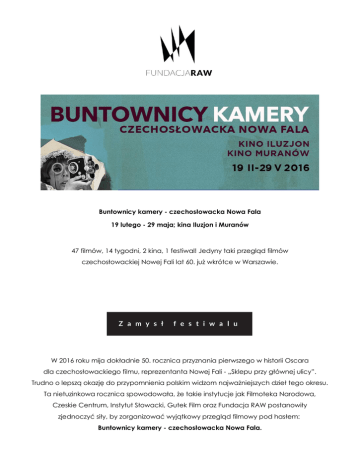 Buntownicy kamery - czechosłowacka Nowa Fala 19 lutego - 29 maja; kina Iluzjon i Muranów 47 filmów, 14 tygodni, 2 kina, 1 festiwal! Jedyny taki przegląd filmów czechosłowackiej Nowej Fali lat 60. już wkrótce w Warszawie. W 2016 roku mija dokładnie 50. rocznica przyznania pierwszego w historii Oscara dla czechosłowackiego filmu, reprezentanta Nowej Fali - „Sklepu przy głównej ulicy”. Trudno o lepszą okazję do przypomnienia polskim widzom najważniejszych dzieł tego okresu. Ta nietuzinkowa rocznica spowodowała, że takie instytucje jak Filmoteka Narodowa, Czeskie Centrum, Instytut Słowacki, Gutek Film oraz Fundacja RAW postanowiły zjednoczyć siły, by zorganizować wyjątkowy przegląd filmowy pod hasłem: Buntownicy kamery - czechosłowacka Nowa Fala. W ciągu trzech miesięcy widzowie warszawskich kin Iluzjon i Muranów oraz wrocławskiego kina Nowe Horyzonty zobaczą kilkadziesiąt produkcji, w większości poprzedzonych prelekcjami, pozwalającymi pełniej zrozumieć kontekst kulturowy, historyczny i społeczny Czechosłowacji lat 60. XX wieku. Unikatowa forma - połączenie festiwalu i przeglądu umożliwi zainteresowanym widzom obejrzenie wszystkich tytułów, co jest rzeczą trudną w przypadku festiwali realizowanych w formie weekendowej czy całotygodniowej. W kinie Iluzjon, projekcje w ramach przeglądu odbywać się będą raz w tygodniu - we czwartki, w kinie Muranów zaś we wtorki. Przegląd Buntownicy kamery - czechosłowacka Nowa Fala oferuje skarby z praskiej, bratysławskiej i warszawskiej Filmoteki, a wśród nich takie hity jak: „Miłość blondynki”, „Pociągi pod specjalnym nadzorem”, „Sklep przy głównej ulicy”, czy „Palacz zwłok”. W przeglądzie nie zabraknie jednakże tytułów mniej znanych „Morgiana”, „Waleria i tydzień cudów”, "Gdy skończy się ta noc", „Hotel dla cudzoziemców” i wiele innych. W trakcie trzech miesięcy trwania programu widzowie będa mieli okazję spotkać się z wieloma wybitnymi twórcami, którzy specjalnie na tę okazję przyjadą z Pragi i Bratysławy. Swoją wizytę nad Wisłą zapowiedzieli m.in. aktorka Magda Vašáryová, reżyserowie Jiří Menzel, Dušan Hanák, Drahomíra Vihanová. Nie zabraknie także gości z Polski, którzy opowiedzą o wpływie czechosłowackiej Nowej Fali na ich twórczość. Przegląd uzupełnią liczne prelekcje oraz ciekawe panele dyskusyjne z historykami i teoretykami filmu. Festiwal rozpocznie się w kinie Iluzjon w weekend 19-21 lutego, podczas którego zaprosimy widzów na projekcje sześciu najbardziej reprezentatywnych filmów tego nurtu, wykład o zjawisku Nowej Fali Czechosłowackiej, a także spotkania z wybitnymi reżyserami autorem „Pociągów pod specjalnym nadzorem” - Jiřim Menzlem, twórcą obrazu „322“ - Dušanem Hanakiem oraz Andrzejem Wajdą i Markiem Piwowskim. 20. lutego odbędzie się również wykład pt.: "O praskim cudzie nieco inaczej". Skąd się wzięła czechosłowacka Nowa Fala, zwana też praskim cudem filmowym? Jak wówczas była odbierana, a jaki jest jej odbiór dzisiaj? Czym zasłynęła? Na powyższe pytania, a także te zadane przez publiczność, odpowie historyk kina i animator kultury filmowej Maciej Gil. Filmy czechosłowackiej Nowej Fali będą jednym z filarów filmowej części projektu Wrocław - Europejska Stolica Kultury. Od 23 lutego do 30 czerwca będzie je wyświetlać kino Nowe Horyzonty, które także zaproponuje wizyty czeskich i słowackich filmowców oraz krytyków. Lata 60. XX wieku w wielu krajach Europy to okres zmian społecznych i politycznych, czas buntu młodych filmowców, czas poszukiwania nowych środków wyrazu. Tak narodziły się francuska Nowa Fala czy ruch Młodych Gniewnych w Wielkiej Brytanii. Również Czechom i Słowakom udało się wówczas wspiąć na światowy szczyt, zrywając jednoczescie z dotychczasowym reżimem. Czechosłowacka Nowa Fala to olbrzymi ruch filmowy, będący integralną częścią rewolucji kulturowej i świadomościowej Czechów i Słowaków lat 60. XX, która przeszła do historii pod nazwą „Praska Wiosna”. Młodzi filmowcy, którzy na poczatku tej dekady skończyli praską „filmówkę“ (FAMU) chcieli realizować filmy inaczej, niż robiło się to do tej pory – zarówno od strony formalnej jak i tematycznej. Po latach powojennej cenzury, strachu i szarości przyszła odwilż, którą wykorzystali, by pojawić się z nową estetyką i nowymi tematami. Ciekawiły ich codzienne, intymne sytuacje, okruchy zwykłego życia pozbawione obowiązującej do tej pory ideologii. Aby to, co tworzyli było jeszcze bardziej autentyczne, a widzowie mogli utożsamiać się z bohaterami, rezygnowali z aktorów zawodowych na rzecz naturszczyków, gotowe dialogi zaś zastępowali fragmentami impowizowanymi. Złagodzenie cenzury pozwoliło na wprowadzenie do kina tak charakterystycznego dla Czechosłowacji czarnego humoru. Bezkompromisowość, odwaga w podejmowaniu ważnych i niewygodnych tematów, przełomowość formy, awangardowość języka filmowego oraz wspomniany oryginalny humor to wartości, które europejskie kino w dużej mierze temu zjawisku zawdzięcza. To co udało się stowrzyć ówczesnym Buntownikom Kamery - Formanowi, Chytilovej, Menzlowi, Němcowi, Jakubisko, Hanákowi i innym - nim podcięła im skrzydła inwazja wojskowa 1968 roku i powrót surowego reżimu, do dziś zalicza się do najwybitniejszych dzieł, jakie kiedykolwiek stworzyli czescy i słowaccy filmowcy. Za dowód niech posłuży fakt, iż jako jedyna kinomatografia zaledwie ciągu dwóch lat Czechosłowacja zdobyła dwa Oscary dla filmów nieanglojęzycznych: za „Sklep przy głównej ulicy” (1965, reż. Ján Kadár, Elmar Klos) i „Pociągi pod specjalnym nadzorem” (1966, reż Jiři Menzel). Czechosłowacka Nowa Fala to filmy znane, nagradzane na festiwalach na całym świecie i cieszące się niesłabnącą sympatią, ale także niszowe produkcje artystyczne, często