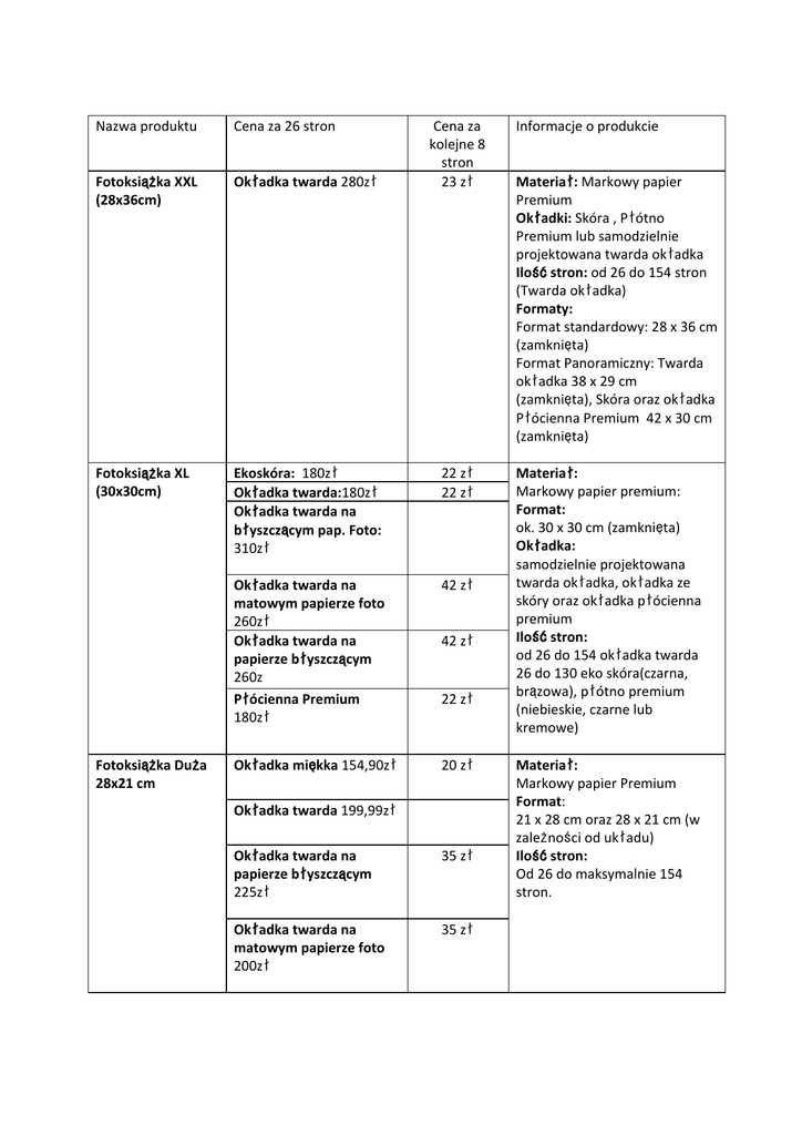 Nazwa produktu Cena za 26 stron Cena za kolejne 8 stron 23 zł Fotoksią żka XXL (28x36cm) Okładka twarda 280zł Fotoksią żka XL (30x30cm) Ekoskóra: 180zł Okładka twarda: 180zł Okładka twarda na błyszczącym pap. Foto: 310zł 22 zł 22 zł Okładka twarda na matowym papierze foto 260zł Okładka twarda na papierze błyszczącym 260z Płócienna Premium 180zł 42 zł Okładka miękka 154,90zł 20 zł Fotoksią żka Duża 28x21 cm 42 zł 22 zł Okładka twarda 199,99zł Okładka twarda na papierze błyszczącym 225zł 35 zł Okładka twarda na matowym papierze foto 200zł 35 zł Informacje o produkcie Materiał: Markowy papier Premium Okładki: Skóra , Płótno Premium lub samodzielnie projektowana twarda okładka Ilośćstron: od 26 do 154 stron (Twarda okładka) Formaty: Format standardowy: 28 x 36 cm (zamknięta) Format Panoramiczny: Twarda okładka 38 x 29 cm (zamknięta), Skóra oraz okładka Płócienna Premium 42 x 30 cm (zamknięta) Materiał: Markowy papier premium: Format: ok. 30 x 30 cm (zamknięta) Okładka: samodzielnie projektowana twarda okładka, okładka ze skóry oraz okładka płócienna premium Ilośćstron: od 26 do 154 okładka twarda 26 do 130 eko skóra(czarna, brązowa), płótno premium (niebieskie, czarne lub kremowe) Materiał: Markowy papier Premium Format : 21 x 28 cm oraz 28 x 21 cm (w zależności od układu) Ilośćstron: Od 26 do maksymalnie 154 stron. Fotoksią żka Mini Okładka twarda na błyszczącym papierze 200zł Okładka Płócienna 130zł Okładka miękka 50zł 30 zł 20 zł 9 zł Materiał: Markowy papier premium Format: ok. 15 x 11 cm (zamknięta) Okładka: Indywidualnie projektowana miękka okładka Ilośćstron: od 26 do 74 stron Format 9x13 0,80 zł Format 10x15 1,00 zł Format 13x18 1,76 zł Format 15x21 1,84 z Zdję cie za szkłem akrylowym 10x15 34 zł Zdję cie za szkłem akrylowym 13x18 44 zł Plakat na papierze foto , Format 20 14,99 zł Plakat na papierze foto , Format 30 22,99 zł Plakat na papierze foto , Format 40 32,99 zł Plakat na papierze foto , Format 50 37,99 zł