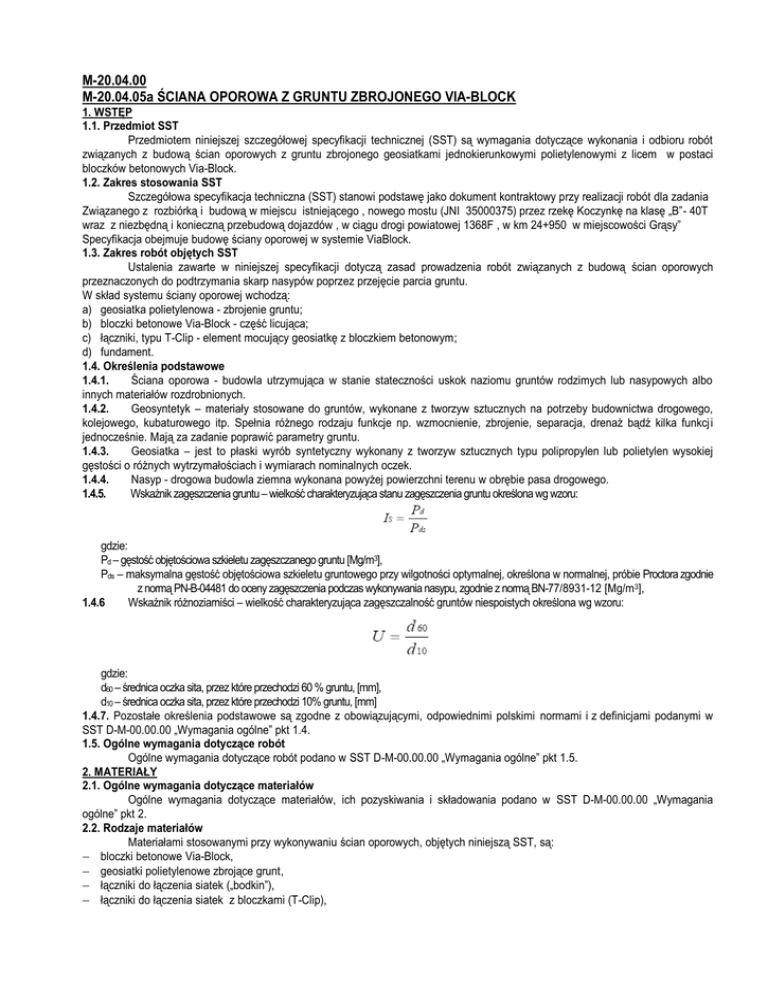 M-20.04.00 M-20.04.05a ŚCIANA OPOROWA Z GRUNTU ZBROJONEGO VIA-BLOCK 1. WSTĘP 1.1. Przedmiot SST Przedmiotem niniejszej szczegółowej specyfikacji technicznej (SST) są wymagania dotyczące wykonania i odbioru robót związanych z budową ścian oporowych z gruntu zbrojonego geosiatkami jednokierunkowymi polietylenowymi z licem w postaci bloczków betonowych Via-Block. 1.2. Zakres stosowania SST Szczegółowa specyfikacja techniczna (SST) stanowi podstawę jako dokument kontraktowy przy realizacji robót dla zadania Związanego z rozbiórką i budową w miejscu istniejącego , nowego mostu (JNI 35000375) przez rzekę Koczynkę na klasę „B”- 40T wraz z niezbędną i konieczną przebudową dojazdów , w ciągu drogi powiatowej 1368F , w km 24+950 w miejscowości Grąsy” Specyfikacja obejmuje budowę ściany oporowej w systemie ViaBlock. 1.3. Zakres robót objętych SST Ustalenia zawarte w niniejszej specyfikacji dotyczą zasad prowadzenia robót związanych z budową ścian oporowych przeznaczonych do podtrzymania skarp nasypów poprzez przejęcie parcia gruntu. W skład systemu ściany oporowej wchodzą: a) geosiatka polietylenowa - zbrojenie gruntu; b) bloczki betonowe Via-Block - część licująca; c) łączniki, typu T-Clip - element mocujący geosiatkę z bloczkiem betonowym; d) fundament. 1.4. Określenia podstawowe 1.4.1. Ściana oporowa - budowla utrzymująca w stanie stateczności uskok naziomu gruntów rodzimych lub nasypowych albo innych materiałów rozdrobnionych. 1.4.2. Geosyntetyk – materiały stosowane do gruntów, wykonane z tworzyw sztucznych na potrzeby budownictwa drogowego, kolejowego, kubaturowego itp. Spełnia różnego rodzaju funkcje np. wzmocnienie, zbrojenie, separacja, drenaż bądź kilka funkcji jednocześnie. Mają za zadanie poprawić parametry gruntu. 1.4.3. Geosiatka – jest to płaski wyrób syntetyczny wykonany z tworzyw sztucznych typu polipropylen lub polietylen wysokiej gęstości o różnych wytrzymałościach i wymiarach nominalnych oczek. 1.4.4. Nasyp - drogowa budowla ziemna wykonana powyżej powierzchni terenu w obrębie pasa drogowego. 1.4.5. Wskaźnik zagęszczenia gruntu – wielkość charakteryzująca stanu zagęszczenia gruntu określona wg wzoru: gdzie: Pd – gęstość objętościowa szkieletu zagęszczanego gruntu [Mg/m3], Pds – maksymalna gęstość objętościowa szkieletu gruntowego przy wilgotności optymalnej, określona w normalnej, próbie Proctora zgodnie z normą PN-B-04481 do oceny zagęszczenia podczas wykonywania nasypu, zgodnie z normą BN-77/8931-12 [Mg/m3], 1.4.6 Wskaźnik różnoziarniści – wielkość charakteryzująca zagęszczalność gruntów niespoistych określona wg wzoru: gdzie: d60 – średnica oczka sita, przez które przechodzi 60 % gruntu, [mm], d10 – średnica oczka sita, przez które przechodzi 10% gruntu, [mm] 1.4.7. Pozostałe określenia podstawowe są zgodne z obowiązującymi, odpowiednimi polskimi normami i z definicjami podanymi w SST D-M-00.00.00 „Wymagania ogólne” pkt 1.4. 1.5. Ogólne wymagania dotyczące robót Ogólne wymagania dotyczące robót podano w SST D-M-00.00.00 „Wymagania ogólne” pkt 1.5. 2. MATERIAŁY 2.1. Ogólne wymagania dotyczące materiałów Ogólne wymagania dotyczące materiałów, ich pozyskiwania i składowania podano w SST D-M-00.00.00 „Wymagania ogólne” pkt 2. 2.2. Rodzaje materiałów Materiałami stosowanymi przy wykonywaniu ścian oporowych, objętych niniejszą SST, są: bloczki betonowe Via-Block, geosiatki polietylenowe zbrojące grunt, łączniki do łączenia siatek („bodkin”), łączniki do łączenia siatek z bloczkami (T-Clip), 2.3. Bloczki betowe ViaBlock W technologii występują dwa typy bloczków: ścienne oraz wieńczące ścianę. Bloczki wykonywane są z betonu klasy C30/37 (zgodnie z PN-EN 206-1), mrozoodporności ≥ 150 i nasiąkliwości 5%. Wymiary bloczków przedstawiono na rysunku 2.3.1. Dopuszczalne wady powierzchni i kształtu przedstawiono w tabeli 1. Dopuszczalne odchyłki wymiarów bloczków przedstawiono w tablicy 2. Rys. 2.3.1 Bloczek Via-Block Tab.1. Dopuszczalne wady powierzchni i kształtu Lp. 1 1 2 3 4 5 Określenie wad powierzchni i kształtu 2 Rysy technologiczne - długość rysy Uszkodzenie krawędzi i naroży - długość, - szerokość Ubytek betonu - na powierzchni, - głębokość Odchylenie powierzchni bloczka od płaszczyzny (nieprostopadłościenność) Odchylenie krawędzi bloczka od linii prostej Dopuszczalne wymiary wad w mm 3 Dopuszczalna ilość wad w szt. 100 2 50 15 2 2 40 x 50 20 1 3 5 jedna ściana dwie krawędzie 4 2 Tab.2. Dopuszczalne odchyłki wymiarów bloczków Właściwości Jednostka Dopuszczalne odchyłki wymiarów bloczków 2 3 4 Odchyłka wymiarów nominalnych: - długość, mm ±3 - szerokość, mm ±2 - wysokość mm ±2 Sprawdzenie należy przeprowadzać wg PN-B-10021:1980. 2.4. Betonowe ławy fundamentowe Beton na ławy fundamentowe winien być klasy min. C20/25, zakres robót ujęto w niniejszej SST. Tolerancja wykonania fundamentu na szerokości +/-30mm, na wysokości odchylenie od poziomu +/-5mm. 2.5. Zbrojenie geosiatką polietylenową Zbrojenie gruntu powinno być wykonane z geosiatki polietylenowej. Podczas montażu geosiatek należy zwrócić szczególną uwagę na to, aby typ zastosowanych geomateriałów był zgodny z dokumentacją projektową. Geosiatka powinna posiadać następujące parametry: Geosyntetyk Minimalna Wytrzymałość Wytrzymałość przy Wytrzymałość przy wytrzymałość na obliczeniowa po 120 2% wydłużeniu 5% wydłużeniu zerwanie latach [kN/m] [kN/m] [kN/m] [kN/m] TGDG65 PE 65.00 26.80 16.00 31.00 TGDG90 PE 90.00 40.00 22.00 44.00 TGDG130 PE TGDG170 PE 130.00 170.00 53.70 71.60 36.00 52.00 73.00 101.00 2.6. Łączenie geosiatki zbrojącej z bloczkiem Via-Block Do łączenia geosiatek z bloczkiem służą łączniki typu T-Clip. Łączniki należy umieścić w żebrach geosiatki minimum co drugie żeberko Połączenie geosiatki z bloc