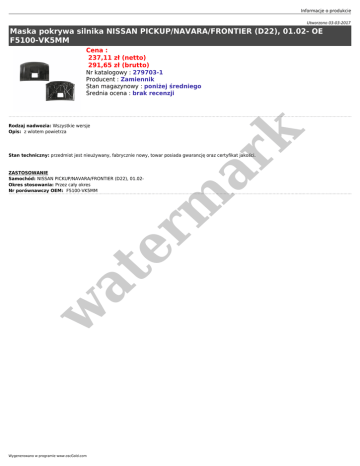 Informacje o produkcie Utworzono 03-03-2017 Maska pokrywa silnika NISSAN PICKUP/NAVARA/FRONTIER (D22), 01.02- OE F5100-VK5MM Cena : 237,11 zł (netto) 291,65 zł (brutto) Rodzaj nadwozia: Wszystkie wersje Opis: z wlotem powietrza er m ar k Nr katalogowy : 279703-1 Producent : Zamiennik Stan magazynowy : poniżej średniego Średnia ocena : brak recenzji Stan techniczny: przedmiot jest nieużywany, fabrycznie nowy, towar posiada gwarancję oraz certyfikat jakości. w at ZASTOSOWANIE Samochód: NISSAN PICKUP/NAVARA/FRONTIER (D22), 01.02Okres stosowania: Przez cały okres Nr porównawczy OEM: F5100-VK5MM Wygenerowano w programie www.oscGold.com