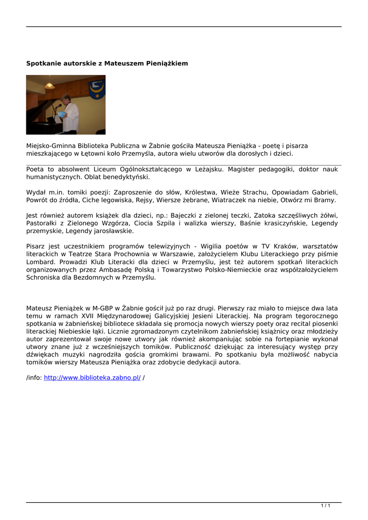 Spotkanie autorskie z Mateuszem Pieniążkiem Miejsko-Gminna Biblioteka Publiczna w Żabnie gościła Mateusza Pieniążka - poetę i pisarza mieszkającego w Łętowni koło Przemyśla, autora wielu utworów dla dorosłych i dzieci. Poeta to absolwent Liceum Ogólnokształcącego w Leżajsku. Magister pedagogiki, doktor nauk humanistycznych. Oblat benedyktyński. Wydał m.in. tomiki poezji: Zaproszenie do słów, Królestwa, Wieże Strachu, Opowiadam Gabrieli, Powrót do źródła, Ciche legowiska, Rejsy, Wiersze żebrane, Wiatraczek na niebie, Otwórz mi Bramy. Jest również autorem książek dla dzieci, np.: Bajeczki z zielonej teczki, Zatoka szczęśliwych żółwi, Pastorałki z Zielonego Wzgórza, Ciocia Szpila i walizka wierszy, Baśnie krasiczyńskie, Legendy przemyskie, Legendy jarosławskie. Pisarz jest uczestnikiem programów telewizyjnych - Wigilia poetów w TV Kraków, warsztatów literackich w Teatrze Stara Prochownia w Warszawie, założycielem Klubu Literackiego przy piśmie Lombard. Prowadzi Klub Literacki dla dzieci w Przemyślu, jest też autorem spotkań literackich organizowanych przez Ambasadę Polską i Towarzystwo Polsko-Niemieckie oraz współzałożycielem Schroniska dla Bezdomnych w Przemyślu. Mateusz Pieniążek w M-GBP w Żabnie gościł już po raz drugi. Pierwszy raz miało to miejsce dwa lata temu w ramach XVII Międzynarodowej Galicyjskiej Jesieni Literackiej. Na program tegorocznego spotkania w żabnieńskej bibliotece składała się promocja nowych wierszy poety oraz recital piosenki literackiej Niebieskie łąki. Licznie zgromadzonym czytelnikom żabnieńskiej książnicy oraz młodzieży autor zaprezentował swoje nowe utwory jak również akompaniując sobie na fortepianie wykonał utwory znane już z wcześniejszych tomików. Publiczność dziękując za interesujący występ przy dźwiękach muzyki nagrodziła gościa gromkimi brawami. Po spotkaniu była możliwość nabycia tomików wierszy Mateusza Pieniążka oraz zdobycie dedykacji autora. /info: http://www.biblioteka.zabno.pl/ / 1/1 Powered by TCPDF (www.tcpdf.org)