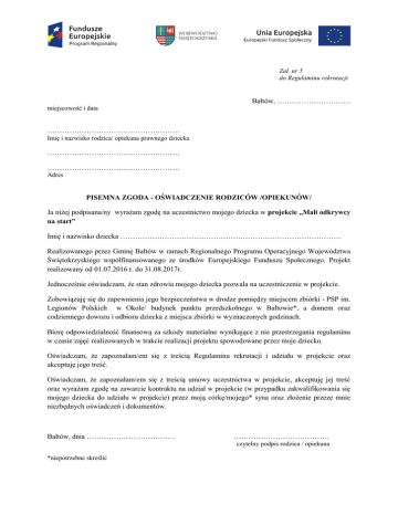 Zał. nr 5 do Regulaminu rekrutacji Bałtów, ………………………… miejscowość i data ……………………………………………… Imię i nazwisko rodzica/ opiekuna prawnego dziecka ……………………………………………… ……………………………………………… Adres PISEMNA ZGODA - OŚWIADCZENIE RODZICÓW /OPIEKUNÓW/ Ja niżej podpisana/ny wyrażam zgodę na uczestnictwo mojego dziecka w projekcie ,,Mali odkrywcy na start” Imię i nazwisko dziecka ……………………………………………………………………………… Realizowanego przez Gminę Bałtów w ramach Regionalnego Programu Operacyjnego Województwa Świętokrzyskiego współfinansowanego ze środków Europejskiego Funduszu Społecznego. Projekt realizowany od 01.07.2016 r. do 31.08.2017r. Jednocześnie oświadczam, że stan zdrowia mojego dziecka pozwala na uczestniczenie w projekcie. Zobowiązuję się do zapewnienia jego bezpieczeństwa w drodze pomiędzy miejscem zbiórki - PSP im. Legionów Polskich w Okole/ budynek punktu przedszkolnego w Bałtowie*, a domem oraz codziennego dowozu i odbioru dziecka z miejsca zbiórki w wyznaczonych godzinach. Biorę odpowiedzialność finansową za szkody materialne wynikające z nie przestrzegania regulaminu w czasie zajęć realizowanych w trakcie realizacji projektu spowodowane przez moje dziecko. Oświadczam, że zapoznałam/em się z treścią Regulaminu rekrutacji i udziału w projekcie oraz akceptuję jego treść. Oświadczam, że zapoznałam/em się z treścią umowy uczestnictwa w projekcie, akceptuję jej treść oraz wyrażam zgodę na zawarcie kontraktu na udział w projekcie (w przypadku zakwalifikowania się mojego dziecka do udziału w projekcie) przez moją córkę/mojego* syna oraz złożenie przeze mnie niezbędnych oświadczeń i dokumentów. Bałtów, dnia ……………………………… ………………………………… czytelny podpis rodzica / opiekuna *niepotrzebne skreślić