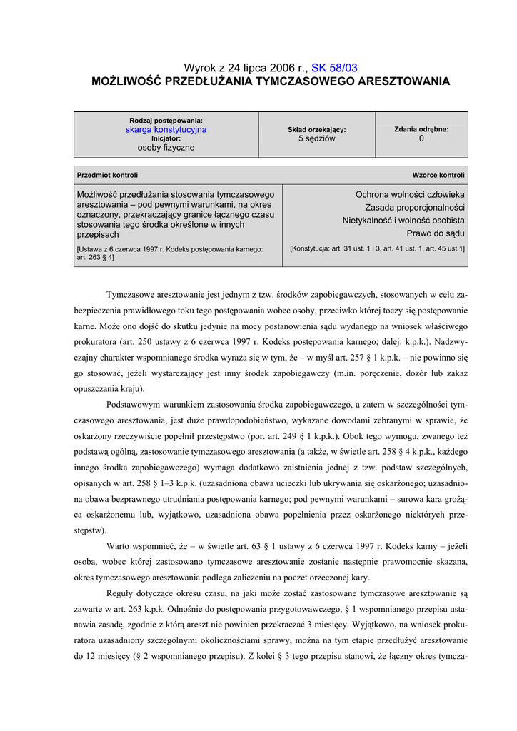 Wyrok z 24 lipca 2006 r., SK 58/03 MOŻLIWOŚĆ PRZEDŁUŻANIA TYMCZASOWEGO ARESZTOWANIA Rodzaj postępowania: skarga konstytucyjna Inicjator: osoby fizyczne Skład orzekający: 5 sędziów Przedmiot kontroli Możliwość przedłużania stosowania tymczasowego aresztowania – pod pewnymi warunkami, na okres oznaczony, przekraczający granice łącznego czasu stosowania tego środka określone w innych przepisach [Ustawa z 6 czerwca 1997 r. Kodeks postępowania karnego: art. 263 § 4] Zdania odrębne: 0 Wzorce kontroli Ochrona wolności człowieka Zasada proporcjonalności Nietykalność i wolność osobista Prawo do sądu [Konstytucja: art. 31 ust. 1 i 3, art. 41 ust. 1, art. 45 ust.1] Tymczasowe aresztowanie jest jednym z tzw. środków zapobiegawczych, stosowanych w celu zabezpieczenia prawidłowego toku tego postępowania wobec osoby, przeciwko której toczy się postępowanie karne. Może ono dojść do skutku jedynie na mocy postanowienia sądu wydanego na wniosek właściwego prokuratora (art. 250 ustawy z 6 czerwca 1997 r. Kodeks postępowania karnego; dalej: k.p.k.). Nadzwyczajny charakter wspomnianego środka wyraża się w tym, że – w myśl art. 257 § 1 k.p.k. – nie powinno się go stosować, jeżeli wystarczający jest inny środek zapobiegawczy (m.in. poręczenie, dozór lub zakaz opuszczania kraju). Podstawowym warunkiem zastosowania środka zapobiegawczego, a zatem w szczególności tymczasowego aresztowania, jest duże prawdopodobieństwo, wykazane dowodami zebranymi w sprawie, że oskarżony rzeczywiście popełnił przestępstwo (por. art. 249 § 1 k.p.k.). Obok tego wymogu, zwanego też podstawą ogólną, zastosowanie tymczasowego aresztowania (a także, w świetle art. 258 § 4 k.p.k., każdego innego środka zapobiegawczego) wymaga dodatkowo zaistnienia jednej z tzw. podstaw szczególnych, opisanych w art. 258 § 1–3 k.p.k. (uzasadniona obawa ucieczki lub ukrywania się oskarżonego; uzasadniona obawa bezprawnego utrudniania postępowania karnego; pod pewnymi warunkami – surowa kara grożąca oskarżonemu lub, wyjątkowo, uzasadniona obawa popełnienia przez oskarżonego niektórych przestępstw). Warto wspomnieć, że – w świetle art. 63 § 1 ustawy z 6 czerwca 1997 r. Kodeks karny – jeżeli osoba, wobec której zastosowano tymczasowe aresztowanie zostanie następnie prawomocnie skazana, okres tymczasowego aresztowania podlega zaliczeniu na poczet orzeczonej kary. Reguły dotyczące okresu czasu, na jaki może zostać zastosowane tymczasowe aresztowanie są zawarte w art. 263 k.p.k. Odnośnie do postępowania przygotowawczego, § 1 wspomnianego przepisu ustanawia zasadę, zgodnie z którą areszt nie powinien przekraczać 3 miesięcy. Wyjątkowo, na wniosek prokuratora uzasadniony szczególnymi okolicznościami sprawy, można na tym etapie przedłużyć aresztowanie do 12 miesięcy (§ 2 wspomnianego przepisu). Z kolei § 3 tego przepisu stanowi, że łączny okres tymcza- 2 sowego aresztowania w postępowaniu przygotowawczym oraz w postępowaniu sądowym do chwili wydania pierwszego wyroku przez sąd I instancji nie może przekroczyć 2 lat. Zaskarżony w niniejszej sprawie art. 263 § 4 k.p.k. ustanawia wyjątek od opisanych wyżej przepisów art. 263 § 2 i § 3, dopuszczając dalsze przedłużenie tymczasowego aresztowania na okres oznaczony, przekraczający odpowiednio 12 miesięcy (w postępowaniu przygotowawczym) lub 2 lata (w postępowaniu sądowym) – „jeżeli konieczność taka powstaje w związku z zawieszeniem postępowania karnego, przedłużającą się obserwacją psychiatryczną oskarżonego, przedłużającym się opracowywaniem opinii biegłego, wykonywaniem czynności dowodowych w sprawie o szczególnej zawiłości lub poza granicami kraju, celowym przewlekaniem postępowania przez oskarżonego, a także z powodu innych istotnych przeszkód, których usunięcie było niemożliwe”. Przedłużenia postępowania może dokonać właściwy sąd apelacyjny, działając na wniosek prokuratora apelacyjnego (jeżeli sprawa znajduje się jeszcze na etapie postępowania przygotowawczego) lub sądu prowadzącego postępowanie. Na postanowienie w przedmiocie przedłużenia aresztu przysługuje zażalenie do sądu apelacyjnego orzekającego w składzie trzyosobowym (art. 263 § 5 k.p.k.). Postępowanie w niniejszej sprawie zostało zainicjowane wniesieniem dwóch skarg konstytucyjnych, skierowanych do łącznego rozpoznania. W sprawach obydwu skarżących – postanowieniami Sądu Apelacyjnego, utrzymanymi następnie przez ten Sąd w mocy w wyniku wniesienia zażaleń – doszło do przedłużenia tymczasowego aresztowania na podstawie art. 263 § 4 k.p.k. Wskazując na możliwość de facto nieograniczonego przedłużania okresu aresztu na podstawie zaskarżonej regulacji, autorzy skarg konstytucyjnych zarzucili naruszenie ich konstytucyjnych i traktatowych gwarancji wyrażonych w art. 31 ust. 1 (ochrona wolności człowieka) i ust. 3 (zasada proporcjonalności ograniczeń konstytucyjnych wolności i praw), art. 41 ust. 1 (nietykalność i wolność osobista) i art. 45 ust. 1 Konstytucji RP (prawo do sądu), a także w art. 9 ust. 3 Międzynarodowego Paktu Praw Obywatelskich i Politycznych (dalej: MPPOiP), otwartego do podpisu w Nowym Jorku dnia 19 grudnia 1966 r. (prawa osób aresztowanych lub zatrzymanych pod zarzutem popełnienia przestępstwa). Przed przystąpieniem do merytorycznej oceny zarzutów, Trybunał zajął się formalną dopuszczalnością skarg konstytucyjnych (zob. niżej tezy 1–2). Pojawiła się bowiem wątpliwość, podnoszona w szczególności w stanowisku Prokuratora Generalnego, czy postanowienie sądu apelacyjnego wydane w wyniku wniesienia zażalenia na postanowienie o przedłużeniu tymczasowego aresztowania jest orzeczeniem ostatecznym w rozumieniu art. 79 ust. 1 Konstytucji. Przepis ten uzależnia dopuszczalność wniesienia skargi konstytucyjnej od wydania w sprawie skarżącego ostatecznego orzeczenia o jego