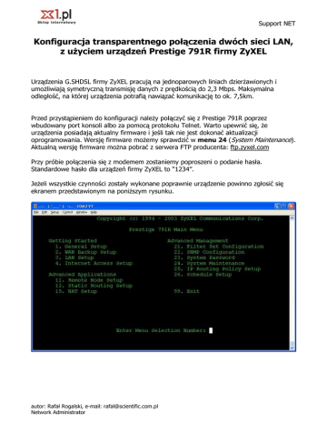 Support NET Konfiguracja transparentnego połączenia dwóch sieci LAN, z użyciem urządzeń Prestige 791R firmy ZyXEL Urządzenia G.SHDSL firmy ZyXEL pracują na jednoparowych liniach dzierżawionych i umożliwiają symetryczną transmisję danych z prędkością do 2,3 Mbps. Maksymalna odległość, na której urządzenia potrafią nawiązać komunikację to ok. 7,5km. Przed przystąpieniem do konfiguracji należy połączyć się z Prestige 791R poprzez wbudowany port konsoli albo za pomocą protokołu Telnet. Warto upewnić się, że urządzenia posiadają aktualny firmware i jeśli tak nie jest dokonać aktualizacji oprogramowania. Wersję firmware możemy sprawdzić w menu 24 (System Maintenance). Aktualną wersję firmware można pobrać z serwera FTP producenta: ftp.zyxel.com Przy próbie połączenia się z modemem zostaniemy poproszeni o podanie hasła. Standardowe hasło dla urządzeń firmy ZyXEL to “1234”. Jeżeli wszystkie czynności zostały wykonane poprawnie urządzenie powinno zgłosić się ekranem przedstawionym na poniższym rysunku. autor: Rafał Rogalski, e-mail: [email protected] Network Administrator Support NET Konfiguracja urządzenia klient: Przechodzimy do menu 1 gdzie należy określić nazwę dla naszego systemu oraz wyłączyć tryb Routing i aktywować tryb Bridge. Konfigurując menu 3.2 należy wyłączyć serwer DHCP oraz ustalić adres IP dla urządzenia. Adres IP nie jest wymagany jednak jest potrzebny do zarządzania modemem z sieci lokalnej. autor: Rafał Rogalski, e-mail: [email protected] Network Administrator Support NET W menu 2 ustalamy tryb pracy urządzenia Client oraz określamy prędkość transmisji. Możemy również określić przedział, z którego będzie wybierana najlepsza możliwa prędkość. Menu 11.1 - ustalamy parametry dla połączenia takie jak Encapsulation i Multiplexing parametry te muszą przyjąć te same wartości na obu urządzeniach. Wyłączamy tryb Route i aktywujemy Bridge. autor: Rafał Rogalski, e-mail: [email protected] Network Administrator Support NET Konfiguracja urządzenia serwer: Przechodzimy do menu 1 gdzie należy określić nazwę dla naszego systemu oraz wyłączyć tryb Routing i aktywować tryb Bridge. W menu 3.2 należy wyłączyć serwer DHCP oraz ustalić adres IP dla urządzenia. autor: Rafał Rogalski, e-mail: [email protected] Network Administrator Support NET W menu 2 ustalamy tryb pracy urządzenia Server oraz określamy prędkość transmisji. Możemy również określić przedział, z którego będzie wybierana najlepsza możliwa prędkość. Menu 11.1 - ustalamy parametry dla połączenia takie jak Encapsulation i Multiplexing parametry te muszą przyjmować te same wartości na obu urządzeniach. Wyłączamy tryb Route i aktywujemy Bridge. autor: Rafał Rogalski, e-mail: [email protected] Network Administrator Support NET Jeżeli poprawnie skonfigurowaliśmy urządzenia w menu 24.1 możemy sprawdzić status naszego połączenia. autor: Rafał Rogalski, e-mail: [email protected] Network Administrator