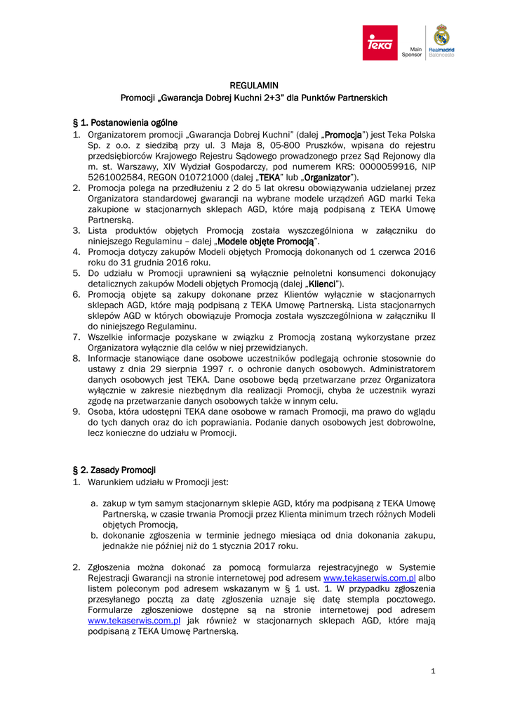REGULAMIN Promocji „Gwarancja Dobrej Kuchni 2+3” 2+3” dla Punktów Partnerskich § 1. Postanowienia ogólne 1. Organizatorem promocji „Gwarancja Dobrej Kuchni” (dalej „Promocj Promocja Promocja”) jest Teka Polska Sp. z o.o. z siedzibą przy ul. 3 Maja 8, 05-800 Pruszków, wpisana do rejestru przedsiębiorców Krajowego Rejestru Sądowego prowadzonego przez Sąd Rejonowy dla m. st. Warszawy, XIV Wydział Gospodarczy, pod numerem KRS: 0000059916, NIP 5261002584, REGON 010721000 (dalej „TEKA TEKA” Organizator”). TEKA lub „Organizator Organizator 2. Promocja polega na przedłużeniu z 2 do 5 lat okresu obowiązywania udzielanej przez Organizatora standardowej gwarancji na wybrane modele urządzeń AGD marki Teka zakupione w stacjonarnych sklepach AGD, które mają podpisaną z TEKA Umowę Partnerską. 3. Lista produktów objętych Promocją została wyszczególniona w załączniku do niniejszego Regulaminu – dalej „Modele Modele objęte Promocją”. Promocją 4. Promocja dotyczy zakupów Modeli objętych Promocją dokonanych od 1 czerwca 2016 roku do 31 grudnia 2016 roku. 5. Do udziału w Promocji uprawnieni są wyłącznie pełnoletni konsumenci dokonujący detalicznych zakupów Modeli objętych Promocją (dalej „Klienci Klienci”). Klienci 6. Promocją objęte są zakupy dokonane przez Klientów wyłącznie w stacjonarnych sklepach AGD, które mają podpisaną z TEKA Umowę Partnerską. Lista stacjonarnych sklepów AGD w których obowiązuje Promocja została wyszczególniona w załączniku II do niniejszego Regulaminu. 7. Wszelkie informacje pozyskane w związku z Promocją zostaną wykorzystane przez Organizatora wyłącznie dla celów w niej przewidzianych. 8. Informacje stanowiące dane osobowe uczestników podlegają ochronie stosownie do ustawy z dnia 29 sierpnia 1997 r. o ochronie danych osobowych. Administratorem danych osobowych jest TEKA. Dane osobowe będą przetwarzane przez Organizatora wyłącznie w zakresie niezbędnym dla realizacji Promocji, chyba że uczestnik wyrazi zgodę na przetwarzanie danych osobowych także w innym celu. 9. Osoba, która udostępni TEKA dane osobowe w ramach Promocji, ma prawo do wglądu do tych danych oraz do ich poprawiania. Podanie danych osobowych jest dobrowolne, lecz konieczne do udziału w Promocji. § 2. Zasady Promocji Promocji 1. Warunkiem udziału w Promocji jest: a. zakup w tym samym stacjonarnym sklepie AGD, który ma podpisaną z TEKA Umowę Partnerską, w czasie trwania Promocji przez Klienta minimum trzech różnych Modeli objętych Promocją, b. dokonanie zgłoszenia w terminie jednego miesiąca od dnia dokonania zakupu, jednakże nie później niż do 1 stycznia 2017 roku. 2. Zgłoszenia można dokonać za pomocą formularza rejestracyjnego w Systemie Rejestracji Gwarancji na stronie internetowej pod adresem www.tekaserwis.com.pl albo listem poleconym pod adresem wskazanym w § 1 ust. 1. W przypadku zgłoszenia przesyłanego pocztą za datę zgłoszenia uznaje się datę stempla pocztowego. Formularze zgłoszeniowe dostępne są na stronie internetowej pod adresem www.tekaserwis.com.pl jak również w stacjonarnych sklepach AGD, które mają podpisaną z TEKA Umowę Partnerską. 1 3. Rejestracja wymaga w szczególności kompletnego i czytelnego wypełnienia formularza zgłoszeniowego oraz załączenia kopii dowodu zakupu Modeli objętych Promocją w okresie trwania Promocji. 4. W przypadku spełnienia warunków określonych w niniejszym regulaminie, po dokonaniu przez Klienta zgłoszenia i zweryfikowaniu jego poprawności, w Systemie Rejestracji Gwarancji, w terminie 30 dni, zostaną wygenerowane dla uczestnika Promocji karty gwarancyjne dla zakupionych przez Klienta egzemplarzy Modeli objętych Promocją z 5letnim okresem obowiązywania gwarancji. 5. Każdy Klient może zgłosić wszystkie, lecz nie mniej niż trzy, kupione przez siebie egzemplarze Modeli objętych Promocją. § 3. Postępowanie reklamacyjne 1. Uczestnikowi Promocji przysługuje prawo złożenia reklamacji dotyczącej jego udziału w Promocji, w tym poprawności rejestracji sprzętu. 2. Reklamację należy złożyć do TEKA w formie pisemnej pod adresem wskazanym w § 1 ust. 1 albo pod adresem poczty elektronicznej [email protected] do dnia 28 lutego 2017 roku. 3. Uczestnik zostanie powiadomiony o sposobie rozstrzygnięcia reklamacji w terminie 14 dni od daty jej wpłynięcia. § 4. Postanowienie Postanowienie końcowe Regulamin Promocji jest dostępny do wglądu w siedzibie Organizatora oraz na stronie internetowej pod adresem www.teka.com Pruszków, dnia 1 czerwca 2016 r. 2 ZAŁĄCZNIK Wykaz produktów objętych promocją „Gwarancja Dobrej Kuchni 2+3” dla Punktów Partnerskich obowiązującą od 1 czerwca 2016 r. do 31 grudnia 2016 r. MODEL MODEL MODEL PIEKARNIKI HL 840 WHITE HL 845 PŁYTY GAZOWE CGW LUX 60 4G AI AL CGW LUX 70 5G AI AL TR OKAPY PRZYŚCIENNE DVL 90 DVT 60 BLACK HL 850 HL 870 HL 890 HR 650 CREAM CGW LUX 90 5G AI AL DR EFX 60 4G AI AL EFX 60 4G AI AL DR EFX 70 5G AI AL DR DVT 60 WHITE DVT 90 BLACK DVT 90 WHITE DVU 560 BLACK HR 650 GRAPHITE HR 750 ANTHRACITE HR 750 BEIGE HR 750 BRIGHT CREAM EFX 90 5G AI AL DR EH 60 4G AI AL TR ANTHRACITE EH 60 4G AI AL TR BEIGE EH 60 4G AI AL TR BRIGHT CREAM DVU 560 WHITE DVU 590 BLACK DVU 590 WHITE NC2 60 INOX HS 735 HS 725 HS 710 BLACK HS 710 WHITE EH 60 4G AI AL TR INOX ER 60 4G AI AL CREAM ER 60 4G AI AL GRAPHITE EW 60 4G AI AL BLACK NC2 60 BLACK NC2 90 INOX NC2 90 BLACK OKAPY PODSZAFKOWE URZĄDZENIA KOMPAKTOWE CML 45 CPEL 15 HKL 870 EW 60 4G AI AL INOX EW 90 5G AI AL TR BLACK EW 90 5G AI AL TR INOX HF LUX 60 4G AI AL WHITE CNL3 2002 HKL 970 AL. MCL 32 BIS MCS 32 BIH MWL 32 BIS HF LUX 60 4G AI AL VR 90 4G AI AL. TR VT.2 2G AI AL. OKAPY WYSPOWE GFG2 GLASS BLACK GFG2 GLASS WHITE GFH 55 GFH 73 MWR 32 BI ANTHRACITE MWR 32 BI BEIGE KUCHENKI MIKROFALOWE MWL 20 BIT CC 40 DG3 90 Isla DH2 90 Isla DPL 110 Isla TL1-62 TL1-52 CHŁODZIARKO-ZAMRAŻARKI CI 342 MWL 22 EGL WHITE MWL 22 EGL MWL 
