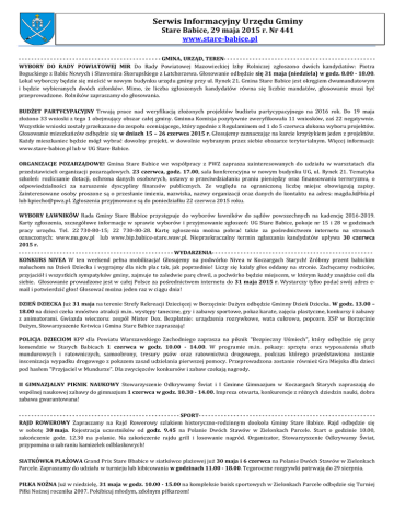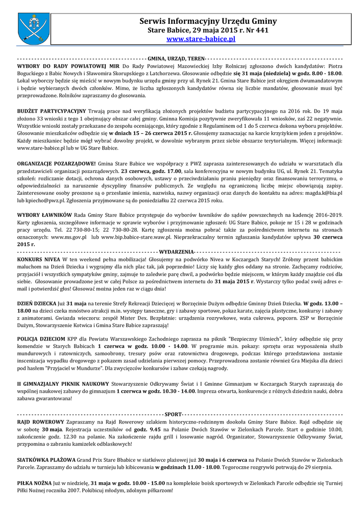 Serwis Informacyjny Urzędu Gminy Stare Babice, 29 maja 2015 r. Nr 441 www.stare-babice.pl - - - - - - - - - - - - - - - - - - - - - - - - - - - - - - - - - - - - - - - - - - - - - GMINA, URZĄD, TEREN- - - - - - - - - - - - - - - - - - - - - - - - - - - - - - - - - - - - - - - - - - - - - - - WYBORY DO RADY POWIATOWEJ MIR Do Rady Powiatowej Mazowieckiej Izby Rolniczej zgłoszono dwóch kandydatów: Piotra Boguckiego z Babic Nowych i Sławomira Skorupskiego z Latchorzewa. Głosowanie odbędzie się 31 maja (niedziela) w godz. 8.00 - 18.00. Lokal wyborczy będzie się mieścić w nowym budynku urzędu gminy przy ul. Rynek 21. Gmina Stare Babice jest okręgiem dwumandatowym i będzie wybieranych dwóch członków. Mimo, że liczba zgłoszonych kandydatów równa się liczbie mandatów, głosowanie musi być przeprowadzone. Rolników zapraszamy do głosowania. BUDŻET PARTYCYPACYJNY Trwają prace nad weryfikacją złożonych projektów budżetu partycypacyjnego na 2016 rok. Do 19 maja złożono 33 wnioski z tego 1 obejmujący obszar całej gminy. Gminna Komisja pozytywnie zweryfikowała 11 wniosków, zaś 22 negatywnie. Wszystkie wnioski zostały przekazane do zespołu oceniającego, który zgodnie z Regulaminem od 1 do 5 czerwca dokona wyboru projektów. Głosowanie mieszkańców odbędzie się w dniach 15 – 26 czerwca 2015 r. Głosujemy zaznaczając na karcie krzyżykiem jeden z projektów. Każdy mieszkaniec będzie mógł wybrać dowolny projekt, w dowolnie wybranym przez siebie obszarze terytorialnym. Więcej informacji: www.stare-babice.pl lub w UG Stare Babice. ORGANIZACJE POZARZĄDOWE! Gmina Stare Babice we współpracy z PWZ zaprasza zainteresowanych do udziału w warsztatach dla przedstawicieli organizacji pozarządowych. 23 czerwca, godz. 17.00, sala konferencyjna w nowym budynku UG, ul. Rynek 21. Tematyka szkoleń: rozliczanie dotacji, ochrona danych osobowych, ustawy o przeciwdziałaniu praniu pieniędzy oraz finansowaniu terroryzmu, o odpowiedzialności za naruszenie dyscypliny finansów publicznych. Ze względu na ograniczoną liczbę miejsc obowiązują zapisy. Zainteresowane osoby proszone są o przesłanie imienia, nazwiska, nazwy organizacji oraz danych do kontaktu na adres: [email protected] lub [email protected]. Zgłoszenia przyjmowane są do poniedziałku 22 czerwca 2015 roku. WYBORY ŁAWNIKÓW Rada Gminy Stare Babice przystępuje do wyborów ławników do sądów powszechnych na kadencję 2016-2019. Karty zgłoszenia, szczegółowe informacje w sprawie wyborów i przyjmowanie zgłoszeń: UG Stare Babice, pokoje nr 15 i 28 w godzinach pracy urzędu. Tel. 22 730-80-15; 22 730-80-28. Kartę zgłoszenia można pobrać także za pośrednictwem internetu na stronach oznaczonych: www.ms.gov.pl lub www.bip.babice-stare.waw.pl. Nieprzekraczalny termin zgłaszania kandydatów upływa 30 czerwca 2015 r. - - - - - - - - - - - - - - - - - - - - - - - - - - - - - - - - - - - - - - - - - - - - - - - - - WYDARZENIA- - - - - - - - - - - - - - - - - - - - - - - - - - - - - - - - - - - - - - - - - - - - - - - - - - KONKURS NIVEA W ten weekend pełna mobilizacja! Głosujemy na podwórko Nivea w Koczargach Starych! Zróbmy przent babickim maluchom na Dzień Dziecka i wygrajmy dla nich plac tak, jak poprzednio! Liczy się każdy głos oddany na stronie. Zachęcamy rodziców, przyjaciół i wszystkich sympatyków gminy, zajmuje to zaledwie parę chwil, a podwórko będzie miejscem, w którym każdy znajdzie coś dla siebie. Głosowanie prowadzone jest w całej Polsce za pośrednictwem internetu do 31 maja 2015 r. Wystarczy tylko podać swój adres email i potwierdzić głos! Głosować można jeden raz w ciągu dnia! DZIEŃ DZIECKA Już 31 maja na terenie Strefy Rekreacji Dziecięcej w Borzęcinie Dużym odbędzie Gminny Dzień Dziecka. W godz. 13.00 – 18.00 na dzieci czeka mnóstwo atrakcji m.in. występy taneczne, gry i zabawy sportowe, pokaz karate, zajęcia plastyczne, konkursy i zabawy z animatorami. Gwiazda wieczoru: zespół Mister Dex. Bezpłatnie: urządzenia rozrywkowe, wata cukrowa, popcorn. ZSP w Borzęcinie Dużym, Stowarzyszenie Kotwica i Gmina Stare Babice zapraszają! POLICJA DZIECIOM KPP dla Powiatu Warszawskiego Zachodniego zaprasza na piknik "Bezpieczny Uśmiech", który odbędzie się przy komendzie w Starych Babicach 1 czerwca w godz. 10.00 - 14.00. W programie m.in. pokazy: sprzętu oraz wyposażenia służb mundurowych i ratowniczych, samoobrony, tresury psów oraz ratownictwa drogowego, podczas którego przedstawiona zostanie inscenizacja wypadku drogowego z pokazem zasad udzielania pierwszej pomocy. Przeprowadzona zostanie również Gra Miejska dla dzieci pod hasłem "Przyjaciel w Mundurze". Dla zwycięzców konkursów i zabaw czekają nagrody. II GIMNAZJALNY PIKNIK NAUKOWY Stowarzyszenie Odkrywamy Świat i I Gminne Gimnazjum w Koczargach Starych zapraszają do wspólnej naukowej zabawy do gimnazjum 1 czerwca w godz. 10.30 - 14.00. Impreza otwarta, konkurencje z różnych dziedzin nauki, dobra zabawa gwarantowana! - - - - - - - - - - - - - - - - - - - - - - - - - - - - - - - - - - - - - - - - - - - - - - - - - - - SPORT- - - - - - - - - - - - - - - - - - - - - - - - - - - - - - - - - - - - - - - - - - - - - - - - - - - - - - - RAJD ROWEROWY Zapraszamy na Rajd Rowerowy szlakiem historyczno-rodzinnym dookoła Gminy Stare Babice. Rajd odbędzie się w sobotę 30 maja. Rejestracja uczestników od godz. 9.45 na Polanie Dwóch Stawów w Zielonkach Parcele. Start o godzinie 10.00, zakończenie godz. 12.30 na polanie. Na zakończenie rajdu grill i losowanie nagród. Organizator, Stowarzyszenie Odkrywamy Świat, przypomina o zabraniu kamizelek odblaskowych! SIATKÓWKA PLAŻOWA Grand Prix Stare Bbabice w siatkówce plażowej już 30 maja i 6 czerwca na Polanie Dwóch Stawów w Zielonkach Parcele. Zapraszamy do udziału w turnieju lub kibicowania w godzinach 11.00 - 18.00. Tegoroczne rozgrywki potrwają do 29 sierpnia. PIŁKA NOŻNA Już w niedzielę, 31 maja w godz. 10.0