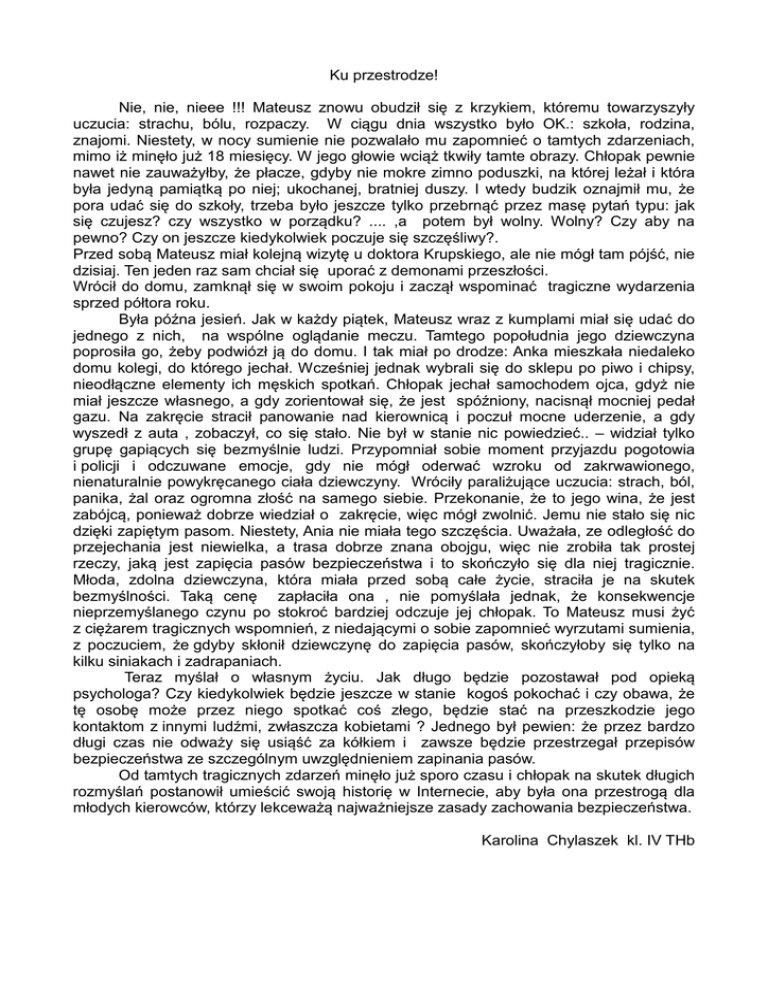 Ku przestrodze! Nie, nie, nieee !!! Mateusz znowu obudził się z krzykiem, któremu towarzyszyły uczucia: strachu, bólu, rozpaczy. W ciągu dnia wszystko było OK.: szkoła, rodzina, znajomi. Niestety, w nocy sumienie nie pozwalało mu zapomnieć o tamtych zdarzeniach, mimo iż minęło już 18 miesięcy. W jego głowie wciąż tkwiły tamte obrazy. Chłopak pewnie nawet nie zauważyłby, że płacze, gdyby nie mokre zimno poduszki, na której leżał i która była jedyną pamiątką po niej; ukochanej, bratniej duszy. I wtedy budzik oznajmił mu, że pora udać się do szkoły, trzeba było jeszcze tylko przebrnąć przez masę pytań typu: jak się czujesz? czy wszystko w porządku? .... ,a potem był wolny. Wolny? Czy aby na pewno? Czy on jeszcze kiedykolwiek poczuje się szczęśliwy?. Przed sobą Mateusz miał kolejną wizytę u doktora Krupskiego, ale nie mógł tam pójść, nie dzisiaj. Ten jeden raz sam chciał się uporać z demonami przeszłości. Wrócił do domu, zamknął się w swoim pokoju i zaczął wspominać tragiczne wydarzenia sprzed półtora roku. Była późna jesień. Jak w każdy piątek, Mateusz wraz z kumplami miał się udać do jednego z nich, na wspólne oglądanie meczu. Tamtego popołudnia jego dziewczyna poprosiła go, żeby podwiózł ją do domu. I tak miał po drodze: Anka mieszkała niedaleko domu kolegi, do którego jechał. Wcześniej jednak wybrali się do sklepu po piwo i chipsy, nieodłączne elementy ich męskich spotkań. Chłopak jechał samochodem ojca, gdyż nie miał jeszcze własnego, a gdy zorientował się, że jest spóźniony, nacisnął mocniej pedał gazu. Na zakręcie stracił panowanie nad kierownicą i poczuł mocne uderzenie, a gdy wyszedł z auta , zobaczył, co się stało. Nie był w stanie nic powiedzieć.. – widział tylko grupę gapiących się bezmyślnie ludzi. Przypomniał sobie moment przyjazdu pogotowia i policji i odczuwane emocje, gdy nie mógł oderwać wzroku od zakrwawionego, nienaturalnie powykręcanego ciała dziewczyny. Wróciły paraliżujące uczucia: strach, ból, panika, żal oraz ogromna złość na samego siebie. Przekonanie, że to jego wina, że jest zabójcą, ponieważ dobrze wiedział o zakręcie, więc mógł zwolnić. Jemu nie stało się nic dzięki zapiętym pasom. Niestety, Ania nie miała tego szczęścia. Uważała, ze odległość do przejechania jest niewielka, a trasa dobrze znana obojgu, więc nie zrobiła tak prostej rzeczy, jaką jest zapięcia pasów bezpieczeństwa i to skończyło się dla niej tragicznie. Młoda, zdolna dziewczyna, która miała przed sobą całe życie, straciła je na skutek bezmyślności. Taką cenę zapłaciła ona , nie pomyślała jednak, że konsekwencje nieprzemyślanego czynu po stokroć bardziej odczuje jej chłopak. To Mateusz musi żyć z ciężarem tragicznych wspomnień, z niedającymi o sobie zapomnieć wyrzutami sumienia, z poczuciem, że gdyby skłonił dziewczynę do zapięcia pasów, skończyłoby się tylko na kilku siniakach i zadrapaniach. Teraz myślał o własnym życiu. Jak długo będzie pozostawał pod opieką psychologa? Czy kiedykolwiek będzie jeszcze w stanie kogoś pokochać i czy obawa, że tę osobę może przez niego spotkać coś złego, będzie stać na przeszkodzie jego kontaktom z innymi ludźmi, zwłaszcza kobietami ? Jednego był pewien: że przez bardzo długi czas nie odważy się usiąść za kółkiem i zawsze będzie przestrzegał przepisów bezpieczeństwa ze szczególnym uwzględnieniem zapinania pasów. Od tamtych tragicznych zdarzeń minęło już sporo czasu i chłopak na skutek długich rozmyślań postanowił umieścić swoją historię w Internecie, aby była ona przestrogą dla młodych kierowców, którzy lekceważą najważniejsze zasady zachowania bezpieczeństwa. Karolina Chylaszek kl. IV THb