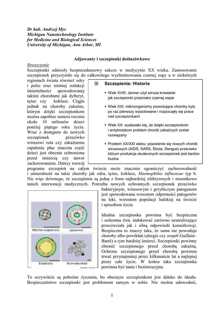 Dr hab. Andrzej Myc Michigan Nanotechnology Institute for Medicine and Biological Sciences University of Michigan, Ann Arbor, MI Adjuwanty i szczepionki dośluzówkowe Streszczenie Szczepionki odniosły bezprecedensowy sukces w medycynie XX wieku. Zastosowanie szczepionek przyczyniło się do całkowitego wyeliminowania czarnej ospy a w niektórych regionach świata również odry Szczepienie: Historia i polio oraz istotnej redukcji śmiertelności spowodowanej Wiek XVIII: Jenner użył wirusa krowianki takimi chorobami jak dyfteryt, jak szczepionki przeciwko czarnej ospie tężec czy koklusz. Ciągle jednak na choroby zakaźne, Wiek XIX: mikroorganizmy powodujące choroby były po raz pierwszy wyizolowane i rozpoczęły się prace którym dzięki szczepionkom nad szczepionkami można zapobiec umiera rocznie około 10 milionów dzieci Wiek XX: wydawało się, że dzięki szczepionkom poniżej piątego roku życia. i antybiotykom problem chorób zakaźnych został Wraz z dostępem do nowych rozwiązany szczepionek przeciwko wirusowi rota czy zakaźnemu Przełom XX/XXI wieku: pojawienie się nowych chorób zapaleniu płuc znaczna część wirusowych (AIDS, SARS, Ebola, Dengue) przeciwko dzieci jest obecnie ochroniona którym produkcja skutecznych szczepionek jest bardzo przed śmiercią czy nawet trudna zachorowaniem. Dalszy rozwój programu szczepień na całym świecie może znacznie ograniczyć zachorowalność i umieralność na takie choroby jak odra, tężec, koklusz, Haemophilus influenzae typ b. Nic więc dziwnego, że szczepienia są jedną z form najbardziej efektywnych i stosunkowo tanich interwencji medycznych. Potrzeba nowych ochronnych szczepionek przeciwko bakteryjnym, wirusowym i grzybiczym patogenom jest spowodowana wzrostem odporności patogenów na leki, wzrostem populacji ludzkiej na świecie i sposobem życia. Różne rodzaje Idealna szczepionka powinna być bezpieczna i ochronna (tzn. indukować zarówno neutralizujące przeciwciała jak i silną odpowiedź komórkową). Bezpieczna to znaczy taka, że sama nie powoduje choroby albo powikłań (alergia czy zespół Guillain– Barré) a tym bardziej śmierci. Szczepionki powinny chronić szczepionego przed chorobą zakaźną. Ochrona szczepionego przed chorobą powinna trwać przynajmniej przez kilkanaście lat a najlepiej przez całe życie. W końcu taka szczepionka powinna być tania i bezinwazyjna. Toadjuwantów oczywiście są pobożne życzenia, bo obecnym szczepionkom jest daleko do ideału. Bezpieczeństwo szczepionki jest problemem samym w sobie. Nie można udowodnić, 1 że jakikolwiek medyczny zabieg jest całkowicie bezpieczny, dla wszystkich ludzi i w każdych okolicznościach. Zawsze istnieje jakiś stopień zagrożenia, tak jak np. przy prowadzeniu samochodu. Problem drugi to brak szczepionki, która by indukowała długotrwałą ochronę przed chorobą w całej ludzkiej populacji. Ludzie starzy, niemowlęta czy ludzie z uszkodzonym układem immunologicznym będą odpowiadać na szczepionkę inaczej (zwykle gorzej) niż populacja ludzi młodych i zdrowych. Z tego też powodu potrzebne są różne rodzaje szczepionek w zależności od warunków zdrowotnych człowieka. Zasadniczo szczepionki składają się z jakiegoś rodzaju antygenu i innych dodatków takich jak adjuwanty, które czynią szczepionkę bardziej skuteczną. Istnieją cztery typy szczepionek: zawierające osłabiony patogen, zawierające zinaktywowany patogen, zawierające dobrze zdefinowane białka patogenu, w końcu szczepionki DNA. Szczepionki zawierające osłabiony patogen, który nie może wywołać choroby, ale może wyindukować odpowiedź odpornościową może nie być bezpieczny, szczególnie przy szczepieniu ludzi z uszkodzonym układem immunologicznym. Szczepionki zawierające zinaktywowane patogeny są bardziej bezpieczne, ale mogą nie być w pełni ochronne. Z kolei Schemat cząsteczki nanoemulsji szczepionki z dobrze zdefiniowanym antygenem mogą nie być ochronne szczególnie przeciwko patogenom, które mutują antygeny z wysoką częstotliwością albo „ukrywają” się wewnątrz komórek gospodarza. W końcu szczepionki DNA, które są ciągle na etapie eksperymentów i nie są łatwo dostępne, mogą powodować przewlekłe zapalenia i alergie. Pomimo tych wszystkich problemów każda nowa generacja szczepionek jest bardziej bezpieczna i skuteczna. W ciągu ostatnich lat prowadzone są intensywne badania nad szczepionkami przeciwko nowym groźnym patogenom, takim jak wirusy Dengue czy Ebola. Prowadzone są również Schemat badania, abycząsteczki nowe nanoemulsji szczepionki były podawane w miejsca, poprzez które najczęściej dochodzi do zakażeń. Uważa się że nowe szczepionki byłyby bardziej skuteczne od tradycyjnych podawanych podskórnie, śródskórnie czy domięśniowo, gdyby podawano je donosowo, doodbytniczo czy dopochwowo. Na uwagę tutaj zasługuje fakt, że większość patogenów zakaża człowieka poprzez układ oddechowy, którego powierzchnia jest ogromna (90 m2). Szczepienia ochronne poprzez nos byłyby tu Przeżywalność myszy szczepionych donosowo przeciwko bardzo wskazane. Takie wirusowi krowianki (zinaktywowany wirus krowianki szczepionki wymagają jednak z nanoemulsją) i zakażanych wirusem krowianki nowych adjuwantów niż posiadającym gen na lucyferazę (VV-WR-Luc) powszechnie stosowane sole aluminium, które są bezużyteczne 2 w szczepionkach śluzówkowych (donosowych). Obecnie naukowcy pracują nad kilkoma innymi rodzajami adjuwantów: liposomy, np. wirosomy, emulsje, ligandy dla receptorów takich jak TRL, RLR, NOD2, nad osłabionymi składowymi toksyn i enterotoksyn oraz nad hybrydowymi adjuwantami zawierającymi cytokiny (IL1, IL2, IL12). W naszych własnych badaniach skoncetrowaliśmy się na nanoemulsjach jako potencjalnym adjuwancie szczepionek śluzówkowych (donosowych). Wyprodukowaliśmy emulsje o wielkości cząsteczek mniejszych od mikrometra (stąd w nazwie jest nano), 