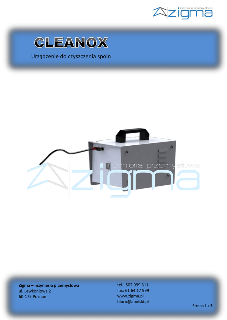 Urządzenie do czyszczenia spoin Zigma – inżynieria przemysłowa ul. Lewkoniowa 2 60-175 Poznań tel.: 502 999 311 fax: 61 64 17 999 www.zigma.pl [email protected] Strona 1 z 3 Urządzenie do czyszczenia spoin Cleanox to nowy i prosty w użyciu produkt do czyszczenia przebarwień po spawaniu. Zapewnia on błyskawiczne czyszczenie stali nierdzewnych, a także przywrócenie przebarwionym miejscom własności antykorozyjnych, bez specjalistycznego przygotowania miejsca pracy. Po użyciu oczyszczone miejsca muszą zostać jedynie spłukane czystą wodą lub wytarte suchą szmatką. Istotną cechą Cleanox’a jest fakt, że podczas pracy działanie systemu ogranicza się wyłącznie do przeznaczonego do czyszczenia fragmentu metalu. To oznacza, że nie jest potrzebne specjalne przystosowanie pomieszczeń, w których system jest używany. Jest całkowicie nietoksyczny, gdyż do czyszczenia używany jest jedynie elektrolit. W miejscach przebarwionych stal często traci odpornośc na korozję. Cleanox – po usunięciu przebarwienia – przywraca pełne własności antykorozyjne w przebarwionych wcześniej miejscach i dzięki temu można go używać także do usuwania błędów wykonawczych tj. przywracania własności antykorozyjnych materiału. Zigma – inżynieria przemysłowa ul. Lewkoniowa 2 60-175 Poznań tel.: 502 999 311 fax: 61 64 17 999 www.zigma.pl [email protected] Strona 2 z 3 Urządzenie do czyszczenia spoin Korzyści: Atrakcyjna cena!!! Czyszczenie przebiega natychmiastowo. Możliwość czyszczenia, elektropolerowania oraz znakowania stali. Nie jest wymagana dodatkowa obróbka mechaniczna. Nie ma potrzeby specjalistycznego przygotowania elementu i pomieszczenia. Po oczyszczeniu element odzyskuje pełne własności stali nierdzewnych. Do czyszczenia wymagany jest jedynie elektrolit. Nadmiar płynu można zebrać suchą szmatką. Elektrolit nie wymaga neutralizacji. Bezpieczny dla środowiska i użytkownika. Spoina przed czyszczeniem Akcesoria: Do urządzenia można osobno dokupić wszystkie części eksploatacyjne. Elektrolit dostępny w atrakcyjnej cenie. Dla stałych klientów oferujemy atrakcyjne rabaty. Parametry techniczne: Gabaryty 280x150x195 Masa 3 kg. Zasilanie 230 V Pobór prądu 250 W Spoina po czyszczeniu Cennik: Cleanox 980 PLN* Elektrolit 180 PLN* (5 l.) 720 PLN* (25 l.) 5 PLN* szt. 250 PLN* Szmatki czyszczące Dodatkowa rączka * cena netto Zigma – inżynieria przemysłowa ul. Lewkoniowa 2 60-175 Poznań tel.: 502 999 311 fax: 61 64 17 999 www.zigma.pl [email protected] Strona 3 z 3