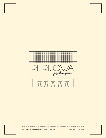UL. BERNARDYŃSKA 15A, LUBLIN Tel. 81 71 01 205 Kuchnia Perłowej Pijalni Piwa zapewnia niepowtarzalną okazję do celebrowania posiłków i odkrywania ich prawdziwych smaków w kompozycji z piwem. Szef Kuchni Przemysław Kaproń łączy sekrety tradycyjnej kuchni polskiej z elementami nowatorskiej sztuki gotowania. Wykorzystujemy wysokiej jakości naturalne produkty z małych rodzinnych przedsiębiorstw. Nasze menu zmienia się wraz z porami roku. Chcemy szerzyć bliską nam ideę Slow Food, a więc dawać przyjemność ze smakowania. PRZEKĄSKI CHIPSY Z MARCHWI CHIPSY Z SELERA SUSZONA WOŁOWINA HOT DOG Z KIEŁBASKĄ WIEPRZOWĄ, CHUTNEYEM I MUSZTARDĄ CIASTECZKA PIWNE KANAPKA Z GOLONKĄ golonka, chutney dyniowy, pikle z cebuli perłowej, brukselka blanszowana, majonez. KANAPKA RYBNA filet z pstrąga, majonez koperkowy, kiszona czerwona kapusta, sałata. KANAPKA WEGAŃSKA warzywa pieczone: burak, seler, marchewka, pietruszka, pasta z soczewicy, boczniak, kiszone zielone pomidory, sałata. 4 zł 4 zł 7 zł 7 zł 2 zł 16 zł 17 zł 10 zł PRZYSTAWKI ROSÓŁ RYBNY wędzony karp, groszek cukrowy, kluseczki z koperkiem. 13 zł ŚLEDŹ KLASYCZNY sałatka ziemniaczana, jabłko kiszone, majonez majerankowy, burak, marchew, seler. 14 zł PLACUSZEK Z KASZY GRYCZANEJ brukiew, śmietana z ogórka, pikle dyni, puree z papryki, krem twarogowy. 14 zł TATAR WOŁOWY żółtko sous-vide, pomidor kiszony, marynowane shimeij białe, musztarda piernikowa. 19 zł PLASTRY PIERSI KACZKI gruszka z imbirem, majonez z kaczki, remulada z selera, pomana z buraka. 15 zł DESKA WĘDLIN WŁASNEJ PRODUKCJI szynka długo pieczona, słonina w papryce, pasztecik z gęsi, rostbef, karczek prosciutto, marynowana cukinia, majonez wędzony, musztarda, ćwikła. 19 zł MENU DANIA GŁÓWNE MAKARON PIWNY kapusta kiszona z kminkiem, prażone orzechy włoskie, espuma marchwiowa, sos grzybowy, pikle kalafiora. 20 zł STEK Z ANTRYKOTU WOŁOWEGO puree z pietruszki i ziemniaka, palona marchew, pieczony por, krem ze śliwki. 42 zł KARP SAUTE tarta z porem, seler cytrynowy, emulsja z pietruszki, warzywa duszone. 27 zł BOCZEK ZE ŚWINI PUŁAWSKIEJ kapusta czerwona sous vide, tarciuch ziemniaczany, puree z marchwii, cebulka perłowa. 26 zł KIEŁBASKI WŁASNEJ PRODUKCJI kapusta zasmażana, puree ziemniaczane, musztarda. 21 zł DESERY CIASTKO MAKOWE krem z palonego masła, śnieg świerkowy, żel malinowy, biszkopt suszony, sorbet z żurawiny. 13 zł SELEKCJA LODÓW WŁASNEJ PRODUKCJI sorbet piwny, palone masło, żurawina, kruszonka, żele owocowe. 11 zł TARTA CZEKOLADOWA ZE SŁONYM KARMELEM żel wiśniowy, sorbet z porzeczki i pomarańczy, merinque. 14 zł NAPOJE WODA GRATIS Jest głównym składnikiem piwa. Jej właściwości mają decydujący wpływ na prawidłowość wszystkich etapów procesu warzenia. Chcemy się dzielić skarbem, jakim obdarzyła nas natura, więc serwujemy ją za darmo. CISOWIANKA PERLAGE 4 zł / 0,33l Delikatnie gazowana woda mineralna. Swoją subtelność zawdzięcza stworzonej przez naturę kompozycji minerałów. MR. DARK BLACK 7 zł / 0,33l Polski napój gazowany o smaku koli z dodatkiem czarnego bzu. Produkowany na naturalnych składnikach zawierających wyciąg z nasion koli. HERBATY ZIELONA 5 zł CZARNA 5 zł MR. DARK SILVER 7 zł / 0,33l Orzeźwiający gazowany tonic zawierający wyciąg z chininy, która jest organicznym związkiem o gorzkim smaku znajdującym się w korze drzewa chinowego rosnącego w Ameryce Południowej w Andach. Wyjątkowa mieszanka kaw z lubelskiej palarni Kaffe 2009 starannie wyselekcjonowana dla Perłowej Pijalni Piwa. LEMONIADA VETTERA ESPRESSO 5 zł DOPPIO 7 zł 4 zł / 0,33l Orzeźwiający napój przygotowywany w Perłowej Pijalni Piwa. Nawiązuje do historii produkcji w Wytwórni Lemoniady i Wód Gazowych K.R.Vettera. SOKI I KOKTAJLE 9 zł / 0,33l Świeżo wyciskane na miejscu soki z sezonowych owoców. W zależności od Państwa sugestii obsługa doradza odpowiedni napój bogaty w witaminy. CHILL 12 zł / 0,5l Głównymi składnikami napoju są pigwa, róża oraz szyszka chmielu, która posiada właściwości relaksacyjne. KAWY AMERICANO 5 zł CAPPUCCINO 6 zł LATTE / LATTE MACCHIATO 8 zł KAWA MROŻONA (do wyboru: czekolada, migdał, mango) 10 zł ALKOHOLE PIWO Każde z naszych piw pełne jest pasji i zaangażowania, którymi chcemy się z Państwem podzielić. Owoc naszej pracy powstaje z najlepszych odmian słodu oraz szlachetnych gatunków polskich chmieli, uprawianych przez dziesiątki lat na Lubelszczyźnie w rodzinnych chmielnikach. PERŁA CHMIELOWA - PERŁA EXPORT PERŁA KOŹLAK - ZWIERZYNIEC PILS - ORDYNACKIE LEKKIE Piwa warzone sezonowo PERŁA PORTER BAŁTYCKI WEIZENBOCK Zwierzyniec Pils butelka Perła Koźlak butelka Perła Porter Bałtycki BUTELKA DESKA DEGUSTACYJNA WYBRANYCH PIW 6 zł / 0,5l 7 zł / 0,5l 7 zł / 0,5l 10 zł / 0,5l 4 zł / 0,3l 5 zł / 0,3l 6 zł / 0,3l 5 zł / 0,33l 5 zł / 0,33l 5 zł / 0,33l 10 zł / 4x l25ml NALEWKI KAROLA MAJEWSKIEGO Nalewki Staropolskie tworzone są zgodnie z wielowiekową recepturą. Owoce z najstarszych odmian, pochodzą z naturalnych upraw z małych, wiejskich sadów. Łączone są z najlepszymi rodzajami spirytusu. Oferowane nalewki to manufaktura domowa. TARNINA 12 zł / 40ml NALEWKA 12 zł / 40ml Z GŁOGU Tarnina zwana tarką lub cierniakiem zbierana jest po przemrożeniu. Nalewkę charakteryzuje lekki posmak śliwki. NALEWKA 12 zł / 40ml Z KWIATÓW CZARNEGO BZU Zwana owocem kardiologicznym. Nalewka przygotowana od „serca” dla „serca”. Rocznik 2010. NALEWKA 12 zł / 40ml JEŻYNOWO MALINOWA Delikatny zapach kwiatów czarnego bzu, wzbogacony smakiem cytryny i limonki. Rocznik 2010. Doskonała harmonia smaków leśnej jeżyny i maliny. ALKOHOLE WINA Z WINNICY SOLARIS Położona na obrzeżach Opola Lubelskiego winnica oferuje wina niszowe, powstające w mikroskali, gdzie roczna produkcja nie przekracza kilkuset butelek. O ich jakości świadczy ręczny, staranny zbiór i selekcja owoców. Stosowane jest równ