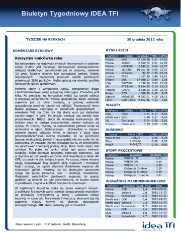 Biuletyn Tygodniowy IDEA TFI TYDZIEŃ NA RYNKACH KOMENTARZ RYNKOWY 20 grudnia 2012 roku RYNKI AKCJI Korzystna końcówka roku Na koniunkturę na krajowych rynkach finansowych w ostatnim czasie trudno jest narzekać. Rentowności dziesięcioletnich obligacji skarbowych zanurkowały już do poziomu, zaledwie 3,9 proc. Kolejne rekordy bije warszawski parkiet. Indeks największych i najbardziej płynnych spółek giełdowych przekroczył 2560 punktów. Nieźle spisują się również portfele mniejszych spółek giełdowych. Pomimo obaw o wykupienie rynku, perspektywy długo i średnioterminowe wciąż rysują się obiecująco. Powodów jest kilka. Po pierwsze, na horyzoncie widać już oznaki odbicia w krajowej koniunkturze. Polska gospodarka dołek zanotuje zapewne już za kilka miesięcy, a później wskaźniki gospodarcze powinny zacząć się odbijać. Towarzyszyć temu będzie poprawa nastrojów w globalnych gospodarkach – wskaźniki PMI dla Chin czy dla strefy euro już delikatnie zaczęły drgać w górę. Po drugie, czekają nas obniżki stóp procentowych. Niższe stopy to mniejsza konkurencja dla rynków akcji w postaci instrumentów niemal wolnych od ryzyka. Po trzecie, wyceny na warszawskiej giełdzie wciąż są atrakcyjne w ujęciu historycznym. Wprawdzie w naszym regionie można wskazać rynki, o których z duża dozą prawdopodobieństwa można stwierdzić, że są wycenione jeszcze atrakcyjniej, jednak i nasza giełda nie ma sobie nic do zarzucenia. Po czwarte, nic nie wskazuje na to, że powinniśmy się spodziewać znaczącej podaży akcji, która może ciążyć nad rynkiem. Po piąte, na rynku wciąż jest sporo wolnych środków, które stanowią porządny potencjał popytowy. Już w styczniu po raz kolejny wzrośnie limit inwestycji w akcje dla OFE, co powinno dać kolejny impuls. Po szóste, niskie wyceny mogą zaowocować falą skupów akcji własnych i transakcji fuzji i przejęć, co będzie stanowić dodatkowe wsparcie dla wybranych spółek. Niestety, na tej atrakcyjne panoramie rysuje się jedna poważna rysa – nastroje inwestorów. Większość wskaźników giełdowych sugeruje, że gracze giełdowi są obecnie na tyle optymistyczni, że trudno będzie o gwałtowne zwyżki w krótkim horyzoncie czasowym. W najbliższym tygodniu czeka na sporo ważnych danych. Z publikacji krajowych warto zwrócić uwagę przede wszystkim na produkcję przemysłową w środę i wskaźniki inflacji bazowej w czwartek. Na świecie inwestorzy skoncentrują się zapewne między innymi na danych dotyczących amerykańskiego PKB, które poznamy już w czwartek. Dane rynkowe z godz. 14:30 (wtorek), źródło: Bloomberg. WALUTY SUROWCE STOPY PROCENTOWE WSKAŹNIKI MAKROEKONOMICZNE Biuletyn Tygodniowy IDEA TFI WIG20 S&P500 DAX 2600 1500 8000 2500 1400 7500 2400 7000 1300 2300 6500 1200 2200 6000 2100 1100 5500 2000 1000 5000 2011-12-16 2012-07-16 EUR/PLN 2012-07-16 USD/PLN 4,7 4,6 4,5 4,4 4,3 4,2 4,1 4 3,9 3,8 3,7 2011-09-23 2011-12-16 3,7 3,9 3,5 3,7 3,5 3,3 3,1 3,1 2,9 2,9 2,7 2,7 2,5 2,5 2011-09-23 2012-07-16 CHF/PLN 3,3 2012-04-23 2011-12-16 2012-04-23 2011-09-23 2012-04-23 ROPA (USD/BARYŁKA) ZŁOTO (USD/UNCJA) MIEDŹ (USD/TONA) 120 1900 9000 1800 110 8500 1700 1600 100 8000 1500 1400 90 80 7500 1300 1200 70 7000 6500 1100 1000 60 2011-12-16 2012-07-16 OBLIGACJE 2-LETNIE (%) 2011-12-16 2012-07-16 OBLIGACJE 5-LETNIE (%) 5,6 5,2 2011-12-16 2012-07-16 OBLIGACJE 10-LETNIE (%) 6,5 5,4 5 5,2 4,8 5 4,6 4,8 6 5,5 5 4,6 4,4 4,4 4,2 4,5 4,2 4 4 2011-09-23 6000 2012-04-23 2011-12-16 4 2012-07-16 2011-12-16 2012-07-16 Biuletyn Tygodniowy IDEA TFI WYNIKI FUNDUSZY IDEA TFI Dane rynkowe z godz. 16:30 (piątek), źródło: Bloomberg. IDEA Towarzystwo Funduszy Inwestycyjnych SA Fakty przedstawione w niniejszej publikacji pochodzą i bazują na źródłach, w których wiarygodność ufamy, ale nie gwarantujemy ich poprawności oraz kompletności. Prognozy i opinie zawarte w opracowaniu są wyrazem naszej oceny i mogą ulec zmianie bez zapowiedzi. Autorzy i IDEA TFI SA nie ponoszą odpowiedzialności za szkody poniesione w wyniku decyzji podjętych na postawie informacji i opinii zawartych w niniejszym opracowaniu. Niniejszy dokument jest jedynie materiałem informacyjnym do użytku odbiorcy i nie może być rozpowszechniany lub powielany w części ani całości bez wyraźnej zgody autora. Niniejsze opracowanie nie stanowi oferty sprzedaży, propozycji dokonania jakiejkolwiek inwestycji, porady informacyjnej ani też rekomendacji kupna lub sprzedaży żadnego instrumentu finansowego. IDEA TFI SA od czasu do czasu może być zaangażowany w lub zajmować pozycje długie lub krótkie na instrumentach opisanych w niniejszym opracowaniu. Wszystkie wykresy przygotowano za pomocą programu MS Excel lub przy pomocy oprogramowania Bloomberg. Źródłem danych są PAP, Bloomberg, prasa finansowa i internetowe serwisy finansowo-ekonomiczne.dzie treść komentarza. Tu będzie treść komentarza. Tu będzie treść komentarza. Tu będzie treść komentarza. Tu będzie treść komentarza. Tu będzie treść komentarza. Tu będzie treść komentarza. Tu będzie treść komentarza. Tu będzie treść komentarza. Tu będzie treść komentarza. Tu będzie treść komentarza. Tu będzie treść komentarza. Tu będzie treść komentarza. Tu będzie treść komentarza. Tu będzie treść komentarza. Tu będzie treść komentarza. Tu będzie treść komentarza. Tu będzie treść komentarza.