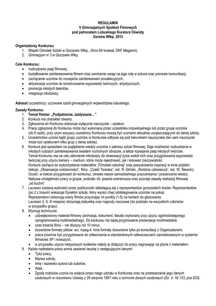 REGULAMIN V Gimnazjalnych Spotkań Filmowych pod patronatem Lubuskiego Kuratora Oświaty Gorzów Wlkp. 2015 Organizatorzy Konkursu: 1. Miejski Ośrodek Sztuki w Gorzowie Wlkp., (Kino 60 krzeseł, DKF Megaron). 2. Gimnazjum nr 3 w Gorzowie Wlkp. Cele Konkursu: rozbudzanie pasji filmowej, kształtowanie zainteresowania filmem oraz zwrócenie uwagi na jego rolę w sztuce oraz procesie komunikacji, zachęcenie uczniów do rozwijania zainteresowań pozalekcyjnych, aktywizacja uczniów do konstruowania wypowiedzi twórczych, artystycznych, promocja młodych talentów, integracja młodzieży. Adresat (uczestnicy): uczniowie szkół gimnazjalnych województwa lubuskiego. Zasady Konkursu: 1. Temat filmów: „Podpatrzone, zasłyszane…” 2. Konkurs ma charakter otwarty. 3. Zgłoszenia do Konkursu dokonuje wyłącznie nauczyciel – opiekun. 4. Praca zgłoszona do Konkursu może być wykonana przez uczestnika indywidualnego lub przez grupę uczniów (do 6 osób), przy czym wszyscy uczestnicy Konkursu muszą być uczniami aktualnie uczęszczającymi do danej szkoły. 5. Uczestnictwo ucznia bądź grupy uczniów w Konkursie odbywa się pod kierunkiem nauczyciela (ten sam nauczyciel może być opiekunem kilku grup z danej szkoły). 6. Konkurs jest sposobem na pogłębienie wiedzy uczniów z zakresu sztuki filmowej. Daje możliwość rozbudzenia w młodych ludziach zainteresowania światem ruchomych obrazów, a także rozwijania pasji młodych twórców. Temat Konkursu ma na celu skłonienie młodzieży do obserwacji życia wokół nich oraz przygotowania wypowiedzi twórczej przy użyciu kamery – medium, które może rejestrować, jak i kreować rzeczywistość. Konkurs zachęca do wykorzystania materiałów „Filmoteki szkolnej” oraz poszukiwania inspiracji w kinie polskim (lekcja: „Obserwacje codzienności”, filmy: „Cześć Tereska”, reż. R. Gliński, „Rodzina człowiecza”, reż. W. Ślesicki). Uczeń, w trakcie przygotowań do konkursu, utrwala nawyk samodzielnego poszukiwania i poszerzania wiedzy. Nabywa umiejętności pracy w grupie, podziału ról, pisania scenariusza oraz poznaje zasady realizacji filmowej „od kuchni”. 7. Laureaci zostaną wyłonieni przez publiczność składającą się z reprezentantów gorzowskich liceów. Reprezentantów (po 2 z liceum) wskazuje Dyrektor szkoły, który wyrazi chęć oddelegowania uczniów na pokaz. Reprezentanci dokonują oceny filmów przyznając im punkty (1-5) na kartach do głosowania. Laureaci (I, II, III miejsce) otrzymają statuetkę oraz nagrody rzeczowe (do podziału na wszystkich członków w przypadku grupy). 8. Wymogi techniczne: udźwiękowiony materiał filmowy (animacja, dokument, fabuła) wykonany przy użyciu ogólnodostępnego oprogramowania multimedialnego. Do konkursu nie będą przyjmowane prezentacje multimedialne, czas trwania filmu – nie dłuższy niż 10 minut, dozwolone formaty plików: avi, mpeg-4. Inne formaty dozwolone tylko po konsultacji z Organizatorami, praca powinna być przygotowana do odtworzenia w standardowych odtwarzaczach zainstalowanych w systemie Windows XP i nowszych, w przypadku użycia nietypowych kodeków należy je dołączyć do pracy nagrywając na płycie z materiałem. 9. Każda nadesłana praca winna zawierać teczkę z następującymi danymi: Tytuł pracy, Nazwa szkoły, Imię i nazwisko autora lub autorów, Wiek, Zgoda rodziców ucznia na wzięcie przez niego udziału w Konkursie oraz na przetwarzanie jego danych osobowych w rozumieniu Ustawy z 29 sierpnia 1997 roku o ochronie danych osobowych (Dz. U. Nr 133, poz.833). 10. Zgłoszona praca konkursowa winna być wynikiem pracy twórczej i nie naruszać autorskich praw osobistych lub majątkowych osób trzecich. 11. Prawa autorskie do pracy złożonej w konkursie nie mogą być niczym ograniczone. 12. Zgłaszający film zaspokoi wszelkie uzasadnione roszczenia wynikające z praw autorskich oraz innych praw wyłącznych osób trzecich, przez co zwolni Organizatorów z wszelkiej odpowiedzialności w tym zakresie. 13. O dopuszczeniu filmu do Konkursu decyduje powołana przez Organizatorów Komisja Konkursowa. Komisja ta sprawuje również nadzór nad prawidłowością przebiegu Konkursu. 14. Do Konkursu nie zostaną dopuszczone prace: - o wadliwej jakości technicznej, - przy zgłoszeniu których podano niekompletne lub nieprawdziwe dane, - dostarczone po terminie. Organizatorzy mogą nie przyjąć filmu lub wycofać go z Konkursu, jeśli ujawnią się jakiekolwiek okoliczności sprzeczne z niniejszym Regulaminem. Złożenie pracy konkursowej w terminie oznacza akceptację niniejszego Regulaminu. Nadesłane kopie nie będą zwracane. 15. Organizatorzy nie ponoszą odpowiedzialności za uszkodzenia pracy, które nastąpiły z przyczyn od nich niezależnych. 16. Organizatorzy nie ponoszą odpowiedzialności za prace, które nie dotarły do nich na skutek okoliczności od nich niezależnych. 17. Decyzje Organizatorów i Komisji Konkursowej są ostateczne, niepodważalne i niezaskarżalne. 18. Dane Uczestników Konkursu będą przetwarzane zgodnie z postanowieniami Ustawy o ochronie danych osobowych (Dz. U. z 1997 r. Nr 133, poz. 883 ze zm.). 19. Administratorem danych osobowych udostępnianych przez uczestników Konkursu będą Organizatorzy. 20. Dane tych osób przetwarzane będą przez podmiot działający na zlecenie Organizatora w rozumieniu art. 31 Ustawy o ochronie danych osobowych wyłącznie w celach związanych z organizacją niniejszego Konkursu. 21. Organizatorzy oraz fundatorzy nagród zastrzegają sobie prawo podania do publicznej wiadomości danych osobowych osób, które otrzymają nagrody w Konkursie. 22. Organizatorom przysługuje prawo publikowania informacji o nagrodzonych pracach w środkach masowego przekazu oraz internecie a także prawo wykorzystywania tych prac (publicznych, bezpłatnych projekcji a także utrwalania, wyświetlania, zamieszczania – we fragmentach lub całości – na stronach internetowych i