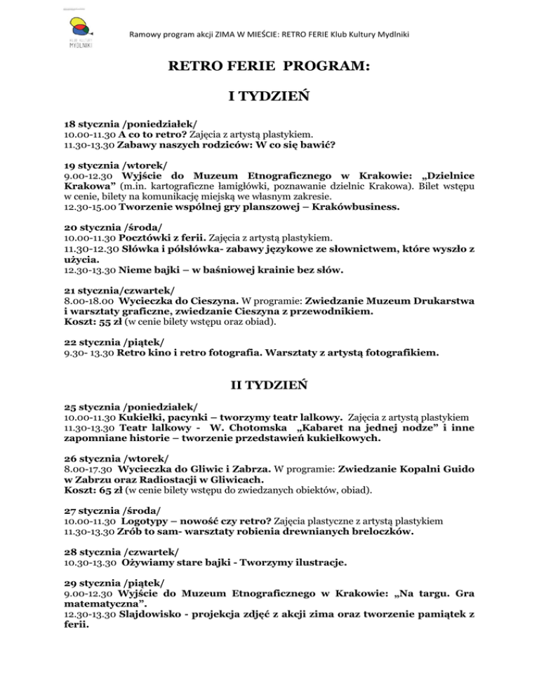 Ramowy program akcji ZIMA W MIEŚCIE: RETRO FERIE Klub Kultury Mydlniki RETRO FERIE PROGRAM: I TYDZIEŃ 18 stycznia /poniedziałek/ 10.00-11.30 A co to retro? Zajęcia z artystą plastykiem. 11.30-13.30 Zabawy naszych rodziców: W co się bawić? 19 stycznia /wtorek/ 9.00-12.30 Wyjście do Muzeum Etnograficznego w Krakowie: „Dzielnice Krakowa” (m.in. kartograficzne łamigłówki, poznawanie dzielnic Krakowa). Bilet wstępu w cenie, bilety na komunikację miejską we własnym zakresie. 12.30-15.00 Tworzenie wspólnej gry planszowej – Krakówbusiness. 20 stycznia /środa/ 10.00-11.30 Pocztówki z ferii. Zajęcia z artystą plastykiem. 11.30-12.30 Słówka i półsłówka- zabawy językowe ze słownictwem, które wyszło z użycia. 12.30-13.30 Nieme bajki – w baśniowej krainie bez słów. 21 stycznia/czwartek/ 8.00-18.00 Wycieczka do Cieszyna. W programie: Zwiedzanie Muzeum Drukarstwa i warsztaty graficzne, zwiedzanie Cieszyna z przewodnikiem. Koszt: 55 zł (w cenie bilety wstępu oraz obiad). 22 stycznia /piątek/ 9.30- 13.30 Retro kino i retro fotografia. Warsztaty z artystą fotografikiem. II TYDZIEŃ 25 stycznia /poniedziałek/ 10.00-11.30 Kukiełki, pacynki – tworzymy teatr lalkowy. Zajęcia z artystą plastykiem 11.30-13.30 Teatr lalkowy - W. Chotomska „Kabaret na jednej nodze” i inne zapomniane historie – tworzenie przedstawień kukiełkowych. 26 stycznia /wtorek/ 8.00-17.30 Wycieczka do Gliwic i Zabrza. W programie: Zwiedzanie Kopalni Guido w Zabrzu oraz Radiostacji w Gliwicach. Koszt: 65 zł (w cenie bilety wstępu do zwiedzanych obiektów, obiad). 27 stycznia /środa/ 10.00-11.30 Logotypy – nowość czy retro? Zajęcia plastyczne z artystą plastykiem 11.30-13.30 Zrób to sam- warsztaty robienia drewnianych breloczków. 28 stycznia /czwartek/ 10.30-13.30 Ożywiamy stare bajki - Tworzymy ilustracje. 29 stycznia /piątek/ 9.00-12.30 Wyjście do Muzeum Etnograficznego w Krakowie: „Na targu. Gra matematyczna”. 12.30-13.30 Slajdowisko - projekcja zdjęć z akcji zima oraz tworzenie pamiątek z ferii. Ramowy program akcji ZIMA W MIEŚCIE: RETRO FERIE Klub Kultury Mydlniki We wszystkie dni zapewniamy opiekę oraz zajęcia w formie gier i zabaw od 8.00 do 16.00 /poza wycieczkami – do 17.30 i 18.00/. KOSZT : 25 zł/ dzień. Możliwość wykupienia obiadów w cenie 8,50 zł. Zapisy do 15 stycznia 2016. ZAPISY NA WYCECZKI DO CIESZYNA I ZABRZA oraz na zajęcia: tel. 12 637 97 12 lub 533 356 008 e-mail: zapisy.mydlniki(at)dworek.eu