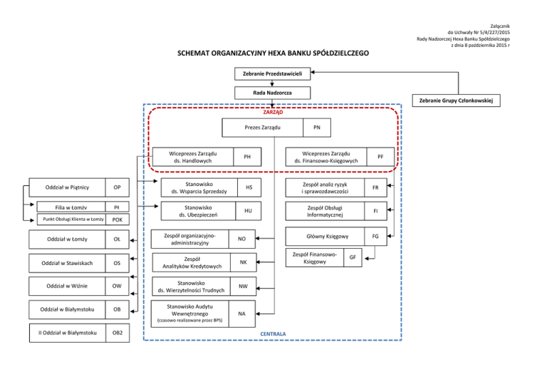 Załącznik do Uchwały Nr 5/4/227/2015 Rady Nadzorczej Hexa Banku Spółdzielczego z dnia 8 października 2015 r SCHEMAT ORGANIZACYJNY HEXA BANKU SPÓŁDZIELCZEGO Zebranie Przedstawicieli Rada Nadzorcza Zebranie Grupy Członkowskiej ZARZĄD Prezes Zarządu Wiceprezes Zarządu ds. Handlowych Oddział w Piątnicy Filia w Łomży Punkt Obsługi Klienta w Łomży OP PŁ POK Wiceprezes Zarządu ds. Finansowo-Księgowych PH HS Zespół analiz ryzyk i sprawozdawczości FR Stanowisko ds. Ubezpieczeń HU Zespół Obsługi Informatycznej FI Główny Księgowy FG OŁ Zespół organizacyjnoadministracyjny Oddział w Stawiskach OS Zespół Analityków Kredytowych NK Oddział w Wiźnie OW Stanowisko ds. Wierzytelności Trudnych NW Oddział w Białymstoku OB Stanowisko Audytu Wewnętrznego NO Zespół FinansowoKsięgowy NA (czasowo realizowane przez BPS) OB2 PF Stanowisko ds. Wsparcia Sprzedaży Oddział w Łomży II Oddział w Białymstoku PN CENTRALA GF ODDZIAŁ W PIĄTNICY Dyrektor Oddział w Piątnicy Stanowiska pracy ds. obsługi rachunków Filia w Łomży Stanowiska pracy ds. obsługi rachunków Stanowiska pracy obsługi kasowej Stanowiska pracy obsługi kasowej Stanowiska pracy ds. obsługi kredytów Punkt Obsługi Klienta w Łomży Stanowiska pracy ds. obsługi kasowej oraz rachunków ODDZIAŁ W STAWISKACH Dyrektor Stanowiska pracy ds. obsługi rachunków Stanowiska pracy ds. obsługi kredytów Stanowiska pracy obsługi kasowej ODDZIAŁ W WIŹNIE Dyrektor Stanowiska pracy ds. obsługi rachunków Stanowiska pracy ds. obsługi kredytów Stanowiska pracy obsługi kasowej ODDZIAŁ W ŁOMŻY Dyrektor Doradcy Klienta z funkcją kasjera Doradcy Klienta - Analityk kredytowy ODDZIAŁ W BIAŁYMSTOKU Dyrektor Doradcy Klienta z funkcją kasjera Doradcy Klienta - Analityk kredytowy II ODDZIAŁ W BIAŁYMSTOKU Dyrektor Doradcy Klienta z funkcją kasjera Doradcy Klienta - Analityk kredytowy