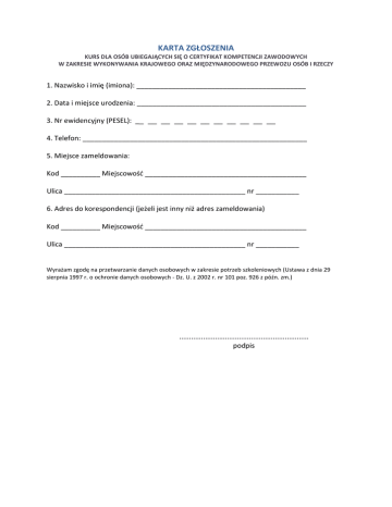 KARTA ZGŁOSZENIA KURS DLA OSÓB UBIEGAJĄCYCH SIĘ O CERTYFIKAT KOMPETENCJI ZAWODOWYCH W ZAKRESIE WYKONYWANIA KRAJOWEGO ORAZ MIĘDZYNARODOWEGO PRZEWOZU OSÓB I RZECZY 1. Nazwisko i imię (imiona): ___________________________________________ 2. Data i miejsce urodzenia: ___________________________________________ 3. Nr ewidencyjny (PESEL): __ __ __ __ __ __ __ __ __ __ __ 4. Telefon: _________________________________________________________ 5. Miejsce zameldowania: Kod __________ Miejscowość _________________________________________ Ulica ______________________________________________ nr ___________ 6. Adres do korespondencji (jeżeli jest inny niż adres zameldowania) Kod __________ Miejscowość _________________________________________ Ulica ______________________________________________ nr ___________ Wyrażam zgodę na przetwarzanie danych osobowych w zakresie potrzeb szkoleniowych (Ustawa z dnia 29 sierpnia 1997 r. o ochronie danych osobowych - Dz. U. z 2002 r. nr 101 poz. 926 z późn. zm.) ................................................................. podpis