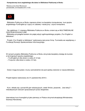 Komputerowy kurs angielskiego dla dzieci w Bibliotece Publicznej w Broku Wpisany przez Ewa Młynarczuk poniedziałek, 23 listopada 2015 14:52 Biblioteka Publiczna w Broku zaprasza dzieci na bezpłatny komputerowy kurs języka angielskiego FunEnglish.pl. Łączy on zabawę i naukę przy użyciu komputera. Na najbliższe 11 miesięcy Biblioteka Publiczna w Broku zmieni się w MULTIMEDIALNE CENTRUM EDUKACYJNE. Biblioteka przystąpiła bowiem do piątej edycji ogólnopolskiego projektu „Fun English w bibliotece”. Projekt „Fun English w bibliotece” realizowany jest przez firmę Funmedia we współpracy z Fundacją Rozwoju Społeczeństwa Informacyjnego. W ramach projektu Biblioteka Publiczna w Broku otrzymała bezpłatny dostęp do kursów e-lerningowych języka angielskiego: – FunEnglish.pl (dla dzieci w wieku 6-12 lat) – Funjunior (dla dzieci w wieku 4-5 lat). Dzieci mogą korzystać z kursu samodzielnie lub pod opieką rodziców w naszej bibliotece. Projekt będzie realizowany do 31 października 2016 r. Kurs składa się z ponad 60 gier edukacyjnych, setek filmów, piosenek, „foto-lekcji” i interaktywnych ćwiczeń opracowanych przez ekspertów. Internetowy kurs funenglish.pl jako pierwszy w Polsce otrzymał akceptację Ministerstwa Edukacji Narodowej. 1/2 Komputerowy kurs angielskiego dla dzieci w Bibliotece Publicznej w Broku Wpisany przez Ewa Młynarczuk poniedziałek, 23 listopada 2015 14:52 Zobacz wersję próbną: http://funenglish.pl/funbook Ilość miejsc jest ograniczona! Decyduje kolejność zgłoszeń. Informacje na temat kursu komputerowego funenglish.pl: Biblioteka Publiczna w Broku ul. Pułtuska 22 07-306 Brok 29 745 75 01 e-mail: [email protected] 2/2