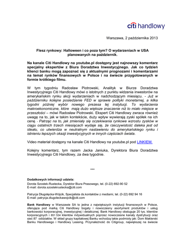 Warszawa, 2 października 2013 Flesz rynkowy: Halloween i co poza tym? O wydarzeniach w USA planowanych na październik. Na kanale Citi Handlowy na youtube.pl dostępny jest najnowszy komentarz specjalny ekspertów z Biura Doradztwa Inwestycyjnego. Jak co tydzień klienci banku mogą zapoznać się z aktualnymi prognozami i komentarzami na temat rynków finansowych w Polsce i na świecie przygotowanych w formie krótkiego filmu. W tym tygodniu Radosław Piotrowski, Analityk w Biurze Doradztwa Inwestycyjnego Citi Handlowy mówi o istotnych z punktu widzenia inwestorów na amerykańskim rynku akcji wydarzeniach w nadchodzącym miesiącu. - Już w październiku kolejne posiedzenie FED w sprawie polityki monetarnej, a kilka tygodni później wybór nowego prezesa tej instytucji. To wydarzenia makroekonomiczne, które mają dużo większe znaczenie niż to miało miejsce w przeszłości – mówi Radosław Piotrowski. Ekspert Citi Handlowy zwraca również uwagę na to, jak w takim kontekście, duży wpływ wywierają zyski spółek na ich cenę. - Patrząc na to, jak zmieniały się oczekiwania rynkowe wzrostu zysków w ciągu ostatnich trzech miesiącach wydaje się, że rzeczywistość daleka jest od ideału, co utwierdza w neutralnym nastawieniu do amerykańskiego rynku i istnieniu lepszych okazji inwestycyjnych w innych częściach świata. Video materiał dostępny na kanale Citi Handlowy na youtube.pl pod LINKIEM. Kolejny komentarz, tym razem Jacka Janiuka, Dyrektora Biura Doradztwa Inwestycyjnego Citi Handlowy, za dwa tygodnie. *** Dodatkowych informacji udziela: Dorota Szostek-Rustecka, Dyrektor Biura Prasowego, tel. (0-22) 692-90 52 E-mail: [email protected] Patrycja Długołęcka-Wójcik, Specjalista ds.kontaktów z mediami, tel. (0-22) 692 94 16 E-mail: [email protected] Bank Handlowy w Warszawie SA to jedna z największych instytucji finansowych w Polsce, oferująca pod marką Citi Handlowy bogaty i nowoczesny asortyment produktów i usług bankowości korporacyjnej, inwestycyjnej i detalicznej. Bank Handlowy obsługuje 20 tys. klientów korporacyjnych i 851 534 klientów indywidualnych poprzez nowoczesne kanały dystrybucji oraz sieć 87 oddziałów. W skład grupy kapitałowej Banku wchodzą takie podmioty jak: Dom Maklerski Banku Handlowego i Handlowy Leasing. Przynależność do Citigroup, największej na świecie instytucji finansowej, zapewnia klientom Banku Handlowego dostęp do usług finansowych w ponad 100 krajach. Dodatkowe informacje można uzyskać na stronie internetowej www.citihandlowy.pl. Citi (NYSE:C) to wiodąca globalna instytucja finansowa, mająca około 200 milionów klientów w ponad 140 krajach. Poprzez swoje dwie odrębne jednostki operacyjne: Citicorp i Citi Holdings, Citi obsługuje klientów indywidualnych, korporacyjnych, rządowych i instytucjonalnych zapewniając im bogaty wachlarz produktów i usług finansowych w zakresie bankowości detalicznej, bankowości korporacyjnej i inwestycyjnej, usług maklerskich i zarządzania aktywami. Dodatkowe informacje można uzyskać na stronie internetowej www.citigroup.com lub or www.citi.com.
