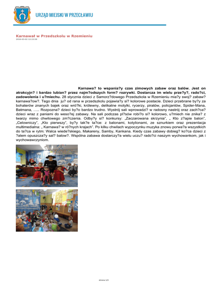 Karnawał w Przedszkolu w Rzemieniu 2016-03-02 12:15:58 Karnawa? to wspania?y czas zimowych zabaw oraz balów. Jest on atrakcyjn? i bardzo lubian? przez najm?odszych form? rozrywki. Dostarcza im wielu prze?y?, rado?ci, zadowolenia i u?miechu. 28 stycznia dzieci z Samorz?dowego Przedszkola w Rzemieniu mia?y swoj? zabaw? karnawa?ow?. Tego dnia ju? od rana w przedszkolu pojawia?y si? kolorowe postacie. Dzieci przebrane by?y za bohaterów znanych bajek oraz wró?ki, królewny, delikatne motylki, rycerzy, piratów, policjantów, Spider-Mana, Batmana, ….. Rozpozna? dzieci by?o bardzo trudno. Wystrój sali wprowadzi? w radosny nastrój oraz zach?ca? dzieci wraz z paniami do weso?ej zabawy. Na sali podczas pl?sów robi?o si? kolorowo, u?miech nie znika? z twarzy mimo chwilowego zm?czenia. Odby?y si? konkursy: „Zaczarowana skrzynia”, „ Kto z?apie balon”, „Celowniczy”, „Kto pierwszy”, by?y tak?e ta?ce: z balonami, kotylionami, ze sznurkiem oraz prezentacja multimedialna: „ Karnawa? w ró?nych krajach”. Po kilku chwilach wypoczynku muzyka znowu porwa?a wszystkich do ta?ca w rytm: Walca wiede?skiego, Makareny, Samby, Kankana. Kiedy czas zabawy dobieg? ko?ca dzieci z ?alem opuszcza?y sal? balow?. Wspólna zabawa dostarczy?a wielu uczu? rado?ci naszym wychowankom, jak i wychowawczyniom. strona 1/3 strona 2/3 Dziękujemy za odwiedziny i zapraszamy ponownie bezpośredni link do strony www strona 3/3 Powered by TCPDF (www.tcpdf.org)
