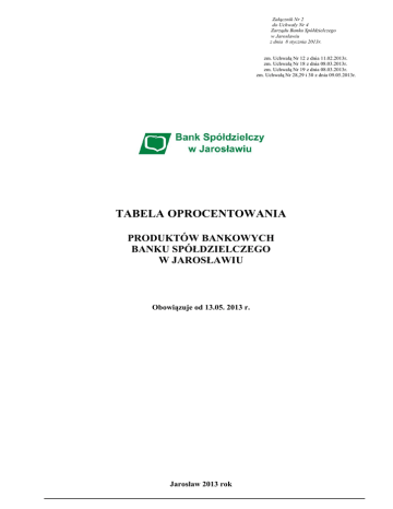 Załącznik Nr 2 do Uchwały Nr 4 Zarządu Banku Spółdzielczego w Jarosławiu z dnia 8 stycznia 2013r. zm. Uchwałą Nr 12 z dnia 11.02.2013r. zm. Uchwałą Nr 18 z dnia 08.03.2013r. zm. Uchwałą Nr 19 z dnia 08.03.2013r. zm. Uchwałą Nr 28,29 i 30 z dnia 09.05.2013r. TABELA OPROCENTOWANIA PRODUKTÓW BANKOWYCH BANKU SPÓŁDZIELCZEGO W JAROSŁAWIU Obowiązuje od 13.05. 2013 r. Jarosław 2013 rok Spis treści: CZĘŚĆ I. KLIENCI INDYWIDUALNI…………………………………………………………………………….………………………………………..………….3 Rozdział I. Konta osobiste…………………………………………………………………………………….……………………………………………..……………3 Rozdział II. Oszczędności………………………………………………………………………………………………………………………………………….……..3 Rozdział III. Karty kredytowe……………………………………………………………………………………………………………………………………....…….4 Rozdział IV. Kredyty…………………………………………………………………………………………………………………………….………………....….…..4 CZĘŚĆ II. KLIENCI INSTYTUCJONALNI…..……………………………………………………..……………………………..……………………….…...…….5 Rozdział I. Rachunki………………………………………………………………….………………………………………………………………………….………5 Rozdział II. Lokaty ………………………………………………………………………………………………………………………………………….….….……..6 Rozdział III. Karty kredytowe ………………………………………………………………………………………………………………………………….………...7 Rozdział IV. Kredyty …………………………………………………………………………………………………..……………………..…………………..…..…...7 CZĘŚĆ III. INNE…………………………………………………………………………………………………….………………..…………………….…………..9 Rozdział I. PRODUKTY WYCOFANE Z OFERTY –Klient indywidualny……………………………………..………………………………………………………9 Rozdział II. PRODUKTY WYCOFANE Z OFERTY –Klient instytucjonalny……………………………………………………………………..……….………….12 2 CZĘŚĆ I. KLIENCI INDYWIDUALNI Rozdział I. KONTA OSOBISTE TAB. 1 Rachunki oszczędnościowo-rozliczeniowe Lp. Rodzaj rachunku1) 1. 2. 3. 4. 5. 6. 7. 1) 2) Oprocentowanie zmienne 0,01% 0,01% 0,01% 0,01% 0,01% 0,01% 0,01% POL-Konto Optymalne POL-Konto VIP e- POL-Konto Konto Standard Konto Młodzieżowe POL-Konto Junior2) POL-Konto Student2) Odsetki kapitalizowane są kwartalnie Rachunki w ofercie do dnia 23.10.2012r. TAB. 2 Rachunki oszczędnościowe płatne na każde żądanie w walutach wymienialnych oprocentowanie Rodzaj rachunku zmienne USD EUR Rachunki oszczędnościowe płatne na każde żądanie w 0,15% 0,15% walutach wymienialnych GBP 0,15% Rozdział II. OSZCZĘDNOŚCI TAB. 1 Rachunki oszczędnościowe Lp. Rodzaj rachunku 1. Rachunek oszczędnościowy POL-Zysk1) 1.1 0 - 9 999,99 PLN 1.2 10 000 – 19 999,99 PLN 1.3 20 000 - 49 999,99 PLN 1.4 50 000 - 99 999,99 PLN 1.5 powyżej 100 000 PLN Oprocentowanie zmienne 2,50%* 1,50% 2,70%* 1,60% 2,80%* 1,80% 3,10%* 2,00% 3,30%* 2,20% 1) Odsetki kapitalizowane są co miesiąc. Oprocentowanie obowiązuje do dnia 31.07.2013r. dla rachunków założonych do dnia 11.05.2013r. TAB. 1a Oprocentowanie zmienne Lp. Rodzaj rachunku * Rachunek oszczędnościowy POL-IKE1) 1. 5,60%* 4,50% 1) * Odsetki kapitalizowane są na koniec każdego roku. Oprocentowanie obowiązuje do dnia 31.07.2013r. dla rachunków założonych do dnia 11.05.2013r. TAB. 2 Lokata terminowa STANDARD w złotych1) Lp. Rodzaj lokaty Minimalna kwota 1. 2. 3. 4. 5. 6. 7. 8. 1) 1 miesięczna 2 miesięczna 3 miesięczna 1 000 PLN 6 miesięczna 9 miesięczna 12 miesięczna 24 miesięczna 36 miesięczna Odsetki kapitalizowane są w dniu zapadalności lokaty. Oprocentowanie stałe do 50 tyś. zł. 2,00% 2,20% 2,60% 3,00% 3,30% 3,50% 3,70% 4,00% powyżej 50 000 zł. 2,20% 2,40% 2,80% 3,20% 3,50% 3,70% 3,90% 4,20% 3 TAB. 2a Lokata terminowa STANDARD w złotych1) Lp. Rodzaj lokaty Minimalna kwota Oprocentowanie zmienne do 50 000 zł. 5. 9 miesięczna 6. 12 miesięczna 7. 24 miesięczna 8. 36 miesięczna powyżej 50 000 zł. 3,60%* 3,50% 4,10%* 3,70% 4,70%* 3,90% 5,50%* 4,20% 3,30% 3,70%* 3,50% 4,30%* 3,70% 5,00%* 4,00% 1 000 PLN 1) * Odsetki kapitalizowane są w dniu zapadalności lokaty. Oprocentowanie obowiązuje do dnia 30.06.2013r. dla lokat założonych lub odnowionych do dnia 11.05.2013r. TAB. 3 Lokata terminowa STANDARD w walutach wymienialnych1) Lp. 1. 2. 3. 4. 1) Rodzaj lokaty Minimalna kwota 1 miesięczna 3 miesięczna 1 000 USD/EUR/GBP 6 miesięczna 12 miesięczna Odsetki kapitalizowane są w dniu zapadalności lokaty. TAB.4 Lokata progresywna Miesiąc 1 2 3 4 5 oprocentowanie zmienne EUR 0,30% 0,45% 0,60% 1,00% zmienne USD 0,20% 0,35% 0,60% 0,80% 6 7 8 9 zmienne GBP 0,30% 0,45% 0,60% 1,00% 10 11 12 Oprocentowanie1 2,0% 2,1% 2,2% 2,4% 2,6% 2,8% 3,0% 3,2% 3,4% 4,0% 5,0% 6,0% Stopa stała 1) Oprocentowanie lokaty jest progresywne, tzn. wysokość stóp procentowych obowiązujących w poszczególnych miesiącach wzrasta z upływem każdego kolejnego pełnego miesiąca utrzymania lokaty. Kwota minimalna lokaty wynosi: 1 000 PLN Średnie efektywne oprocentowanie – 