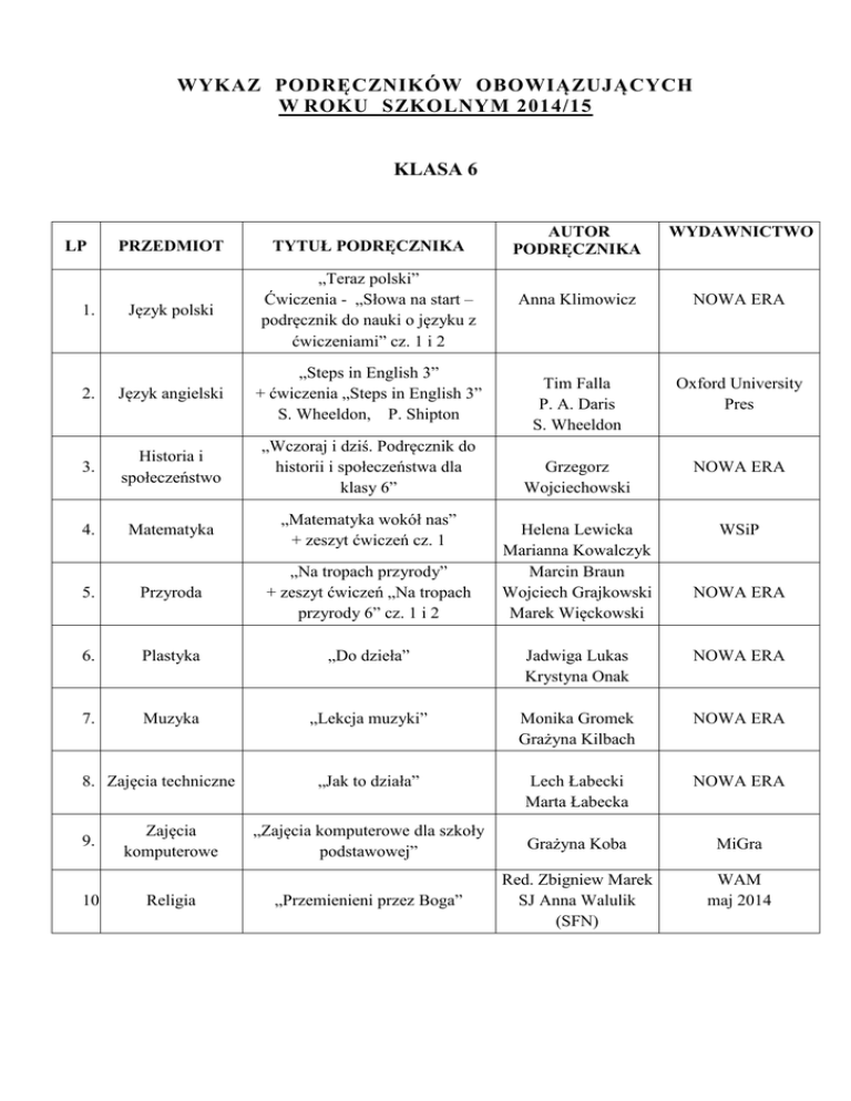 wykaz podręczników obowiązujących w roku szkolnym 2014
