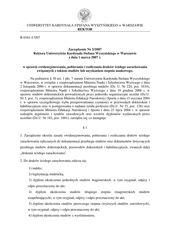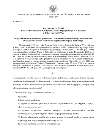 UNIWERSYTET KARDYNAŁA STEFANA WYSZYŃSKIEGO w WARSZAWIE REKTOR R-0161-I-5/07 Zarządzenie Nr 5/2007 Rektora Uniwersytetu Kardynała Stefana Wyszyńskiego w Warszawie z dnia 1 marca 2007 r. w sprawie ewidencjonowania, pobierania i rozliczania druków ścisłego zarachowania związanych z tokiem studiów lub uzyskaniem stopnia naukowego. Na podstawie § 38 ust. 1 pkt 7 statutu Uniwersytetu Kardynała Stefana Wyszyńskiego w Warszawie, w związku z rozporządzeniem Ministra Nauki i Szkolnictwa Wyższego z dnia 2 listopada 2006 r. w sprawie dokumentacji przebiegu studiów (Dz. U. Nr 224, poz. 1634), rozporządzeniem Ministra Nauki i Szkolnictwa Wyższego z dnia 19 grudnia 2006 r. w sprawie studiów doktoranckich prowadzonych przez jednostki organizacyjne uczelni (Dz.U. Nr 1, poz. 3), rozporządzeniem Ministra Edukacji Narodowej i Sportu z dnia 15 stycznia 2004 r. w sprawie szczegółowego trybu przeprowadzania czynności w przewodach doktorskim i habilitacyjnym oraz w postępowaniu o nadanie tytułu profesora (Dz.U. Nr 15, poz. 128) oraz rozporządzeniem Ministra Edukacji Narodowej i Sportu z dnia 23 lipca 2004 r. w sprawie rodzajów dyplomów i tytułów zawodowych oraz wzorów dyplomów wydawanych przez uczelnie (Dz.U. Nr 182, poz. 1881), zarządza się, co następuje: §1 1. Zarządzenie określa zasady ewidencjonowania, pobierania i rozliczania druków ścisłego zarachowania zaliczanych do dokumentacji przebiegu studiów oraz dokumentów dotyczących przebiegu studiów doktoranckich, przewodów doktorskich i habilitacyjnych, zwanych dalej „drukami ścisłego zarachowania”. 2. Do druków ścisłego zarachowania zalicza się: 1) indeks; 2) legitymację studencką; 3) dyplom ukończenia jednolitych studiów magisterskich, w tym oryginał, odpisy i odpis przeznaczony do akt; 4) dyplom ukończenia studiów drugiego stopnia (magisterskich studiów uzupełniających), w tym oryginał, odpisy i odpis przeznaczony do akt; 5) dyplom ukończenia studiów pierwszego stopnia (wyższych studiów zawodowych), w tym oryginał, odpisy i odpis przeznaczony do akt; 6) dyplom ukończenia studiów z wyróżnieniem; 7) odpis dyplomu ukończenia studiów wyższych w języku angielskim, niemieckim, francuskim, rosyjskim, hiszpańskim; 8) świadectwo ukończenia studiów podyplomowych w tym oryginał, odpis, odpis i egzemplarz do akt; 9) legitymację doktoranta; 10) indeks doktoranta; 11) świadectwo ukończenia studiów doktoranckich; 10) dyplom doktora, w tym oryginał, odpis i odpis do akt; 11) odpis dyplomu doktora w języku angielskim, niemieckim, francuskim, rosyjskim, hiszpańskim; 12) dyplom doktora habilitowanego, w tym oryginał, odpis i odpis do akt; 13) odpis dyplomu doktora habilitowanego w języku angielskim, niemieckim, francuskim, rosyjskim, hiszpańskim. §2 1. Część B dyplomu ukończenia studiów – Suplement jest wydawany na specjalnym papierze pokrytym giloszem. 2. Papier zadrukowany giloszem, nie jest drukiem ścisłego zarachowania, ale jego wykorzystanie podlega rozliczeniu zgodnie ze wzorem określonym w załączniku nr 1. Papier (w ryzach po 500 szt.) jest pobierany z Biura ds. Kształcenia UKSW na podstawie zamówienia wystawionego przez osoby upoważnione w dziekanacie. §3 1. Za zamawianie druków zgodnych ze wzorami określonymi w przepisach prawa odpowiedzialny jest pracownik Biura ds. Kształcenia, któremu na piśmie powierzono obowiązki prowadzenia gospodarki magazynowej tymi drukami. 2. Zamawianie druków wymienionych § 1 odbywa się z zachowaniem procedur obowiązujących w UKSW w zakresie zamówień publicznych. §4 1. Dostarczone druki podlegają wpisaniu, jako przychód, w ewidencji druków ścisłego zarachowania na podstawie otrzymanych faktur i dokumentów przewozowych lub dowodu dostawy. 2. Ewidencję druków ścisłego zarachowania prowadzi się odrębnie dla każdego rodzaju druków. §5 1. Pracownik Biura ds. Kształcenia wydaje druki upoważnionym pracownikom dziekanatów na podstawie pisemnej zgody Kanclerza UKSW. Pracownikowi, który pobiera druki ścisłego zarachowania, wpisuje się w zakres obowiązków pobieranie i rozliczanie druków ścisłego zarachowania. 2. Upoważnieni pracownicy Dziekanatów pobierają druki w ilościach przez nich wskazanych na formularzu zamówień stanowiącym załącznik nr 2 do zarządzenia i za potwierdzeniem odbioru w ewidencji druków ścisłego zarachowania. 3. Wydanie druków upoważnionym pracownikom podlega ewidencji księgowej na podstawie miesięcznych rozliczeń sporządzanych przez Biuro ds. Kształcenia według wzoru stanowiącego załącznik nr 3. 4. Pracownicy dziekanatów są zobowiązani do sukcesywnego rozliczenia się z pobranych druków. 5. Rozliczenie pobranych druków następuje sukcesywnie przy zamówieniu kolejnej partii druków na podstawie załącznika nr 4 do zarządzenia. Do załącznika załącza się listę studentów, którym wydano dane druki. 6. Fakt rozliczenia z pobranych partii druków zostaje odnotowany w ewidencji druków ścisłego zarachowania w Biurze ds. Kształcenia. 7. Pracownicy dziekanatów są zobowiązani do sporządzenia rocznego rozliczenia pobranych druków według formularza stanowiącego załącznik nr 5 do zarządzenia. Formularz ten składa się do dnia 5 stycznia każdego roku do Biura ds. Kształcenia. §6 1. Druki uszkodzone lub błędnie wypełnione należy sukcesywnie zwracać do Biura ds. Kształcenia za pokwitowaniem, przy każdym kolejnym zamówieniu na druki, na podstawie protokołu zwrotu druków stanowiącego załącznik nr 6 do zarządzenia. 2. Przepis ust. 1 nie dotyczy arkuszy na Suplement - błędnie wypełnione i anulowane arkusze podlegają zniszczeniu w niszczarce, a protokół zniszczenia zawierający liczbę zniszczonych arkuszy należy przekazać do Biura ds. Kształcenia. 3. Fakt zwrotu druków zostaje odnotowany w ewidencji druków ścisłego zarachowania. 4. Zniszczenia druków uszkodzonych lub błędnie wypełnionych dokonuje komisja powołana