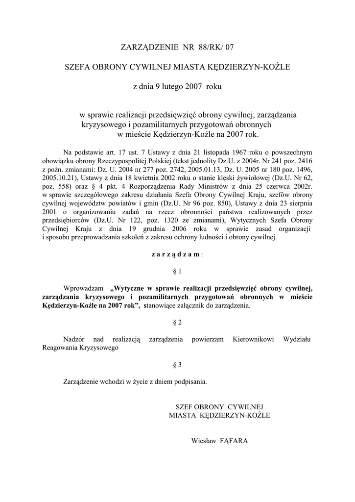 ZARZĄDZENIE NR 88/RK/ 07 SZEFA OBRONY CYWILNEJ MIASTA KĘDZIERZYN-KOŹLE z dnia 9 lutego 2007 roku w sprawie realizacji przedsięwzięć obrony cywilnej, zarządzania kryzysowego i pozamilitarnych przygotowań obronnych w mieście Kędzierzyn-Koźle na 2007 rok. Na podstawie art. 17 ust. 7 Ustawy z dnia 21 listopada 1967 roku o powszechnym obowiązku obrony Rzeczypospolitej Polskiej (tekst jednolity Dz.U. z 2004r. Nr 241 poz. 2416 z poźn. zmianami: Dz. U. 2004 nr 277 poz. 2742, 2005.01.13, Dz. U. 2005 nr 180 poz. 1496, 2005.10.21), Ustawy z dnia 18 kwietnia 2002 roku o stanie klęski żywiołowej (Dz.U. Nr 62, poz. 558) oraz § 4 pkt. 4 Rozporządzenia Rady Ministrów z dnia 25 czerwca 2002r. w sprawie szczegółowego zakresu działania Szefa Obrony Cywilnej Kraju, szefów obrony cywilnej województw powiatów i gmin (Dz.U. Nr 96 poz. 850), Ustawy z dnia 23 sierpnia 2001 o organizowaniu zadań na rzecz obronności państwa realizowanych przez przedsiębiorców (Dz.U. Nr 122, poz. 1320 ze zmianami), Wytycznych Szefa Obrony Cywilnej Kraju z dnia 19 grudnia 2006 roku w sprawie zasad organizacji i sposobu przeprowadzania szkoleń z zakresu ochrony ludności i obrony cywilnej. zarządzam: §1 Wprowadzam „Wytyczne w sprawie realizacji przedsięwzięć obrony cywilnej, zarządzania kryzysowego i pozamilitarnych przygotowań obronnych w mieście Kędzierzyn-Koźle na 2007 rok”, stanowiące załącznik do zarządzenia. §2 Nadzór nad realizacją Reagowania Kryzysowego zarządzenia powierzam Kierownikowi §3 Zarządzenie wchodzi w życie z dniem podpisania. SZEF OBRONY CYWILNEJ MIASTA KĘDZIERZYN-KOŹLE Wiesław FĄFARA Wydziału URZĄD MIASTA KĘDZIERZYN-KOŹLE WYDZIAŁ REAGOWANIA KRYZYSOWEGO RK.5326-3/07 WYTYCZNE SZEFA OBRONY CYWILNEJ MIASTA W ZAKRESIE REALIZACJI PRZEDSIĘWZIĘĆ OBRONY CYWILNEJ, ZARZĄDZANIA KRYZYSOWEGO I POZAMILITARNYCH PRZYGOTOWAŃ OBRONNYCH W MIEŚCIE KĘDZIERZYN-KOŹLE NA 2007 ROK. KĘDZIERZYN-KOŹLE 2007 ROK Załącznik Nr 1 do Zarządzenia Nr 88/RK/07 r. Szefa OC Miasta z dnia 9 lutego 2007 r. WYTYCZNE SZEFA OBRONY CYWILNEJ MIASTA W ZAKRESIE REALIZACJI PRZEDSIĘWZIĘĆ OBRONY CYWILNEJ, ZARZĄDZANIA KRYZYSOWEGO I POZAMILITARNYCH PRZYGOTOWAŃ OBRONNYCH W MIEŚCIE KĘDZIERZYN-KOŹLE NA 2007 ROK. Uwzględniając zakres zadań zawartych w § 3 Rozporządzenia Rady Ministrów z dnia 25 czerwca 2002 roku w sprawie szczegółowego zakresu działania szefa obrony cywilnej kraju, szefów obrony cywilnej województw, powiatów i gmin (Dz. U. Nr 96 poz. 850), oraz osiągnięte w 2006 roku wyniki w działalności na rzecz systemu ochrony ludności i ratownictwa, w celu zapewnienia niezbędnego poziomu realizacji zadań z zakresu obrony cywilnej na terenie miasta Kędzierzyn-Koźle należy: w zakresie organizacyjno-prawnym 1. Zapewnić realizację zadań obrony cywilnej określonych w przepisach prawnych. 2. Dokonać oceny stanu przygotowań obrony cywilnej i opracować roczne oraz wieloletnie plany działania w zakresie obrony cywilnej. 3. Ustalić ilość i rodzaj formacji obrony cywilnej do prowadzenia przygotowań i realizacji przedsięwzięć obrony cywilnej. 4. Wypracować na szczeblu zakładu pracy rozwiązania systemowe w zakresie ochrony ludności i obrony cywilnej a w szczególności: - potrzeby i wzajemne relacje zadań w zakresie ochrony ludności i obrony cywilnej; - udział w wykonywaniu zadań na rzecz ochrony ludności i obrony cywilnej; - propozycje dostosowania formacji obrony cywilnej do potrzeb i możliwości z uwzględnieniem zagrożeń czasu pokoju i wojny; - zasady przygotowywania i prowadzenia szkoleń, ćwiczeń i treningów z zakresu ochrony ludności i obrony cywilnej, - planowania zasobów oraz sposobu zaopatrywania organów i formacji obrony cywilnej w sprzęt i środki niezbędne do realizacji zadań w czasie wojny; - zasady finansowania zadań z zakresu ochrony ludności i obrony cywilnej; w zakresie planowania obrony cywilnej i ratownictwa 1. Na bieżąco aktualizować plany obrony cywilnej 2. Utrzymywać w stałej aktualności dokumentację Ewakuacji i Przyjęcia Ludności. 3. Określić możliwości i przygotować podstawy do tworzenia formacji obrony cywilnej realizujących w czasie pokoju zadania z zakresu ochrony ludności, a w czasie wojny zadania obrony cywilnej. 4. Na bieżąco aktualizować stan ilościowy i jakościowy zespołów i formacji obrony cywilnej z uwzględnieniem oceny zagrożenia, możliwości ukompletowania stanem osobowym i planu użycia sił i środków. 5. Na bieżąco aktualizować bazy danych sił i sprzętu ratowniczego oraz infrastruktury logistycznej. w zakresie wykrywania zagrożeń i alarmowania 1. Doskonalić funkcjonowanie systemu wykrywania i alarmowania oraz wczesnego ostrzegania poprzez udział w szkoleniach i treningach. 2. Przeprowadzić analizę i dokonać oceny przygotowania systemu wykrywania i ostrzegania przed skażeniami i zakażeniami. 3. Doskonalić procedury ostrzegania i alarmowania ludności. 4. Opracować materiały dotyczące procedur alarmowania i ostrzegania ludności o zagrożeniach w zakresie ochrony przed powodzią oraz skutkami intensywnych opadów śniegu. w zakresie łączności 1. Prowadzić szkolenia dla operatorów urządzeń radiotelefonicznych. 2. Przeprowadzić przeglądy okresowe urządzeń radiotelefonicznych. 3. Zapewnić organizacyjne warunki do współpracy z Gminnym Centrum Reagowania, służbami powiatowymi i innymi jednostkami organizacyjnymi. 4. Na podstawie analizy zagrożeń, przygotować prognozy i zasięg ich występowania oraz prawdopodobne skutki zagrożeń. 5. Doskonalić stopień wyszkolenia pracowników realizujących zadania z zakresu obrony cywilnej. w zakresie szkolenia i upowszechniania 1. Realizować wytyczne Szefa Obrony Cywilnej Kraju z dnia 19 grudnia 2006 r. w sprawie zasad organizacji i sposobów szkolenia z zakresu ochrony ludności i obrony cywilnej, pracowników i Kadry Kierowniczej OC w zakładzie pracy. 2. Systematycznie realizować szkolenia podsta