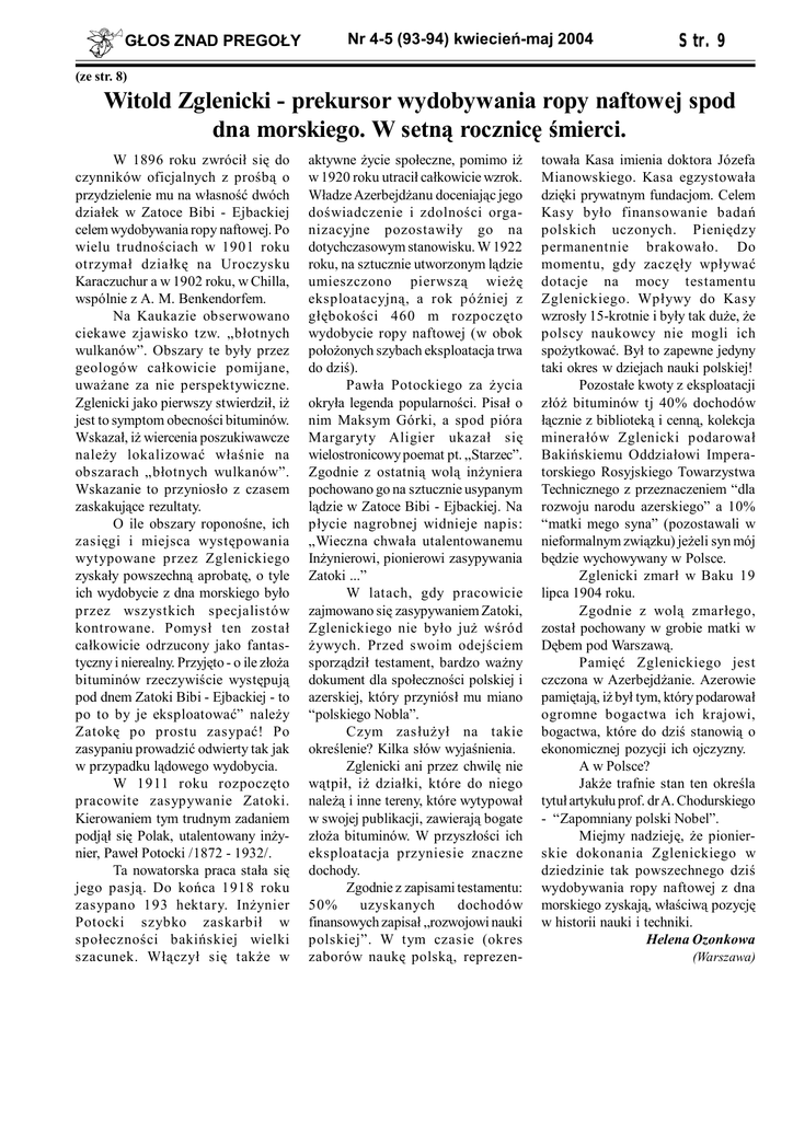 GŁOS ZNAD PREGOŁY Nr 4-5 (93-94) kwiecień-maj 2004 Str. 9 (ze str. 8) Witold Zglenicki - prekursor wydobywania ropy naftowej spod dna morskiego. W setną rocznicę śmierci. W 1896 roku zwrócił się do czynników oficjalnych z prośbą o przydzielenie mu na własność dwóch działek w Zatoce Bibi - Ejbackiej celem wydobywania ropy naftowej. Po wielu trudnościach w 1901 roku otrzymał działkę na Uroczysku Karaczuchur a w 1902 roku, w Chilla, wspólnie z A. M. Benkendorfem. Na Kaukazie obserwowano ciekawe zjawisko tzw. „błotnych wulkanów”. Obszary te były przez geologów całkowicie pomijane, uważane za nie perspektywiczne. Zglenicki jako pierwszy stwierdził, iż jest to symptom obecności bituminów. Wskazał, iż wiercenia poszukiwawcze należy lokalizować właśnie na obszarach „błotnych wulkanów”. Wskazanie to przyniosło z czasem zaskakujące rezultaty. O ile obszary roponośne, ich zasięgi i miejsca występowania wytypowane przez Zglenickiego zyskały powszechną aprobatę, o tyle ich wydobycie z dna morskiego było przez wszystkich specjalistów kontrowane. Pomysł ten został całkowicie odrzucony jako fantastyczny i nierealny. Przyjęto - o ile złoża bituminów rzeczywiście występują pod dnem Zatoki Bibi - Ejbackiej - to po to by je eksploatować” należy Zatokę po prostu zasypać! Po zasypaniu prowadzić odwierty tak jak w przypadku lądowego wydobycia. W 1911 roku rozpoczęto pracowite zasypywanie Zatoki. Kierowaniem tym trudnym zadaniem podjął się Polak, utalentowany inżynier, Paweł Potocki /1872 - 1932/. Ta nowatorska praca stała się jego pasją. Do końca 1918 roku zasypano 193 hektary. Inżynier Potocki szybko zaskarbił w społeczności bakińskiej wielki szacunek. Włączył się także w aktywne życie społeczne, pomimo iż w 1920 roku utracił całkowicie wzrok. Władze Azerbejdżanu doceniając jego doświadczenie i zdolności organizacyjne pozostawiły go na dotychczasowym stanowisku. W 1922 roku, na sztucznie utworzonym lądzie umieszczono pierwszą wieżę eksploatacyjną, a rok później z głębokości 460 m rozpoczęto wydobycie ropy naftowej (w obok położonych szybach eksploatacja trwa do dziś). Pawła Potockiego za życia okryła legenda popularności. Pisał o nim Maksym Górki, a spod pióra Margaryty Aligier ukazał się wielostronicowy poemat pt. „Starzec”. Zgodnie z ostatnią wolą inżyniera pochowano go na sztucznie usypanym lądzie w Zatoce Bibi - Ejbackiej. Na płycie nagrobnej widnieje napis: „Wieczna chwała utalentowanemu Inżynierowi, pionierowi zasypywania Zatoki ...” W latach, gdy pracowicie zajmowano się zasypywaniem Zatoki, Zglenickiego nie było już wśród żywych. Przed swoim odejściem sporządził testament, bardzo ważny dokument dla społeczności polskiej i azerskiej, który przyniósł mu miano “polskiego Nobla”. Czym zasłużył na takie określenie? Kilka słów wyjaśnienia. Zglenicki ani przez chwilę nie wątpił, iż działki, które do niego należą i inne tereny, które wytypował w swojej publikacji, zawierają bogate złoża bituminów. W przyszłości ich eksploatacja przyniesie znaczne dochody. Zgodnie z zapisami testamentu: 50% uzyskanych dochodów finansowych zapisał „rozwojowi nauki polskiej”. W tym czasie (okres zaborów naukę polską, reprezen- towała Kasa imienia doktora Józefa Mianowskiego. Kasa egzystowała dzięki prywatnym fundacjom. Celem Kasy było finansowanie badań polskich uczonych. Pieniędzy permanentnie brakowało. Do momentu, gdy zaczęły wpływać dotacje na mocy testamentu Zglenickiego. Wpływy do Kasy wzrosły 15-krotnie i były tak duże, że polscy naukowcy nie mogli ich spożytkować. Był to zapewne jedyny taki okres w dziejach nauki polskiej! Pozostałe kwoty z eksploatacji złóż bituminów tj 40% dochodów łącznie z biblioteką i cenną, kolekcja minerałów Zglenicki podarował Bakińskiemu Oddziałowi Imperatorskiego Rosyjskiego Towarzystwa Technicznego z przeznaczeniem “dla rozwoju narodu azerskiego” a 10% “matki mego syna” (pozostawali w nieformalnym związku) jeżeli syn mój będzie wychowywany w Polsce. Zglenicki zmarł w Baku 19 lipca 1904 roku. Zgodnie z wolą zmarłego, został pochowany w grobie matki w Dębem pod Warszawą. Pamięć Zglenickiego jest czczona w Azerbejdżanie. Azerowie pamiętają, iż był tym, który podarował ogromne bogactwa ich krajowi, bogactwa, które do dziś stanowią o ekonomicznej pozycji ich ojczyzny. A w Polsce? Jakże trafnie stan ten określa tytuł artykułu prof. dr A. Chodurskiego - “Zapomniany polski Nobel”. Miejmy nadzieję, że pionierskie dokonania Zglenickiego w dziedzinie tak powszechnego dziś wydobywania ropy naftowej z dna morskiego zyskają, właściwą pozycję w historii nauki i techniki. Helena Ozonkowa (Warszawa)