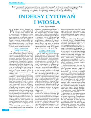 PROBLEMY NAUKI Wprowadzenie systemu corocznie aktualizowanych w Internecie „okienek prawdy”, ilustrujących dorobek pracownika nauki opłacanego z pieniędzy podatnika, zwiększy wzajemną motywację badaczy do pracy naukowej. INDEKSY CYTOWAŃ I WIOSŁA Karol Życzkowski yniki pracy danego na− ukowca są dobre, jeżeli tak uważa wielu innych do− brych uczonych pracujących w tej sa− mej dziedzinie. Ta prosta zasada sprawdzała się przez całe stulecia, gdy całkowita liczba ludzi prowa− dzących badania naukowe była nie− wielka, a wybitni uczeni mogli do− kładnie śledzić postępy i znać szcze− gółowo wyniki innych naukowców pracujących w danej dziedzinie. W LICZBA CYTOWAŃ ORAZ INDEKS H W ciągu minionego wieku liczba osób uprawiających naukę wzrosła niezmiernie, a specjalizacja zaszła tak daleko, że nikt nie jest w stanie kom− petentnie ocenić wyników uczonych pracujących w innej specjalizacji da− nej dziedziny. Dlatego też z koniecz− ności do wstępnej oceny dorobku ba− dacza stosuje się dane bibliometrycz− ne: całkowitą liczbę opublikowanych prac, liczbę cytowań czy indeks H, który wynosi N, jeżeli spośród wszystkich prac danego autora N z nich zostało zacytowanych co naj− mniej N razy. Nietrudno wskazać wady takiego podejścia. Często wybitne prace nie ukazywały się w ogóle drukiem lub po wydrukowaniu, przez dziesięcio− lecia niecytowane, leżały w zapo− mnieniu. Dlatego nie należy przece− niać znaczenia danych bibliome− trycznych i np. twierdzić, iż jeśli uczony A ma na swym koncie 250 cytowań własnych prac, to jest znacznie lepszym uczonym od bada− cza B, który zgromadził ich tylko 210. Będąc świadomym ułomności takie− go systemu, do wstępnej oceny do− robku nieznanego nam naukowca je− steśmy często zmuszeni stosować liczbę publikacji, liczbę cytowań czy indeks H, gdyż na razie po prostu nie dopracowano się lepszych me− tod. Na przykład, jeżeli indeksy H dwóch kandydatów na stanowisko 22 Forum Akademickie nr 9/2008 profesora wynoszą odpowiednio 17 i 7, to istnieje silna poszlaka, iż doro− bek pierwszego z nich jest poważ− niejszy. Oczywiście ostateczną odpo− wiedź na to pytanie mogą dać dopie− ro eksperci, którzy zaznajomili się szczegółowo z publikacjami obu kandydatów. Jakiekolwiek bezpo− średnie porównanie danych biblio− metrycznych ma sens wyłącznie w przypadku osób pracujących w tej samej dziedzinie nauki, gdyż każda gałąź wiedzy ma swoją specyfikę. POLSKA FIZYKA I JEJ POZYCJA W ŚWIECIE Gdy w roku 1979 rozpoczynałem studia fizyczne w Uniwersytecie Ja− giellońskim, byłem przekonany o po− tędze fizyki polskiej. Na tle siermięż− nej rzeczywistości realnego socjali− zmu korzystnie wyróżniali się fizycy, którzy mieli możliwość przez pe− wien czas pracować w najlepszych ośrodkach naukowych Europy Za− chodniej i Ameryki. Dzięki doświad− czeniom zdobywanym za granicą uczeni ci mogli w Polsce prowadzić badania na konkurencyjnym pozio− mie i utrzymywać kontakty z wiodą− cymi grupami badawczymi na całym świecie. Podobne osiągnięcia odno− sili też nieliczni przedstawiciele in− nych nauk przyrodniczych, co spra− wiało, że wypadkowa pozycja Polski na mapie naukowej świata wygląda− ła na relatywnie dobrą. Ponieważ nie używano wówczas powszechnie da− nych bibliometrycznych, tej optymi− stycznej tezy nie można było łatwo potwierdzić. Od tego czasu w naszym kraju zmieniło się niemal wszystko, po− za sposobem organizacji nauki. Po− dobnie jak za dawnych lat płace pra− cowników nauki są słabo powiązane z efektami ich pracy, a obowiązujący system nie wymusza prowadzenia badań na wysokim poziomie. Cho− ciaż nieliczni polscy naukowcy po− trafią w praktyce udowodnić, że tak− że w naszym kraju da się obecnie uzyskiwać znaczące rezultaty, spora część środowiska zadowala się dzia− łalnością pozorną. Ponieważ badania w innych krajach nie stoją w miejscu, pozycja naukowa Polski w świecie spada. Niestety, ta tendencja dotyczy tak− że polskiej fizyki, co nieubłaganie wykazują dane bibliometryczne. Jak pokazuje porównanie tabel 1 i 2, pod względem całkowitej liczby cy− towań w dziedzinie fizyki Polska zo− stała wyprzedzona przez Koreę Po− łudniową i od roku 2005 spadła z 13. na 14. miejsce. O ile polska chemia i matematyka utrzymują się nadal w drugiej dziesiątce, to odległe miej− sca przedstawicieli nauk biologicz− nych, medycznych, technicznych i społecznych sprawiają, że w miaro− dajnej kategorii całkowitej liczby cy− towań zajmujemy obecnie dopiero 25. miejsce na świecie. Analiza powyższych danych, do− stępnych na stronach internetowych firmy Thomson Scientific, pokazuje, iż w Rosji, w państwach Europy Środkowej i w krajach azjatyckich przeważa publikowanie dużej liczby mniej wartościowych prac, które póź− niej rzadko są cytowane. Mogłoby się wydawać, iż pod tym względem pol− ska fizyka poprawiła się w sposób znaczący, gdyż średnia liczba cyto− wań na pracę opublikowaną przez polskiego fizyka wzrosła z 5,8 do 6,9. Jest to jednak ogólny efekt związany z upływem czasu – każda opubliko− wana praca została średnio więcej ra− zy zacytowana, a więc dla każdego kraju ten wskaźnik wzrasta. Zauważmy, że typowa publikacja fizyka ze Szwajcarii jest cytowa− na prawie dwukrotnie częściej niż je− go kolegi z Polski. Liczby te cieka− wie jest porównać ze wskaźnikami opisującymi najlepsze ośrodki ba− dawcze na świecie. I tak praca fizyka z Harvardu cytowana jest średnio 20,6 razy, podczas gdy dla innych znanych ośrodków liczby te wyno− PROBLEMY NAUKI szą: Princeton University – 19.0, rencyjnych zarobków w nauce pol− skiego spisku ekspertów z całej Euro− MIT – 17,9, CERN – 16,6, Los Ala− skiej. py. Jak pisał ostatnio uczestnik ze