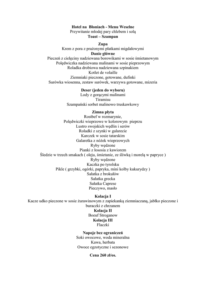 Hotel na Błoniach - Menu Weselne Przywitanie młodej pary chlebem i solą Toast – Szampan Zupa Krem z pora z prażonymi płatkami migdałowymi Danie główne Pieczeń z cielęciny nadziewana borowikami w sosie śmietanowym Polędwiczka nadziewana malinami w sosie pieprzowym Roladka drobiowa nadziewana szpinakiem Kotlet de volaille Ziemniaki pieczone, gotowane, dufinki Surówka wiosenna, zestaw surówek, warzywa gotowane, mizeria Deser (jeden do wyboru) Lody z gorącymi malinami Tiramisu Szampański sorbet malinowo truskawkowy Zimna płyta Rostbef w rozmarynie, Polędwiczki wieprzowe w kolorowym pieprzu Lustro swojskich wędlin i serów Roladki z szynki w galarecie Karczek w sosie tatarskim Galaretka z nóżek wieprzowych Ryby wędzone Pianki z łososia z kawiorem Śledzie w trzech smakach ( oleju, śmietanie, ze śliwką i morelą w papryce ) Ryby wędzone Kaczka po tyrolsku Pikle ( grzybki, ogórki, papryka, mini kolby kukurydzy ) Sałatka z brokułów Sałatka grecka Sałatka Caprese Pieczywo, masło Kolacja I Kacze udko pieczone w sosie żurawinowym z zapiekanką ziemniaczaną, jabłko pieczone i buraczki z chrzanem Kolacja II Boeuf Stroganow Kolacja III Flaczki Napoje bez ograniczeń Soki owocowe, woda mineralna Kawa, herbata Owoce egzotyczne i sezonowe Cena 260 zł/os.