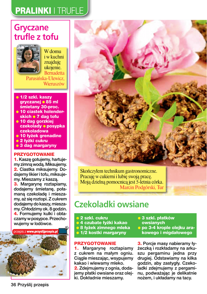 PRALINKI I TRUFLE Gryczane trufle z tofu W domu i w kuchni znajduję ukojenie. Bernadetta Parusińska-Ulewicz, Wieruszów 1/2 szkl. kaszy gryczanej ● 85 ml śmietany 30-proc. ● 10 ciastek holenderskich ● 7 dag tofu ● 10 dag gorzkiej czekolady ● posypka czekoladowa ● 10 łyżek grenadine ● 2 łyżki cukru ● 3 dag margaryny ● PRZYGOTOWANIE 1. Kaszę gotujemy, hartujemy zimną wodą. Miksujemy. 2. Ciastka miksujemy. Dodajemy likier i tofu, miksujemy. Mieszamy z kaszą. 3. Margarynę roztapiamy, dodajemy śmietanę, połamaną czekoladę i mieszamy, aż się roztopi. Z cukrem dodajemy do kaszy, mieszamy. Chłodzimy ok. 8 godzin. 4. Formujemy kulki i obtaczamy w posypce. Przechowujemy w lodówce. przepis z www.przyslijprzepis.pl Skończyłem technikum gastronomiczne. Pracuję w cukierni i lubię swoją pracę. Moją dzielną pomocnicą jest 5-letnia córka. Marcin Podgórski, Tur Czekoladki owsiane ● ● ● ● 2 szkl. cukru 4 czubate łyżki kakao 8 łyżek zimnego mleka 1/2 kostki margaryny PRZYGOTOWANIE 1. Margarynę roztapiamy z cukrem na małym ogniu. Ciągle mieszając, wsypujemy kakao i wlewamy mleko. 2. Zdejmujemy z ognia, dodajemy płatki owsiane oraz olejki. Dokładnie mieszamy. 36 Przyślij przepis 3 szkl. płatków owsianych ● po 3-4 krople olejku arakowego i migdałowego ● 3. Porcje masy nabieramy łyżeczką i rozkładamy na arkuszu pergaminu jedna przy drugiej. Odstawiamy na kilka godzin, aby zastygły. Czekoladki zdejmujemy z pergaminu, podważając je delikatnie nożem, i układamy na tacy.