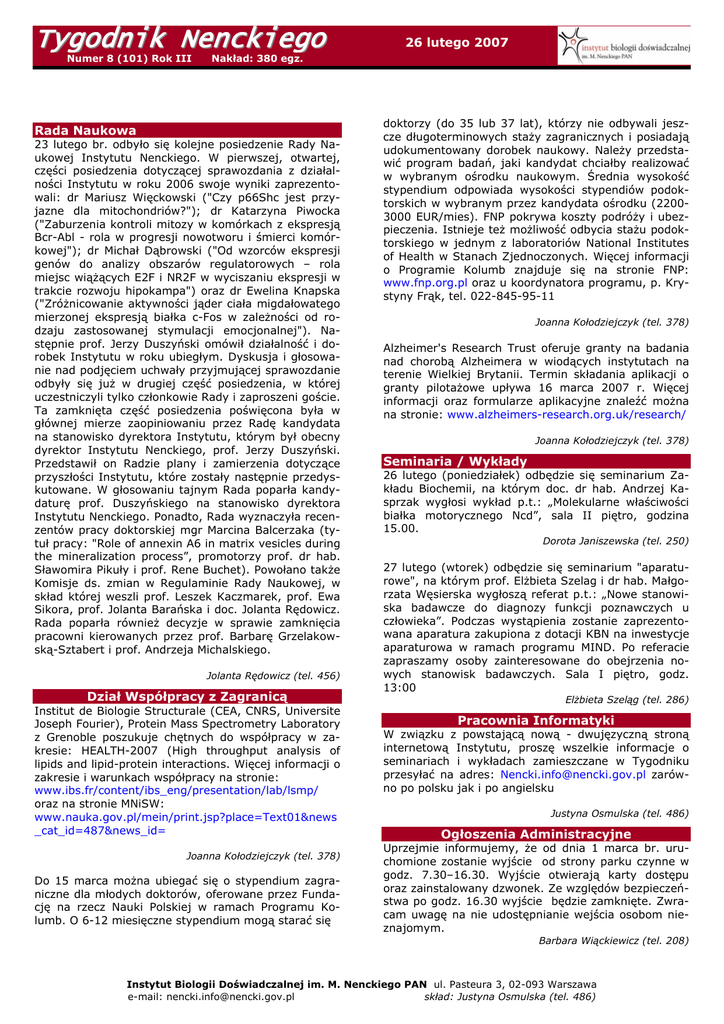 części posiedzenia dotyczącej sprawozdania z działalności Instytutu w roku 2006 swoje wyniki zaprezentowali: dr Mariusz Więckowski ("Czy p66Shc jest przyjazne dla mitochondriów?"); dr Katarzyna Piwocka