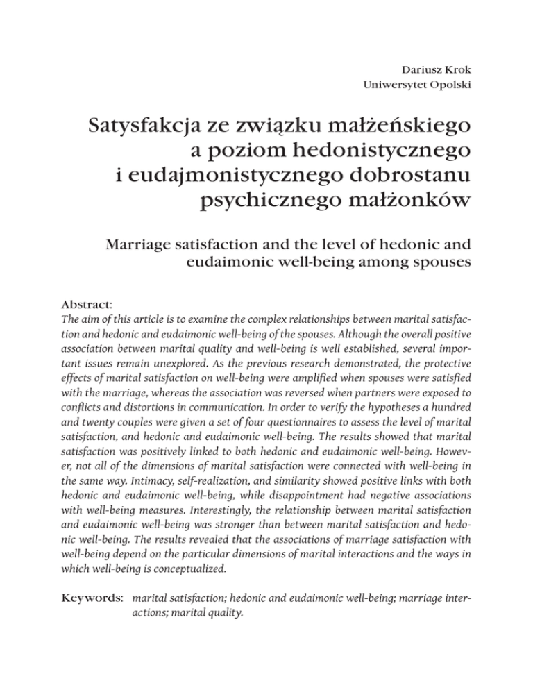 Dariusz Krok Uniwersytet Opolski Satysfakcja ze związku małżeńskiego a poziom hedonistycznego i eudajmonistycznego dobrostanu psychicznego małżonków Marriage satisfaction and the level of hedonic and eudaimonic well-being among spouses Abstract: The aim of this article is to examine the complex relationships between marital satisfaction and hedonic and eudaimonic well-being of the spouses. Although the overall positive association between marital quality and well-being is well established, several important issues remain unexplored. As the previous research demonstrated, the protective effects of marital satisfaction on well-being were amplified when spouses were satisfied with the marriage, whereas the association was reversed when partners were exposed to conflicts and distortions in communication. In order to verify the hypotheses a hundred and twenty couples were given a set of four questionnaires to assess the level of marital satisfaction, and hedonic and eudaimonic well-being. The results showed that marital satisfaction was positively linked to both hedonic and eudaimonic well-being. However, not all of the dimensions of marital satisfaction were connected with well-being in the same way. Intimacy, self-realization, and similarity showed positive links with both hedonic and eudaimonic well-being, while disappointment had negative associations with well-being measures. Interestingly, the relationship between marital satisfaction and eudaimonic well-being was stronger than between marital satisfaction and hedo nic well-being. The results revealed that the associations of marriage satisfaction with well-being depend on the particular dimensions of marital interactions and the ways in which well-being is conceptualized. Keywords: marital satisfaction; hedonic and eudaimonic well-being; marriage interactions; marital quality. 142 Dariusz Krok Streszczenie Celem niniejszego artykułu jest zbadanie złożonych relacji między satysfakcją ze związku małżeńskiego a hedonistycznym i eudajmonistycznym dobrostanem psychicznym małżonków. Chociaż ogólny pozytywny związek między satysfakcją ze związku małżeńskiego i dobrostanem psychicznym został ustalony, kilka ważnych kwestii pozostaje wciąż niezbadanych. Wcześniejsze badania wykazały, że wpływ satysfakcji małżeńskiej na dobrostan wzrasta, gdy małżonkowie są zadowoleni z małżeństwa, natomiast wpływ ten maleje, gdy partnerzy są narażeni na konflikty i zakłócenia w komunikacji. W celu weryfikacji hipotez przebadano sto dwadzieścia par za pomocą zestawu czterech kwestionariuszy do oceny poziomu satysfakcji małżeńskiej oraz hedonistycznego i eudajmonistycznego dobrostanu psychicznego. Wyniki wykazały, że satysfakcja małżeńska pozytywnie wiąże się z zarówno hedonistycznym, jak i eudajmonistycznym dobrostanem. Jednak nie wszystkie wymiary satysfakcji małżeńskiej były związane z dobrostanem w jednakowym stopniu. Intymność, samorealizacja i podobieństwo wykazały pozytywne więzi z hedonistycznym i eudajmonistycznym dobrostanem, podczas gdy wymiar rozczarowania posiadał negatywne związki. Ponadto związki między satysfakcją ze związku małżeńskiego i eudajmonistycznym dobrostanem były silniejsze niż między satysfakcją a hedonistycznym dobrostanem. Wyniki pokazały, że związki satysfakcji z małżeństwa z dobrostanem zależą od konkretnych wymiarów interakcji małżeńskich oraz sposobu konceptualizacji dobrostanu. Słowa kluczowe: satysfakcja z małżeństwa, hedonistyczny i eudajmonistyczny dobrostan psychiczny, interakcje małżeńskie, jakość życia małżeńskiego. Satysfakcja ze związku małżeńskiego, jej uwarunkowania oraz konsekwencje dla psychicznego funkcjonowania małżonków stanowią ważny i wciąż aktualny przedmiot badań w wielu krajach świata. Temat ten cieszy się także popularnością wśród osób zajmujących się poradnictwem i terapią par małżeńskich, które pracują nad tym, by związek był satysfakcjonujący i szczęśliwy. Satysfakcja ze związku jest silnie związana z ogólnym poczuciem szczęścia małżonków, gdyż wszystko to, co dzieje się w obrębie relacji małżeńskich przekłada się na doświadczaną satysfakcję życiową. Zadowolenie z małżeństwa wpływa na funkcjonowanie człowieka we wszystkich obszarach jego funkcjonowania indywidualnego i społecznego. Z tego powodu, temat satysfakcji ze związku i jej powiązania ze szczęściem życiowym wydaje się istotnym zagadnieniem badawczym, zarówno od strony teoretycznej, jak i praktycznej. Celem niniejszego artykułu jest zbadanie struktury i charakteru powiązań między satysfakcją ze związku małżeńskiego Satysfakcja ze związku małżeńskiego 143 a poziomem dobrostanu psychicznego małżonków ujmowanym w kategoriach hedonistycznych i eudajmonistycznych. 1. Relacje między satysfakcją ze związku małżeńskiego a dobrostanem psychicznym Małżeństwo z perspektywy psychologicznej określa się zazwyczaj jako specyficzny podsystem rodziny, który złożony jest z dorosłych osób wywodzących się z dwóch różnych rodzin generacyjnych, które związały się, aby wspólnie mieszkać i żyć (Plopa 2008, 51). Małżeństwo, jako trwały związek, powinno być ujmowane jako dynamiczny system współtworzony przez interakcje wpływające na rozwijanie miłości, poprzez dążenie do osiągania pewnych wartości i wypełniania zadań. Na przestrzeni trwania związku kształtują się relacje między małżonkami, będące wyrazem ich miłości i jednocześnie odpowiedzią na przeżywane uczucia. Precyzyjne określenie pojęcia satysfakcji ze związku małżeńskiego nie należy do łatwych zadań, głównie ze względu na mnogość terminów. Literatura przedmiotu nie wskazuje jednoznacznej definicji satysfakcji z małżeństwa. Do najczęstszych terminów opisujących satysfakcję małżonków należą: jakość małżeństwa, dobrany związek małżeń