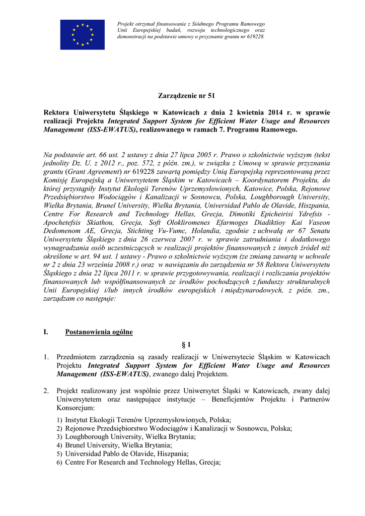 Projekt otrzymał finansowanie z Siódmego Programu Ramowego Unii Europejskiej badań, rozwoju technologicznego oraz demonstracji na podstawie umowy o przyznanie grantu nr 619228. Zarządzenie nr 51 Rektora Uniwersytetu Śląskiego w Katowicach z dnia 2 kwietnia 2014 r. w sprawie realizacji Projektu Integrated Support System for Efficient Water Usage and Resources Management (ISS-EWATUS), realizowanego w ramach 7. Programu Ramowego. Na podstawie art. 66 ust. 2 ustawy z dnia 27 lipca 2005 r. Prawo o szkolnictwie wyższym (tekst jednolity Dz. U. z 2012 r., poz. 572, z późn. zm.), w związku z Umową w sprawie przyznania grantu (Grant Agreement) nr 619228 zawartą pomiędzy Unią Europejską reprezentowaną przez Komisję Europejską a Uniwersytetem Śląskim w Katowicach – Koordynatorem Projektu, do której przystąpiły Instytut Ekologii Terenów Uprzemysłowionych, Katowice, Polska, Rejonowe Przedsiębiorstwo Wodociągów i Kanalizacji w Sosnowcu, Polska, Loughborough University, Wielka Brytania, Brunel University, Wielka Brytania, Universidad Pablo de Olavide, Hiszpania, Centre For Research and Technology Hellas, Grecja, Dimotiki Epicheirisi Ydrefsis Apochetefsis Skiathou, Grecja, Soft Olokliromenes Efarmoges Diadiktioy Kai Vaseon Dedomenom AE, Grecja, Stichting Vu-Vumc, Holandia, zgodnie z uchwałą nr 67 Senatu Uniwersytetu Śląskiego z dnia 26 czerwca 2007 r. w sprawie zatrudniania i dodatkowego wynagradzania osób uczestniczących w realizacji projektów finansowanych z innych źródeł niż określone w art. 94 ust. 1 ustawy - Prawo o szkolnictwie wyższym (ze zmianą zawartą w uchwale nr 2 z dnia 23 września 2008 r.) oraz w nawiązaniu do zarządzenia nr 58 Rektora Uniwersytetu Śląskiego z dnia 22 lipca 2011 r. w sprawie przygotowywania, realizacji i rozliczania projektów finansowanych lub współfinansowanych ze środków pochodzących z funduszy strukturalnych Unii Europejskiej i/lub innych środków europejskich i międzynarodowych, z późn. zm., zarządzam co następuje: Postanowienia ogólne I. §1 1. Przedmiotem zarządzenia są zasady realizacji w Uniwersytecie Śląskim w Katowicach Projektu Integrated Support System for Efficient Water Usage and Resources Management (ISS-EWATUS), zwanego dalej Projektem. 2. Projekt realizowany jest wspólnie przez Uniwersytet Śląski w Katowicach, zwany dalej Uniwersytetem oraz następujące instytucje – Beneficjentów Projektu i Partnerów Konsorcjum: 1) 2) 3) 4) 5) 6) Instytut Ekologii Terenów Uprzemysłowionych, Polska; Rejonowe Przedsiębiorstwo Wodociągów i Kanalizacji w Sosnowcu, Polska; Loughborough University, Wielka Brytania; Brunel University, Wielka Brytania; Universidad Pablo de Olavide, Hiszpania; Centre For Research and Technology Hellas, Grecja; 7) Dimotiki Epicheirisi Ydrefsis - Apochetefsis Skiathou, Grecja; 8) Soft Olokliromenes Efarmoges Diadiktioy Kai Vaseon Dedomenom AE, Grecja; 9) Stichting Vu-VUmc, Holandia. 3. Nadrzędnym dokumentem jest Umowa w sprawie przyznania grantu (Grant Agreement) nr 619228 wraz z załącznikami, zwana w dalszej części zarządzenia Umową, zawarta pomiędzy Unią Europejską reprezentowaną przez Komisję Europejską a Uniwersytetem Śląskim w Katowicach – Koordynatorem Projektu, do której przystąpiło dziewięć podmiotów wskazanych w ust. 2 – zwanych dalej Beneficjentami. 4. Zgodnie z Umową w sprawie przyznania grantu nr 619228 Projekt realizowany jest przez 36 miesięcy od dnia 1 lutego 2014 r. do dnia 31 stycznia 2017 r. II. Realizacja Projektu §2 Projekt realizowany jest zgodnie z: 1) umową w sprawie przyznania grantu (Grant Agreement) nr 619228; 2) umową konsorcjum (Consortium Agreement); 3) przepisami zarządzenia nr 58 Rektora Uniwersytetu Śląskiego z dnia 22 lipca 2011 r. w sprawie przygotowywania, realizacji i rozliczania projektów finansowanych lub współfinansowanych ze środków pochodzących z funduszy strukturalnych Unii Europejskiej i/lub innych środków europejskich i międzynarodowych, z późn. zm; 4) przepisami niniejszego zarządzenia. III. Zarządzanie Projektem §3 1. Szczegółowe zasady zarządzania Projektem, w tym wewnętrzną organizację konsorcjum, podział wkładu finansowego wspólnoty, zasady dotyczące praw własności intelektualnej i poufności oraz procedury rozstrzygania sporów określa umowa konsorcjum (Consortium Agreement), zawarta pomiędzy wszystkimi Beneficjentami Projektu. 2. Jednostką organizacyjną odpowiedzialną za realizację Projektu w Uniwersytecie jest Wydział Informatyki i Nauki o Materiałach. Władze wymienionej jednostki są zobowiązane do zapewnienia sprawnej i prawidłowej realizacji Projektu, w tym zapewnienia wkładu własnego do Projektu. 3. W celu prawidłowej realizacji przedmiotu Umowy w Uniwersytecie Śląskim w Katowicach powołuje się na okres od dnia 1 lutego 2014 r. do dnia 31 stycznia 2017 r., dla potrzeb zarządzania i realizacji Projektu: 1) Zespół Wykonawczy; 2) Zespół Nadzorujący. str. 2 z 7 §4 Zespół Wykonawczy 1. W skład Zespołu Wykonawczego Projektu wchodzą: 1) 2) 3) 4) Kierownik Projektu; Zastępca Kierownika ds. Zapewnienia Jakości Naukowej Projektu; Specjalista ds. Rozpowszechniania Rezultatów Projektu; Pracownicy merytoryczni realizujący Projekt. 2. Do zadań Kierownika Projektu należy w szczególności: 1) nadzór nad zgodnością realizacji Projektu z wytycznymi 7. Programu Ramowego; 2) organizowanie i nadzorowanie prawidłowości oraz terminowości realizacji zadań wykonywanych w ramach Projektu; 3) wraz z odpowiednimi służbami UŚ – kontrola budżetu Projektu, finansowe rozliczenie Projektu; 4) dobór kompetentnej kadry merytorycznej realizującej Projekt, nadzór, monitorowanie i organizacja pracy wykonywanej przez osoby zatrudnione w Projekcie, zapewnienie bezpieczeństwa pracy w zakresie zadań związanych z realizacją Projektu; 5) wnioskowanie o zatrudnienie/dodatkowe wynagrodzenie osób w celu realizacji zadań Projektu, sporządzanie umów
