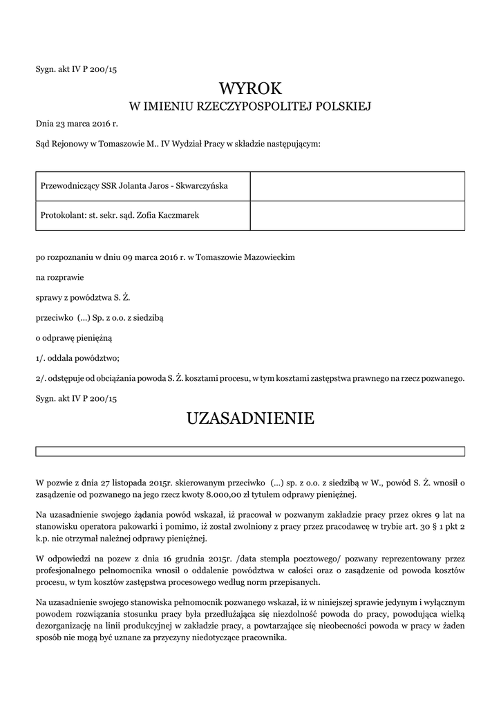 Sygn. akt IV P 200/15 WYROK W IMIENIU RZECZYPOSPOLITEJ POLSKIEJ Dnia 23 marca 2016 r. Sąd Rejonowy w Tomaszowie M.. IV Wydział Pracy w składzie następującym: Przewodniczący SSR Jolanta Jaros - Skwarczyńska Protokolant: st. sekr. sąd. Zofia Kaczmarek po rozpoznaniu w dniu 09 marca 2016 r. w Tomaszowie Mazowieckim na rozprawie sprawy z powództwa S. Ż. przeciwko (...) Sp. z o.o. z siedzibą o odprawę pieniężną 1/. oddala powództwo; 2/. odstępuje od obciążania powoda S. Ż. kosztami procesu, w tym kosztami zastępstwa prawnego na rzecz pozwanego. Sygn. akt IV P 200/15 UZASADNIENIE W pozwie z dnia 27 listopada 2015r. skierowanym przeciwko (...) sp. z o.o. z siedzibą w W., powód S. Ż. wnosił o zasądzenie od pozwanego na jego rzecz kwoty 8.000,00 zł tytułem odprawy pieniężnej. Na uzasadnienie swojego żądania powód wskazał, iż pracował w pozwanym zakładzie pracy przez okres 9 lat na stanowisku operatora pakowarki i pomimo, iż został zwolniony z pracy przez pracodawcę w trybie art. 30 § 1 pkt 2 k.p. nie otrzymał należnej odprawy pieniężnej. W odpowiedzi na pozew z dnia 16 grudnia 2015r. /data stempla pocztowego/ pozwany reprezentowany przez profesjonalnego pełnomocnika wnosił o oddalenie powództwa w całości oraz o zasądzenie od powoda kosztów procesu, w tym kosztów zastępstwa procesowego według norm przepisanych. Na uzasadnienie swojego stanowiska pełnomocnik pozwanego wskazał, iż w niniejszej sprawie jedynym i wyłącznym powodem rozwiązania stosunku pracy była przedłużająca się niezdolność powoda do pracy, powodująca wielką dezorganizację na linii produkcyjnej w zakładzie pracy, a powtarzające się nieobecności powoda w pracy w żaden sposób nie mogą być uznane za przyczyny niedotyczące pracownika. Nadto, pełnomocnik pozwanego dodatkowo wskazał, iż powodowi nie udało się w żaden sposób wykazać, iż przyczyna podana w wypowiedzeniu umowy o pracę była niewłaściwa, a tym samym brak jest jakichkolwiek podstaw prawnych lub faktycznych do wypłacenia mu odprawy na podstawie Ustawy o zwolnieniach grupowych. Z daleko idącej ostrożności procesowej, pełnomocnik pozwanego podniósł również i to, że powód nienależycie określił wysokość swojego roszczenia, gdyż nawet gdyby uznać, iż tego rodzaju roszczenie przysługiwałoby powodowi, to zgodnie z art. 8 ust. 1 pkt 3 w zw. z art. 10 ust. 1 Ustawy o zwolnieniach grupowych przysługiwałaby mu odprawa w wysokości 3 miesięcznego wynagrodzenia, co przy uwzględnieniu zasad obowiązujących przy obliczaniu ekwiwalentu pieniężnego za urlop wypoczynkowy daje kwotę 5.664,00 złotych brutto, a nie kwotę 8.000,00 zł brutto żądaną przez powoda. Sąd Rejonowy ustalił, następujący stan faktyczny: Powód S. Ż. był zatrudniony u pozwanego pracodawcy od dnia 19 kwietnia 2006r.do dnia 31 lipca 2015r., na podstawie umowy o pracę, w pełnym wymiarze czasu pracy, na stanowisku operatora pakowarki. dowód: umowy o pracę – akta osobowe powoda S. D. B k.11, 15,17,22 Oświadczeniem z dnia 01.04.2015r. pozwany pracodawca wypowiedział powodowi umowę o pracę zawartą w dniu 01 grudnia 2008r. z zachowaniem ustawowego okresu wypowiedzenia, którego termin upłynął 31 lipca 2015 r. Jako przyczynę wypowiedzenia pracodawca wskazał częste, powtarzające się długotrwałe nieobecności w pracy, które dezorganizują pracę na linii produkcyjnej i wymagają podejmowania przez pracodawcę działań natury organizacyjnej (wyznaczanie zastępstw - umowy w zastępstwie) oraz pociągają za sobą wydatki na zatrudnianie tych pracowników. dowód: oświadczenie o wypowiedzeniu umowy o pracę z dnia 01.04.2015r.- akta osobowe powoda Dział C- k1; zeznania powoda S. Ż. – protokół rozprawy audio –video z dnia 09 marca 2016r. 00:12:42 -00:20:21 – k. 47 verte; W pozwie z dnia 03 kwietnia 2015r., skierowanym przeciwko (...) sp. z o.o. z siedzibą w W., powód S. Ż. wnosił o uznanie dokonanego wypowiedzenia umowy o pracę za bezskuteczne. Przedmiotowa sprawa została zarejestrowana pod numerem IV P 58/15. Postanowieniem z dnia 28 września 2015r., wobec cofnięcia pozwu, sąd umorzył postępowanie oraz zasądził od powoda na rzecz pozwanego kwotę 60,00 zł tytułem zwrotu kosztów zastępstwa prawego. dowód: pozew z dnia 03.04.2015r. – k. 2-3 akt sprawy sygn. akt IV P 58/15; prawomocne postanowienie z dnia 28.09.2015r. – k.55 akt sprawy sygn. akt IV P 58/15; Powód S. Ż. obecnie pracuje w (...) S.A. z siedzibą w T. M.. i z tytułu zatrudnienia otrzymuje on wynagrodzenie w kwocie 1600 zł. Ma na utrzymaniu jedno dziecko w wieku 8 lat oraz niepracującą żonę. dowód: zeznania powoda S. Ż. – protokół rozprawy audio –video z dnia 09 marca 2016r. 00:12:42 -00:20:21- k. 47 verte; Sąd zważył, co następuje: Zgodnie z art.8 w związku z art.10 ustawy z dn. 13 marca 2003r o szczególnych zasadach rozwiązywania z pracownikami stosunków pracy z przyczyn nie dotyczących pracownika (Dz. U. nr 90 poz. 844 z póź. zmianami), przesłanką zasądzenia odprawy pieniężnej jest rozwiązanie stosunku pracy w ramach zwolnień grupowych lub indywidualnych spowodowanych przyczynami nie dotyczącymi pracownika, przy czym przy zwolnieniach indywidualnych przyczyny te muszą stanowić wyłączny powód uzasadniający wypowiedzenie stosunku pracy. W rozpatrywanej sprawie bezspornym było, że pozwany pracodawca wypowiedział powodowi S. Ż. umowę o pracę zawartą na czas nieokreślony i wskazał jako przyczynę wypowiedzenia częste, powtarzające się długotrwałe nieobecności powoda w pracy, które dezorganizują pracę na linii produkcyjnej i wymagają podejmowania przez pracodawcę działań natury organizacyjnej (wyznaczanie zastępstw - umowy w zastępstwie) oraz pociągają za sobą wydatki na zatrudnianie tych pracowników. W świetle obowiązujących przepisów prawa, przesłanką zasądzenia odprawy pieniężnej nie jest niezgodność z przepisami bąd