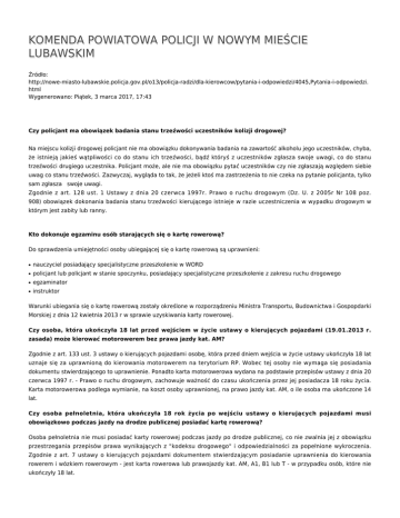 KOMENDA POWIATOWA POLICJI W NOWYM MIEŚCIE LUBAWSKIM Źródło: http://nowe-miasto-lubawskie.policja.gov.pl/o13/policja-radzi/dla-kierowcow/pytania-i-odpowiedzi/4045,Pytania-i-odpowiedzi. html Wygenerowano: Piątek, 3 marca 2017, 17:43 Czy policjant ma obowiązek badania stanu trzeźwości uczestników kolizji drogowej? Na miejscu kolizji drogowej policjant nie ma obowiązku dokonywania badania na zawartość alkoholu jego uczestników, chyba, że istnieją jakieś wątpliwości co do stanu ich trzeźwości, bądź któryś z uczestników zgłasza swoje uwagi, co do stanu trzeźwości drugiego uczestnika. Policjant może, ale nie ma obowiązku pytać uczestników czy nie zgłaszają względem siebie uwag co stanu trzeźwości. Zazwyczaj, wygląda to tak, że jeżeli ktoś ma zastrzeżenia to nie czeka na pytanie policjanta, tylko sam zgłasza swoje uwagi. Zgodnie z art. 128 ust. 1 Ustawy z dnia 20 czerwca 1997r. Prawo o ruchu drogowym (Dz. U. z 2005r Nr 108 poz. 908) obowiązek dokonania badania stanu trzeźwości kierującego istnieje w razie uczestniczenia w wypadku drogowym w którym jest zabity lub ranny. Kto dokonuje egzaminu osób starających się o kartę rowerową? Do sprawdzenia umiejętności osoby ubiegającej się o kartę rowerową są uprawnieni: ● nauczyciel posiadający specjalistyczne przeszkolenie w WORD ● policjant lub policjant w stanie spoczynku, posiadający specjalistyczne przeszkolenie z zakresu ruchu drogowego ● egzaminator ● instruktor Warunki ubiegania się o kartę rowerową zostały określone w rozporządzeniu Ministra Transportu, Budownictwa i Gospopdarki Morskiej z dnia 12 kwietnia 2013 r w sprawie uzyskiwania karty rowerowej. Czy osoba, która ukończyła 18 lat przed wejściem w życie ustawy o kierujących pojazdami (19.01.2013 r. zasada) może kierować motorowerem bez prawa jazdy kat. AM? Zgodnie z art. 133 ust. 3 ustawy o kierujących pojazdami osobę, która przed dniem wejścia w życie ustawy ukończyła 18 lat uznaje się za uprawnioną do kierowania motorowerem na terytorium RP. Wobec tej osoby nie wymaga się posiadania dokumentu stwierdzającego to uprawnienie. Ponadto karta motorowerowa wydana na podstawie przepisów ustawy z dnia 20 czerwca 1997 r. - Prawo o ruchu drogowym, zachowuje ważność do czasu ukończenia przez jej posiadacza 18 roku życia. Karta motorowerowa podlega wymianie, na koszt osoby uprawnionej, na prawo jazdy kat. AM, o ile osoba ma ukończone 14 lat. Czy osoba pełnoletnia, która ukończyła 18 rok życia po wejściu ustawy o kierujących pojazdami musi obowiązkowo podczas jazdy na drodze publicznej posiadać kartę rowerową? Osoba pełnoletnia nie musi posiadać karty rowerowej podczas jazdy po drodze publicznej, co nie zwalnia jej z obowiązku przestrzegania przepisów prawa wynikających z "kodeksu drogowego" i odpowiedzialności za popełnione wykroczenia. Zgodnie z art. 7 ustawy o kierujących pojazdami dokumentem stwierdzającym posiadanie uprawnienia do kierowania rowerem i wózkiem rowerowym - jest karta rowerowa lub prawojazdy kat. AM, A1, B1 lub T - w przypadku osób, które nie ukończyły 18 lat. Kto ma pierwszeństwo, gdy z dwóch stron nadjadą w tym samym czasie pojazdy uprzywilejowane? Przepisy nie określają hierarchii przejazdu pojazdów uprzywilejowanych w przypadku potrzeby przecięcia się ich kierunków ruchu. Sytuacja taka w praktyce występuje raczej sporadycznie, chociaż ma prawo zaistnieć. Kierowcy tych pojazdów powinni zachować się zgodnie z przepisami o pierwszeństwie przejazdu. Nie wykluczone, że kierujący pojazdem uprzywilejowanym innym niż karetka pogotowia umożliwi przejazd karetce w pierwszej kolejności wbrew zasadom, jednak nie wynika to z przepisów, a raczej ze zdrowego rozsądku. Każdy kierowca wie do jakiego jedzie zdarzenia i jest w stanie ocenić potrzebę ,,zwłoki”. Ponadto należy podkreślić, że każdy z kierujących jest obowiązany zachować szczególną ostrożność, a w razie potrzeby również się zatrzymać. W przypadku, gdy na skrzyżowaniu znajduje się osoba kierująca ruchem, kierujący pojazdem uprzywilejowanym ma obowiązek zastosować się do poleceń i sygnałów przez nią dawanych. Jakiego typu urządzenia elektroniczne do badania stanu trzeźwości używa Policja? Urządzenia elektroniczne służące do pomiaru zawartości alkoholu w wydychanym powietrzu będące w posiadaniu Policji to: 1. Alco-sensor IV prod. INTOXIMETERS – USA, 2. Alkotesty serii 7410 prod. DRÄGER – NIEMCY 3. Alkotesty prod. ALCOQUANT – NIEMCY 4. Alkometry prod. AWAT – POLSKA 5. Alkomaty prod. SIEMENS - NIEMCY 6. AlcoBlow Do jakiej kategorii użytkowników dróg należy zakwalifikować osobą poruszająca się na rolkach, (deskorolce)? Przepisy ruchu drogowego nie definiują wprost pojęcia osoby poruszającej się na rolkach,czy deskorolce dlatego też należy dokonać interpretacji obowiązujących przepisów. Zgodnie z art. 2 pkt 18 Ustawy z dnia 20 czerwca 1997r. Prawo o ruchu drogowym (Dz. U. z 2005r Nr 108 poz. 908) pieszym jest cyt. ,,... osoba znajdująca się poza pojazdem na drodze i niewykonująca na niej robót lub czynności przewidzianych odrębnymi przepisami; za pieszego uważa się również osobę prowadzącą, ciągnącą lub pchającą rower, motorower, motocykl, wózek dziecięcy, podręczny lub inwalidzki, osobę poruszająca się w wózku inwalidzkim, a także osobę w wieku do 10 lat kierująca rowerem pod opieką osoby dorosłej”. Kierującym z kolei jest cyt. ,,..osoba, która kieruje pojazdem...”. Z definicji tych wynika, że osoba poruszająca się na rolkach(deskorolce) nie kieruje żadnym pojazdem, lecz znajduje się na drodze poza pojazdem i nie wykonuje na niej żadnych czynności. Należy zatem uznać, że osoba poruszająca się na rolkach (deskorolce) jest pieszym w myśl powyższej definicji. W związku z powyższym jej zachowanie na drodze powinno być zgodne z art.11 ust.1 cyt. ,,pieszy jest obowiązany korzys