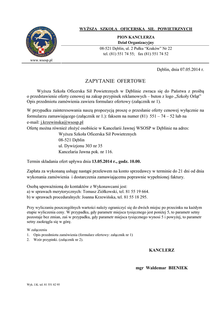 WYŻSZA SZKOŁA OFICERSKA SIŁ POWIETRZNYCH PION KANCLERZA Dział Organizacyjny 08-521 Dęblin, ul. 2 Pułku “Kraków” Nr 22 tel. (81) 551 74 55; fax (81) 551 74 52 www.wsosp.pl Dęblin, dnia 07.05.2014 r. ZAPYTANIE OFERTOWE Wyższa Szkoła Oficerska Sił Powietrznych w Dęblinie zwraca się do Państwa z prośbą o przedstawienie oferty cenowej na zakup przypinek reklamowych – buton z logo „Szkoły Orląt” Opis przedmiotu zamówienia zawiera formularz ofertowy (załącznik nr 1). W przypadku zainteresowania naszą propozycją proszę o przesłanie oferty cenowej wyłącznie na formularzu zamawiającego (załącznik nr 1.): faksem na numer (81) 551 – 74 – 52 lub na e-mail: [email protected] Ofertę można również złożyć osobiście w Kancelarii Jawnej WSOSP w Dęblinie na adres: Wyższa Szkoła Oficerska Sił Powietrznych 08-521 Dęblin ul. Dywizjonu 303 nr 35 Kancelaria Jawna pok. nr 116. Termin składania ofert upływa dnia 13.05.2014 r., godz. 10.00. Zapłata za wykonaną usługę nastąpi przelewem na konto sprzedawcy w terminie do 21 dni od dnia wykonania zamówienia i dostarczenia zamawiającemu poprawnie wypełnionej faktury. Osobą upoważnioną do kontaktów z Wykonawcami jest: a) w sprawach merytorycznych: Tomasz Ziółkowski, tel. 81 55 19 664. b) w sprawach proceduralnych: Joanna Krzewińska, tel. 81 55 18 295. Przy wyliczaniu poszczególnych wartości należy ograniczyć się do dwóch miejsc po przecinku na każdym etapie wyliczenia ceny. W przypadku, gdy parametr miejsca tysięcznego jest poniżej 5, to parametr setny pozostaje bez zmian, zaś w przypadku, gdy parametr miejsca tysięcznego wynosi 5 i powyżej, to parametr setny zaokrągla się w górę. W załączeniu 1. Opis przedmiotu zamówienia (formularz ofertowy: załącznik nr 1) 2. Wzór przypinki. (załącznik nr 2). KANCLERZ mgr Waldemar BIENIEK Wyk. J.K. tel. 81 551 82 95 Załącznik nr 1 FORMULARZ OFERTOWY W odpowiedzi na zapytanie składamy ofertę. Szczegółowy opis przedmiotu zamówienia Przedmiotem zamówienia są: przypinki reklamowe – buton z logo „Szkoły Orląt” Wzór w załączniku nr 2. Średnica 37 mm, druk laserowy – foliowany z logo „Szkoły Orląt”. Ilość: 200 sztuk. L.p. 1. Nazwa przedmiotu Ilość szt. Przypinka reklamowa – buton z logo 200 Cena jednostkowa netto zł VAT % Wartość zamówienia netto zł Wartość zamówienia brutto zł Termin dostawy: do 15 maja 2014 r. Koszt dostawy po stronie wykonawcy: wliczony w cenę towaru. Dostawa jednorazowa. Do magazynu. Termin płatności: płatność w ciągu 21 dni od daty otrzymania faktury. Zobowiązuję się wykonać usługę zgodnie z umową i/lub formularzem ofertowym. ……………………………….…… Miejscowość , data …………………………….. Wykonawca