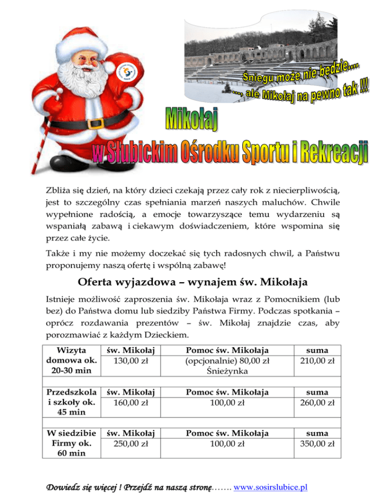 Zbliża się dzień, na który dzieci czekają przez cały rok z niecierpliwością, jest to szczególny czas spełniania marzeń naszych maluchów. Chwile wypełnione radością, a emocje towarzyszące temu wydarzeniu są wspaniałą zabawą i ciekawym doświadczeniem, które wspomina się przez całe życie. Także i my nie możemy doczekać się tych radosnych chwil, a Państwu proponujemy naszą ofertę i wspólną zabawę! Oferta wyjazdowa – wynajem św. Mikołaja Istnieje możliwość zaproszenia św. Mikołaja wraz z Pomocnikiem (lub bez) do Państwa domu lub siedziby Państwa Firmy. Podczas spotkania – oprócz rozdawania prezentów – św. Mikołaj znajdzie czas, aby porozmawiać z każdym Dzieckiem. Wizyta domowa ok. 20-30 min św. Mikołaj 130,00 zł Pomoc św. Mikołaja (opcjonalnie) 80,00 zł Śnieżynka suma 210,00 zł Przedszkola i szkoły ok. 45 min św. Mikołaj 160,00 zł Pomoc św. Mikołaja 100,00 zł suma 260,00 zł W siedzibie Firmy ok. 60 min św. Mikołaj 250,00 zł Pomoc św. Mikołaja 100,00 zł suma 350,00 zł Dowiedz się więcej ! Przejdź na naszą stronę……. www.sosirslubice.pl Spotkanie ze św. Mikołajem w Słubickim Ośrodku Sportu i Rekreacji Dla Firm - animacje ze św. Mikołajem - zabawy wg mikołajowego scenariusza. Zapraszamy na spotkanie ze św. Mikołajem przygotowane dla Dzieci Pracowników oraz Klientów Państwa Firmy w naszym klubie „Olimpijczyka”. Proponujemy animowaną zabawę dla Dzieci wg autorskiego scenariusza mikołajowego. Św. Mikołaj rozda każdemu dziecku prezent, a chętnych wysłucha cierpliwie na kolanie i zbierze zamówienia na następny rok. Podczas zabawy Rodzice będą mogli odpocząć chwilę w naszej Kawiarni, napić się pysznej kawy oraz skosztować ciasta domowej roboty (ciasto należy wcześniej zamówić). Śnieżynka przygotuje Dzieci na przyjście św. Mikołaja, a na czas odwiedzin zaproszą także Rodziców. Oferta przygotowywana jest indywidualnie. Istnieje możliwość przygotowania paczek przez naszych pracowników, wynajęcia dodatkowego animatora, fotografa. Opcja 2-godzinnej zabawy zawiera krótki poczęstunek dla Dzieci (słodko - słono - owocowy plus napoje). św. Mikołaj Śnieżynka Wynajem lokalu suma Program 1 godzinny 250,00 zł 100,00 zł 100,00 zł 450,00 zł Program 2 godzinny 350,00 zł 120,00 zł 140,00 zł 610,00 zł Serdecznie zapraszamy! Osoby do kontaktu w sprawie oferty: Joanna Jędrzejczak, Ewa Redzik- Dział Marketingu i Turystyki SOSiR Słubicki Ośrodek Sportu i Rekreacji ul. Sportowa 1, 69-100 Słubice tel. 95 758 25 01 e-mail: [email protected] Dowiedz się więcej ! Przejdź na naszą stronę……. www.sosirslubice.pl