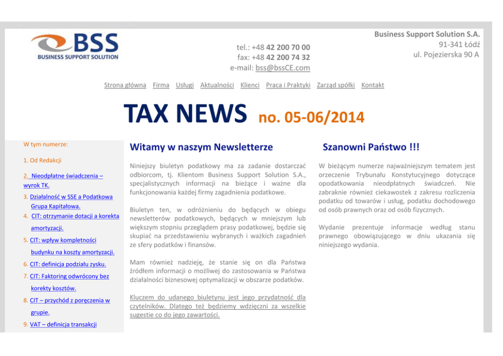 tel.: +48 42 200 70 00 fax: +48 42 200 74 32 e-mail: [email protected] Business Support Solution S.A. 91-341 Łódź ul. Pojezierska 90 A Strona główna Firma Usługi Aktualności Klienci Praca i Praktyki Zarząd spółki Kontakt W tym numerze: 1. Od Redakcji 2. Nieodpłatne świadczenia – wyrok TK. 3. Działalność w SSE a Podatkowa Grupa Kapitałowa. 4. CIT: otrzymanie dotacji a korekta amortyzacji. 5. CIT: wpływ kompletności Witamy w naszym Newsletterze Niniejszy biuletyn podatkowy ma za zadanie dostarczać odbiorcom, tj. Klientom Business Support Solution S.A., specjalistycznych informacji na bieżące i ważne dla funkcjonowania każdej firmy zagadnienia podatkowe. Biuletyn ten, w odróżnieniu do będących w obiegu newsletterów podatkowych, będących w mniejszym lub większym stopniu przeglądem prasy podatkowej, będzie się skupiać na przedstawieniu wybranych i ważkich zagadnień ze sfery podatków i finansów. budynku na koszty amortyzacji. 6. CIT: definicja podziału zysku. 7. CIT: Faktoring odwrócony bez Mam również nadzieję, że stanie się on dla Państwa źródłem informacji o możliwej do zastosowania w Państwa działalności biznesowej optymalizacji w obszarze podatków. korekty kosztów. 8. CIT – przychód z poręczenia w grupie. 9. VAT – definicja transakcji Kluczem do udanego biuletynu jest jego przydatność dla czytelników. Dlatego też będziemy wdzięczni za wszelkie sugestie co do jego zawartości. Szanowni Państwo !!! W bieżącym numerze najważniejszym tematem jest orzeczenie Trybunału Konstytucyjnego dotyczące opodatkowania nieodpłatnych świadczeń. Nie zabraknie również ciekawostek z zakresu rozliczenia podatku od towarów i usług, podatku dochodowego od osób prawnych oraz od osób fizycznych. Wydanie prezentuje informacje według stanu prawnego obowiązującego w dniu ukazania się niniejszego wydania. łańcuchowej. 10. VAT: wymogi formalne dla faktury zbiorczej korygującej. 11. Apartament nie zawsze będzie lokalem mieszkalnym. 12. Kalendarium podatkowe. 13. Nasze usługi. Im prostsze są ustawy podatkowe, tym bardziej są niesprawiedliwe. Franz Josef Strauss Teza: Przepisy ustawy o PIT dot. opodatkowania dochodu pracowników z tytułu nieodpłatnych świadczeń rozumiane w ten sposób, że „inne nieodpłatne świadczenie” oznacza wyłącznie przysporzenie majątkowe o indywidualnie określonej wartości, otrzymane przez pracownika, są zgodne z konstytucją. Uzasadnienie: Trybunał Konstytucyjny w dniu 8 lipca 2014 r. rozpoznał wniosek Prezydenta Konfederacji Lewiatan dotyczący opodatkowania świadczeń, które mogą być nawet potencjalnie otrzymane przez pracownika w związku z pozostawaniem przez niego w stosunku pracy, a które są dodatkowo ściśle związane z działalnością gospodarczą prowadzoną przez pracodawcę. Kwestionowane przepisy były podstawą wydania wielu, czasem odmiennych, rozstrzygnięć przez sądy administracyjne, co mogłoby prowadzić do wniosku, że nie spełniają one podstawowego warunku stawianego przez konstytucję przepisom podatkowym, a mianowicie należytej precyzji i określoności. Jednak uchylenie przepisów powinno być rozwiązaniem stosowanym tylko w sytuacji, gdy brak możliwości dokonania ich prokonstytucyjnej wykładni. W niniejszej sprawie - zdaniem Trybunału taka możliwość istnieje. Mimo bardzo szerokiego ujęcia przychodów ze stosunku pracy, nie każde świadczenie spełnione przez pracodawcę na rzecz pracownika bez ustalonej za nie zapłaty jest świadczeniem podlegającym podatkowi dochodowemu. We współczesnych relacjach pracowniczych pracodawcy oferują pracownikom całą gamę świadczeń, które leżą niejako wpół drogi między gratyfikacją (rzeczową czy w postaci usługi), przyznaną pracownikowi jako element wynagrodzenia za pracę, która jest objęta podatkiem dochodowym, a wymaganymi przez odpowiednie przepisy świadczeniami ze strony pracodawcy, które służą stworzeniu odpowiednich warunków pracy i które są zwolnione z tego podatku. W tej sytuacji pojawia się pytanie o kryterium wyodrębnienia świadczeń objętych podatkiem dochodowym. Zdaniem Trybunału za przychód pracownika mogą być uznane takie świadczenia, które: 1) zostały spełnione za zgodą pracownika (skorzystał z nich w pełni dobrowolnie), 2) zostały spełnione w jego interesie (a nie w interesie pracodawcy) i przyniosły mu korzyść w postaci powiększenia aktywów lub uniknięcie wydatku, który musiałby ponieść, 3) korzyść ta jest wymierna i przypisana indywidualnemu pracownikowi (nie jest dostępna w sposób ogólny dla wszystkich podmiotów). Trybunał podzielił też pogląd wyrażony w uchwale pełnego składu NSA (sygn. akt II FPS 7/10), że wartości nieodpłatnych świadczeń nie stanowi cena zakupu, ale ustala się ją dopiero w momencie skorzystania przez pracownika ze świadczenia, kierując się cenami zakupu obowiązującymi w tym czasie. Bardziej szczegółowe informacje dotyczące poszczególnych przypadków świadczeń nieodpłatnych możliwe będą do opisania po zamieszeniu pisemnego uzasadnienia do wyroku. Powrót Podstawa prawna: Wyrok Trybunału Konstytucyjnego z 8 lipca 2014 r., sygn. akt K7/13 Teza: Podstawą zwolnienia dochodu osiąganego w specjalnych strefach ekonomicznych jest ustawa o CIT, więc korzystanie z tego zwolnienia przez jedną ze spółek tworzących podatkową grupę kapitałową, która uzyskała zezwolenie na działanie w strefie nie powoduje utraty statusu grupy, jako podatnika podatku CIT. Uzasadnienie: Istota sporu sprowadzała się do rozstrzygnięcia kwestii, czy spółka może funkcjonować jako członek podatkowej grupy kapitałowej (PGK), pomimo korzystania ze zwolnienia z CIT z tytułu prowadzenia działalności gospodarczej na terenie specjalnej strefy ekonomicznej (SSE). Rozstrzygnięcie wymagało ustalenia, na podstawie jakich przepisów spółka, która prowadzi działalność gospodarczą na terenie SSE,
