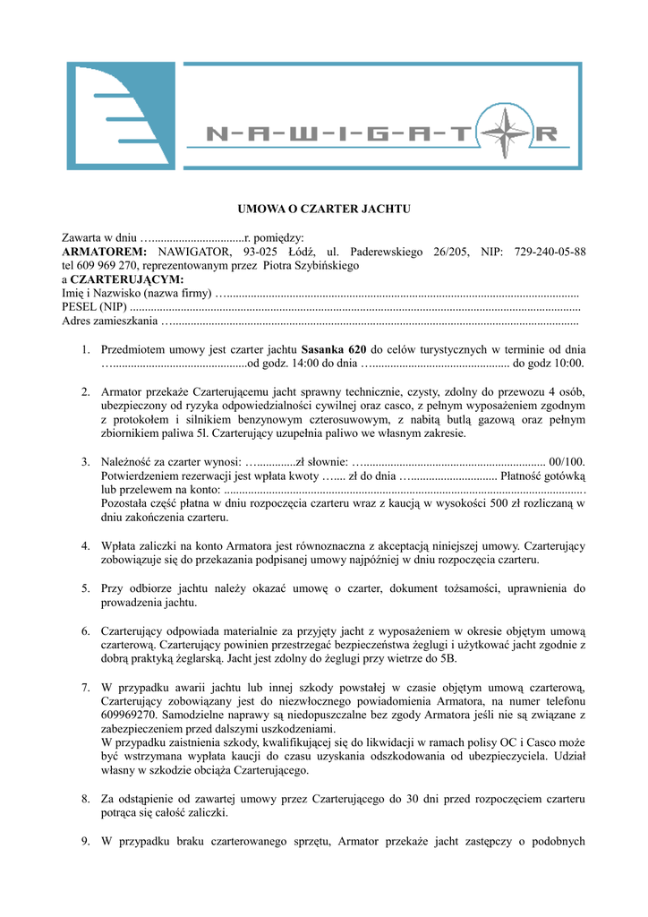 UMOWA O CZARTER JACHTU Zawarta w dniu …...............................r. pomiędzy: ARMATOREM: NAWIGATOR, 93-025 Łódź, ul. Paderewskiego 26/205, NIP: 729-240-05-88 tel 609 969 270, reprezentowanym przez Piotra Szybińskiego a CZARTERUJĄCYM: Imię i Nazwisko (nazwa firmy) …...................................................................................................................... PESEL (NIP) ....................................................................................................................................................... Adres zamieszkania …........................................................................................................................................ 1. Przedmiotem umowy jest czarter jachtu Sasanka 620 do celów turystycznych w terminie od dnia ….............................................od godz. 14:00 do dnia ….............................................. do godz 10:00. 2. Armator przekaże Czarterującemu jacht sprawny technicznie, czysty, zdolny do przewozu 4 osób, ubezpieczony od ryzyka odpowiedzialności cywilnej oraz casco, z pełnym wyposażeniem zgodnym z protokołem i silnikiem benzynowym czterosuwowym, z nabitą butlą gazową oraz pełnym zbiornikiem paliwa 5l. Czarterujący uzupełnia paliwo we własnym zakresie. 3. Należność za czarter wynosi: ….............zł słownie: …............................................................. 00/100. Potwierdzeniem rezerwacji jest wpłata kwoty ….... zł do dnia …............................. Płatność gotówką lub przelewem na konto: ......................................................................................................................... Pozostała część płatna w dniu rozpoczęcia czarteru wraz z kaucją w wysokości 500 zł rozliczaną w dniu zakończenia czarteru. 4. Wpłata zaliczki na konto Armatora jest równoznaczna z akceptacją niniejszej umowy. Czarterujący zobowiązuje się do przekazania podpisanej umowy najpóźniej w dniu rozpoczęcia czarteru. 5. Przy odbiorze jachtu należy okazać umowę o czarter, dokument tożsamości, uprawnienia do prowadzenia jachtu. 6. Czarterujący odpowiada materialnie za przyjęty jacht z wyposażeniem w okresie objętym umową czarterową. Czarterujący powinien przestrzegać bezpieczeństwa żeglugi i użytkować jacht zgodnie z dobrą praktyką żeglarską. Jacht jest zdolny do żeglugi przy wietrze do 5B. 7. W przypadku awarii jachtu lub innej szkody powstałej w czasie objętym umową czarterową, Czarterujący zobowiązany jest do niezwłocznego powiadomienia Armatora, na numer telefonu 609969270. Samodzielne naprawy są niedopuszczalne bez zgody Armatora jeśli nie są związane z zabezpieczeniem przed dalszymi uszkodzeniami. W przypadku zaistnienia szkody, kwalifikującej się do likwidacji w ramach polisy OC i Casco może być wstrzymana wypłata kaucji do czasu uzyskania odszkodowania od ubezpieczyciela. Udział własny w szkodzie obciąża Czarterującego. 8. Za odstąpienie od zawartej umowy przez Czarterującego do 30 dni przed rozpoczęciem czarteru potrąca się całość zaliczki. 9. W przypadku braku czarterowanego sprzętu, Armator przekaże jacht zastępczy o podobnych parametrach lub dokona zwrotu wpłaconej zaliczki powiększonej o kwotę 100 zł. 10. Przekazanie jachtu Czarterującemu nastąpi dnia …............................. od godz. 14:00 a zdanie jachtu przez Czarterującego do godziny 10:00 w dniu zakończenia czarteru w Porcie Róża Wiatrów 11-600 Węgorzewo, ul Wodociągowa 1. Czarterujący zapłaci karę umowną w wysokości 300 zł, za każdą rozpoczętą pełną dobę przekroczenia terminu zwrotu jachtu. 11. Czarterujący zobowiązany jest zwrócić Armatorowi jacht sprawny technicznie, czysty i sklarowany, wraz z kompletnym wyposażeniem i uzupełnionym paliwem do silnika. W przypadku stwierdzenia uszkodzeń jachtu, bądź wyposażenia, Armator uprawniony jest do zatrzymania kwoty kaucji i zaliczenia jej na poczet kosztów naprawy. W przypadku zwrotu jachtu brudnego, niesklarowanego naliczona zostanie dodatkowa opłata za czyszczenie uzależniona od stanu jachtu. Armator uprawniony jest do dochodzenia szkody w wysokości przekraczającej kwotę kaucji. 12. Załącznik do niniejszej umowy stanowi "Protokół zdawczo-odbiorczy " sporządzony w dniu rozpoczęcia czarteru. 13. Zmiany niniejszej umowy wymagają dla swej ważności formy pisemnej. 14. Ewentualne spory mogące wyniknąć w związku z realizacją niniejszej umowy będą rozstrzygane przez właściwy Sąd dla Armatora. 15. Umowę spisano w dwóch jednobrzmiących egzemplarzach po jednym dla każdej ze stron. 16. W kwestiach nieuregulowanych niniejszą umową zastosowanie mają przepisy kodeksu cywilnego. Czarterujący Armator