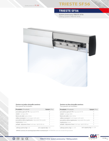 TRIESTE SF56 Quality product of TRIESTE SF56 System przesuwny TRIESTE SF56 Sliding system TRIESTE SF56 Zestaw na dwa skrzydła zawiera: Two panels set includes: Zestaw na jedno skrzydło zawiera: One panel set includes: Produkt / Produkt Sztuk / Pcs Produkt / Produkt Sztuk / Pcs prowadnica górna SF-TR / top track SF-TR 1 prowadnica górna SF-TR / top track SF-TR 1 wózek / carriage roller 2 wózek / carriage roller 4 klamra do szkła / glass clamp 2 klamra do szkła / glass clamp 4 odbój z zaczepem / end stopper with catch 2 odbój z zaczepem / end stopper with catch 4 prowadnica dolna regulowana / adjustable floor guide 1 prowadnica dolna regulowana / adjustable floor guide 2 maskownica / cover 1 maskownica / cover 1 zaślepki - kpl.prawa i lewa / end caps- right & left set 1 zaślepki - kpl.prawa i lewa / end caps- right & left set 1 udźwig systemu (kg): 120 set’s capacity (kg): 120 udźwig systemu (kg): 2 x 120 set’s capacity (kg): 2 x 120 UWAGA: zestawy nie zawierają kątowników montażowych / ATTENTION: sets not include fixing brackets TRIESTE SF56 System przesuwny / Sliding system 17/III/ 1 TRIESTE SF56 Quality product of TRIESTE SF56 System przesuwny TRIESTE SF56 Sliding system TRIESTE SF56 SF-TR Prowadnica górna SF-TR Top track SF56-CLAMP Klamra do szkła SF56-CLAMP Glass clamp SF-ROLLER Wózek SF-ROLLER Roller SF-STP Odbój z zaczepem SF-STP End stopper SF56-BRACKET Kątownik montażowy SF56-BRACKET Mounting bracket SF56-EC Zaślepka czołowa SF56-EC End cap SF56-COV Maskownica SF56-COV Cover ADJ-USS prowadnica dolna AJD-USS floor guide Kod zestawu Set’s code CDA/SF56-OS2500 CDA/SF56-OS3000 CDA/SF56-TS2500 CDA/SF56-TS3000 grubość szkła (mm): 10 ; 12 17/III/ 2 Zestaw Set Ilość skrzydeł Number of panels Długość (mm) Lenght (mm) Wykończenie Finish A 1 2500 imitacja stali nierdzewnej / imitation stainless steel B 1 3000 imitacja stali nierdzewnej / imitation stainless steel C 2 2500 imitacja stali nierdzewnej / imitation stainless steel D 2 3000 imitacja stali nierdzewnej / imitation stainless steel glass thickness (mm): 10 ; 12 TRIESTE SF56 System przesuwny / Sliding system TRIESTE SF56 Quality product of CDA/SF-TR Prowadnica górna Top track 41.5 19 16 38.5 Długość (mm) Lenght (mm) Wykończenie Finish CDA/SF-TR-2500 2500 aluminium anodowane anodized aluminium CDA/SF-TR-3000 3000 aluminium anodowane anodized aluminium Kod / Code materiał: aluminium material: aluminium CDA/SF-TR-FIX Prowadnica górna z panelem stałym Top track with fixed panel 19 35.5 41.5 12 16 20 61.5 Kod / Code CDA/SF-TR-FIX-2500 Długość (mm) Lenght (mm) Wykończenie Finish 2500 aluminium anodowane anodized aluminium materiał: aluminium TRIESTE SF56 System przesuwny / Sliding system material: aluminium 17/III/ 3 TRIESTE SF56 Quality product of CDA/DRM100 CDA/SF-ROLLER Wózek na łożskach kulkowych w obudowie z poliacetalu Carriage roller with ball bearing polyacetal encased 58.5 34.5 Kod / Code CDA/SF-ROLLER Materiał korpusu / Body’s material stal / steel CDA/SF56-CLAMP Klamra do szkła Glass clamp 37.5 14 M8 200 Kod / Code CDA/SF56-CLAMP materiał: aluminium 17/III/ 4 Wykończenie / Finish aluminium anodowane / anodized aluminium material: aluminium TRIESTE SF56 System przesuwny / Sliding system Quality product of TRIESTE SF56 CDA/SF-STP CDA/DRM100 Odbój z zaczepem End stopper with catch Kod / Code CDA/SF-STP CDA/ADJ-USS 30 Prowadnica dolna regulowana Bottom adjustable floor guide 50 23 8-13.6 Kod / Code Wykończenie / Finish CDA/ADJ-USS satyna / satin material: stainless steel materiał: satal nierdzewna CDA/SF56-COV 103.5 Maskownica / Cover Długość (mm) Lenght (mm) Wykończenie Finish CDA/SF56-COV-2500 2500 imitacja stali nierdzewnej imitation stainless steel CDA/SF56-COV-3000 3000 imitacja stali nierdzewnej imitation stainless steel Kod / Code materiał: aluminium TRIESTE SF56 System przesuwny / Sliding system material: aluminium 17/III/ 5 TRIESTE SF56 Quality product of CDA/DRM100 CDA/SF56-EC 43.5 Zaślepka boczna: prawa i lewa End cap: right & left 5 106 40 Kod / Code Typ / Type CDA/SF56-ECRH CDA/SF56-ECLH prawy / right materiał: PVC material: PVC lewy / left CDA/SF56-EC Zaślepka boczna obustronna Doubble side end cap 53 5 106 45 Kod / Code CDA/SF56-EC materiał: PVC material: PVC CDA/SF56-BRACKET Kątownik montażowy Mounting bracket 40 3 80 Kod / Code CDA/SF56-BRACKET wykończenie: satyna 17/III/ 6 Materiał / Material satal nierdzewna / stainless steel finish: satin TRIESTE SF56 System przesuwny / Sliding system TRIESTE SF56 Quality product of TRIESTE SF56 Widok: system przesuwny TRIETE SF56 View: sliding system TRIESTE SF56 SF-TR Prowadnica górna SF-TR Top track SF-ROLLER Wózek SF-ROLLER Roller SF-STP Odbój z zaczepem SF-STP End stopper SF56-BRACKET Kątownik montażowy SF56-BRACKET Mounting bracket SF56-CLAMP Klamra do szkła SF56-CLAMP Glass clamp 200 SF56-COV Maskownica SF56-COV Cover 23 10 SF56-EC Zaślepka czołowa SF56-EC End cap 50 ADJ-USS prowadnica dolna AJD-USS floor guide TRIESTE SF56 System przesuwny / Sliding system 17/III/ 7 TRIESTE SF56 Quality product of TRIESTE SF56 Przekrój: system przesuwny TRIESTE SF56 Section: sliding system TRIESTE SF56 45.5 19 48.5 19 3 SF56-BRACKET Kątownik montażowy SF56-BRACKET Mounting SF-TR Prowadnica górna SF-TR Top track SF-ROLLER Wózek SF-ROLLER Roller 41 41 3 SF-TR Prowadnica górna SF-TR Top track 28 28 37.5 37.5 37 37 15 15 SF-ROLLER Wózek SF-ROLLER Roller SF56-COVER Maskownica SF56-COVER Cover SF56-CLAMP Klamra do szkła SF56-CLAMP Glass clamp Height of glass panel = clear opening +28 mm-10 mm Wysokość panela szklanego = światło gotowego przejścia +28 mm-10 mm SF56-CLAMP Klamra do szkła SF56-CLAMP Glass clamp Height of glass panel = clear opening +28 mm-10 mm Wysokość panela szklanego = światło gotowego przejścia +28 mm-10 mm SF56-COVER Maskownica SF56-COVER Cover ADJ-USS prowadnica dolna AJD-USS floor guide 10 10 23 23 ADJ-USS prowadnica dolna AJD-USS floor guide 30 30 17/III/ 8 TRIESTE SF56