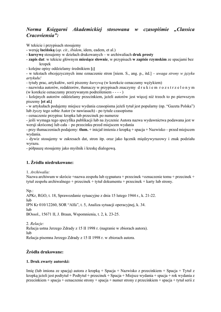 Norma Księgarni Cracoviensia”: Akademickiej stosowana w czasopiśmie „Classica W tekście i przypisach stosujemy - wersję łacińską (op. cit., ibidem, idem, eadem, et al.) - kursywę stosujemy w dziełach drukowanych – w archiwaliach druk prosty - zapis dat: w tekście głównym miesiące słownie, w przypisach w zapisie rzymskim ze spacjami bez kropek - kolejne opisy oddzielamy średnikiem [;] - w tekstach obcojęzycznych inne oznaczenie stron [niem. S., ang. p., itd.] – uwaga strony w języku artykułu! - tytuły prac, artykułów, serii piszemy kursywą (w korekcie oznaczamy wężykiem) - nazwiska autorów, redaktorów, tłumaczy w przypisach znaczymy d r u k i e m r o z s t r z e l o n y m (w korekcie oznaczamy przerywanym podreśleniem - - - - ) - kolejnych autorów oddzielamy przecinkiem, jeżeli autorów jest więcej niż trzech to po pierwszym piszemy [et al.] - w artykułach podajemy miejsce wydania czasopisma jeżeli tytuł jest popularny (np. “Gazeta Polska”) lub życzy tego sobie Autor (w nawiasach) - po tytule czasopisma - oznaczenie przypisu: kropka lub przecinek po numerze - jeśli wymaga tego specyfika publikacji lub na życzenie Autora nazwa wydawnictwa podawana jest w wersji skróconej lub cała – po przecinku przed miejscem wydania - przy tłumaczeniach podajemy: tłum. + inicjał imienia z kropką + spacja + Nazwisko – przed miejscem wydania. - dywiz stosujemy w zakresach dat, stron itp. oraz jako łącznik międzywyrazowy i znak podziału wyrazu. - półpauzę stosujemy jako myślnik i kreskę dialogową. 1. Źródła niedrukowane: 1. Archiwalia: Nazwa archiwum w skrócie +nazwa zespołu lub sygnatura + przecinek +oznaczenie tomu + przecinek + tytuł zespołu archiwalnego + przecinek + tytuł dokumentu + przecinek + karty lub strony. Np.: APKr, RGO, t. 18, Sprawozdanie sytuacyjne z dnia 15 lutego 1944 r., k. 21-22. lub IPN Kr 010/12260, SOR “Alfa”, t. 5, Analiza sytuacji operacyjnej, k. 34. lub BOssol., 15671 II, J. Braun, Wspomnienia, t. 2, k. 23-25. 2. Relacje: Relacja ustna Jerzego Zdrady z 15 II 1998 r. (nagranie w zbiorach autora). lub Relacja pisemna Jerzego Zdrady z 15 II 1998 r. w zbiorach autora. Źródła drukowane: 1. Druk zwarty autorski: Imię (lub imiona ze spacją) autora z kropką + Spacja + Nazwisko z przecinkiem + Spacja + Tytuł z kropką jeżeli jest podtytuł + Podtytuł + przecinek + Spacja + Miejsce wydania + spacja + rok wydania z przecinkiem + spacja + oznaczenie strony + spacja + numer strony z przecinkiem + spacja + tytuł serii z przecinkiem + spacja + oznaczenie i numer serii z kropką + spacja + tytuł podserii z przecinkiem + spacja + oznaczenie i numer serii Np. M. E l i a d e, Traktat o historii religii, Warszawa 1966, s. 155. lub J. M. R o k i c k i, Byle do przodu. Wspomnienia z przyszłości, [w:] Zeszyty Naukowe UJ, 1145. Prace Psychologiczne, z. 35, Kraków 1995, s. 34, 2. Praca zbiorowa: Tytuł z kropką + spacja + Podtytuł z przecinkiem + spacja + oznaczenie odpowiedzialności redakcyjnej (red., pod red., ed., hrsg. itd.) i dalej tak samo jak wyżej (zwarty druk autorski) Np. Zawsze razem. Szkice współczesne, red. Z. W n u k - L i p i ń s k i, Kraków 1995, s. 34-45, Zeszyty Naukowe UJ, 1145. Prace Psychologiczne, z. 35. 3. Artykuł w pracy zbiorowej: Imię (lub imiona ze spacją) autora z kropką + Spacja + Nazwisko z przecinkiem + Spacja + Tytuł z kropką jeżeli jest podtytuł + Podtytuł + przecinek + Spacja + odesłanie do pracy zbiorowej [w:] i dalej jak wyżej (druk zwarty autorski) Np. J. M. R o k i c k i, Byle do przodu. Wspomnienia z przyszłości, [w:] Zawsze razem. Szkice współczesne, red. Z. W n u k - L i p i ń s k i, Kraków 1995, s. 34-45, Zeszyty Naukowe UJ, 1145. Prace Psychologiczne, z. 35. 4. Artykuł w czasopiśmie: Imię (lub imiona ze spacją) autora z kropką + Spacja + Nazwisko z przecinkiem + Spacja + Tytuł z kropką jeżeli jest podtytuł + Podtytuł + przecinek + Spacja + Tytuł czasopisma lub gazety w cudzysłowiu + W nawiasach półokrągłych miejsce wydania czasopisma + spacja + oznaczenie rocznika z przecinkiem [R. 18,] + spacja + oznaczenie roku z przecinkiem [1985,] + spacja + oznaczenie numeru z przecinkiem [nr 5,] + spacja + oznaczenie strony z kropką Uwaga: między tytułem czasopisma a rocznikiem lub rokiem bez przecinka! Np. J. M. R o k i c k i, Byle do przodu. Wspomnienia z przyszłości, “Wojskowy Przegląd Historyczny” (Warszawa) R. 18, 1995, nr 2, s. 28. Miejsce wydania czasopisma podajemy wtedy, kiedy tytuł jest popularny np. “Gazeta Polska” (Lwów) lub np. J. M. R o k i c k i, Byle do przodu. Wspomnienia z przyszłości, “Wojskowy Przegląd Historyczny” 1995, nr 2, s. 28. lub np. J. M. R o k i c k i, Byle do przodu. Wspomnienia z przyszłości, “Wojskowy Przegląd Historyczny” R. 18, 1995, z. 2, s. 28. lub np. J. M. R o k i c k i, Byle do przodu. Wspomnienia z przyszłości, “Wojskowy Przegląd Historyczny” Vol. 18, 1995, nr 2, s. 28. np. J. M. R o k i c k i, Byle do przodu. Wspomnienia z przyszłości, “Gazeta Wyborcza” 1995, nr 34, s. 28. Jeżeli konsekwentnie w pracy autor używa w dziennikach jedynie daty dziennej – można to uznać (np. “Gazeta Wyborcza” 2005, 24 XII. Przypis harwardzki [nazwisko autora pierwszego, nazwisko autora drugiego, rok, s. ....] inicjały imion jedynie gdy nazwiska się powtarzają wielu autorów oznaczamy: pierwszy et al. w bibliografii tak samo jak w układzie tradycyjnym z wyjątkiem roku w nawiasach kwadratowych [] po autorze, a przed tytułem w bibliografii kolejne prace tego samego autora (-ów) oznaczamy kolejnymi literami alfabetu po roku wydania Przypis internetowy: Autor, tytuł, ew. nazwa strony, [on-line], www.itd...... – 31 X 2007. DO AUTORÓW Szanowni Państwo, poniżej zamieszczamy ogólne i szczegółowe zasady zapisywania i formatowania tekstów, jakie stosujemy w naszym wydawnictwie. Uprzejmie prosimy o zapoznanie się z nimi. Zastosowanie większości z nich nie powinn