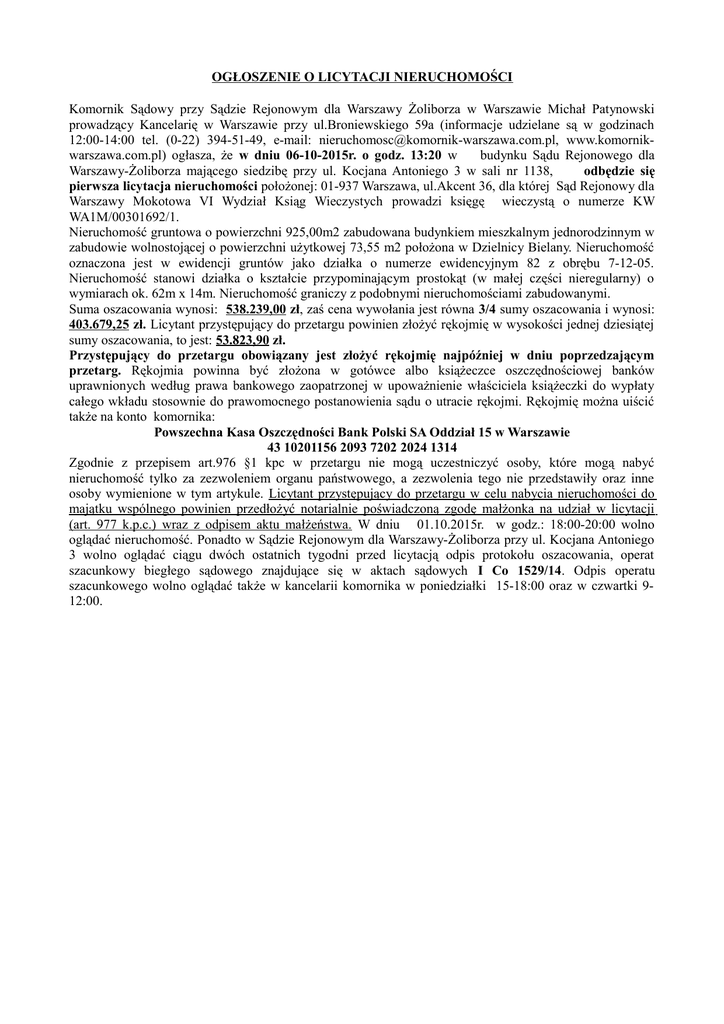 OGŁOSZENIE O LICYTACJI NIERUCHOMOŚCI Komornik Sądowy przy Sądzie Rejonowym dla Warszawy Żoliborza w Warszawie Michał Patynowski prowadzący Kancelarię w Warszawie przy ul.Broniewskiego 59a (informacje udzielane są w godzinach 12:00-14:00 tel. (0-22) 394-51-49, e-mail: [email protected], www.komornikwarszawa.com.pl) ogłasza, że w dniu 06-10-2015r. o godz. 13:20 w budynku Sądu Rejonowego dla Warszawy-Żoliborza mającego siedzibę przy ul. Kocjana Antoniego 3 w sali nr 1138, odbędzie się pierwsza licytacja nieruchomości położonej: 01-937 Warszawa, ul.Akcent 36, dla której Sąd Rejonowy dla Warszawy Mokotowa VI Wydział Ksiąg Wieczystych prowadzi księgę wieczystą o numerze KW WA1M/00301692/1. Nieruchomość gruntowa o powierzchni 925,00m2 zabudowana budynkiem mieszkalnym jednorodzinnym w zabudowie wolnostojącej o powierzchni użytkowej 73,55 m2 położona w Dzielnicy Bielany. Nieruchomość oznaczona jest w ewidencji gruntów jako działka o numerze ewidencyjnym 82 z obrębu 7-12-05. Nieruchomość stanowi działka o kształcie przypominającym prostokąt (w małej części nieregularny) o wymiarach ok. 62m x 14m. Nieruchomość graniczy z podobnymi nieruchomościami zabudowanymi. Suma oszacowania wynosi: 538.239,00 zł, zaś cena wywołania jest równa 3/4 sumy oszacowania i wynosi: 403.679,25 zł. Licytant przystępujący do przetargu powinien złożyć rękojmię w wysokości jednej dziesiątej sumy oszacowania, to jest: 53.823,90 zł. Przystępujący do przetargu obowiązany jest złożyć rękojmię najpóźniej w dniu poprzedzającym przetarg. Rękojmia powinna być złożona w gotówce albo książeczce oszczędnościowej banków uprawnionych według prawa bankowego zaopatrzonej w upoważnienie właściciela książeczki do wypłaty całego wkładu stosownie do prawomocnego postanowienia sądu o utracie rękojmi. Rękojmię można uiścić także na konto komornika: Powszechna Kasa Oszczędności Bank Polski SA Oddział 15 w Warszawie 43 10201156 2093 7202 2024 1314 Zgodnie z przepisem art.976 §1 kpc w przetargu nie mogą uczestniczyć osoby, które mogą nabyć nieruchomość tylko za zezwoleniem organu państwowego, a zezwolenia tego nie przedstawiły oraz inne osoby wymienione w tym artykule. Licytant przystępujący do przetargu w celu nabycia nieruchomości do majątku wspólnego powinien przedłożyć notarialnie poświadczoną zgodę małżonka na udział w licytacji (art. 977 k.p.c.) wraz z odpisem aktu małżeństwa. W dniu 01.10.2015r. w godz.: 18:00-20:00 wolno oglądać nieruchomość. Ponadto w Sądzie Rejonowym dla Warszawy-Żoliborza przy ul. Kocjana Antoniego 3 wolno oglądać ciągu dwóch ostatnich tygodni przed licytacją odpis protokołu oszacowania, operat szacunkowy biegłego sądowego znajdujące się w aktach sądowych I Co 1529/14. Odpis operatu szacunkowego wolno oglądać także w kancelarii komornika w poniedziałki 15-18:00 oraz w czwartki 912:00.