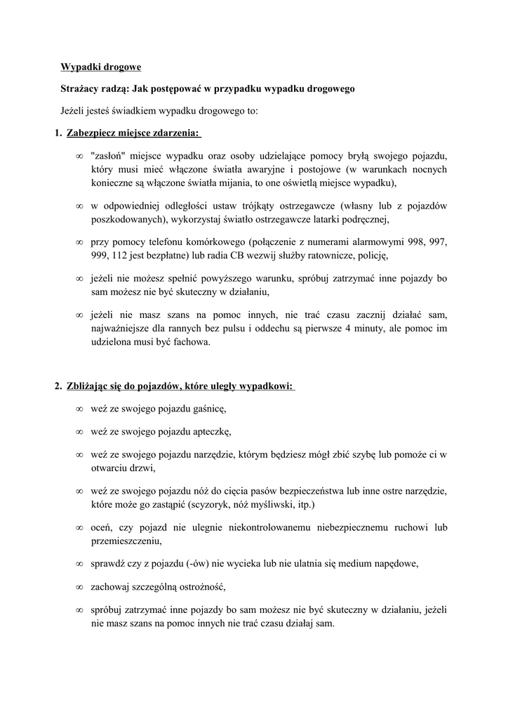 Wypadki drogowe Strażacy radzą: Jak postępować w przypadku wypadku drogowego Jeżeli jesteś świadkiem wypadku drogowego to: 1. Zabezpiecz miejsce zdarzenia: • "zasłoń" miejsce wypadku oraz osoby udzielające pomocy bryłą swojego pojazdu, który musi mieć włączone światła awaryjne i postojowe (w warunkach nocnych konieczne są włączone światła mijania, to one oświetlą miejsce wypadku), • w odpowiedniej odległości ustaw trójkąty ostrzegawcze (własny lub z pojazdów poszkodowanych), wykorzystaj światło ostrzegawcze latarki podręcznej, • przy pomocy telefonu komórkowego (połączenie z numerami alarmowymi 998, 997, 999, 112 jest bezpłatne) lub radia CB wezwij służby ratownicze, policję, • jeżeli nie możesz spełnić powyższego warunku, spróbuj zatrzymać inne pojazdy bo sam możesz nie być skuteczny w działaniu, • jeżeli nie masz szans na pomoc innych, nie trać czasu zacznij działać sam, najważniejsze dla rannych bez pulsu i oddechu są pierwsze 4 minuty, ale pomoc im udzielona musi być fachowa. 2. Zbliżając się do pojazdów, które uległy wypadkowi: • weź ze swojego pojazdu gaśnicę, • weź ze swojego pojazdu apteczkę, • weź ze swojego pojazdu narzędzie, którym będziesz mógł zbić szybę lub pomoże ci w otwarciu drzwi, • weź ze swojego pojazdu nóż do cięcia pasów bezpieczeństwa lub inne ostre narzędzie, które może go zastąpić (scyzoryk, nóż myśliwski, itp.) • oceń, czy pojazd nie ulegnie niekontrolowanemu niebezpiecznemu ruchowi lub przemieszczeniu, • sprawdź czy z pojazdu (-ów) nie wycieka lub nie ulatnia się medium napędowe, • zachowaj szczególną ostrożność, • spróbuj zatrzymać inne pojazdy bo sam możesz nie być skuteczny w działaniu, jeżeli nie masz szans na pomoc innych nie trać czasu działaj sam. 3. Wykonaj następujące czynności jeżeli jesteś przy pojazdach: • sprawdź, które drzwi otwierają się i ułatwi to kontakt z poszkodowanymi, • jeżeli drzwi nie dają się otworzyć, zbij szybę, w taki sposób, aby nie powodować dodatkowych urazów u poszkodowanych, • zbijając szyby zachowaj szczególną ostrożność - pamiętaj, że szkło hartowane (najczęściej szyby boczne) rozpada się na małe ostre kawałki, natomiast szyby klejone (zawsze szyba przednia i w większości przypadków tylna) pękają, ale pozostają zwykle w jednym elemencie, • dostań się do środka pojazdu, wyjmij kluczyki ze stacyjki, ale zostaw je w samochodzie, oceń czy dalsze czynności ratownicze na pewno nie zagrażają twojemu zdrowiu i życiu, • w przypadku jeśli samochód stanie w płomieniach, użyj dostępnej Ci gaśnicy samochodowej - nie obawiaj się zbiornik paliwa nie eksploduje, • jeśli stwierdzisz u poszkodowanych brak oznak pulsu i oddechu przystąp do ożywiania, najskuteczniejsze działania przedmedyczne wykonasz z dala od uszkodzonych pojazdów ewakuując poszkodowanych. Nie rób tego jednak, jeżeli nie umiesz zrobić tego prawidłowo, ponieważ możesz pogłębić urazy, a nawet spowodować śmierć poszkodowanego. 4. Zaalarmuj służby ratownicze, a w przypadku gdy: • samochód nie jest narażony na niekontrolowany ruch lub przemieszczenie • nie ma wycieków paliwa • odłączona jest instalacja elektryczna pojazdu • miejsce zdarzenia jest odpowiednio zabezpieczone • poszkodowani dają oznaki życia, ale są uwięzieni w pojeździe, - przystąp do udzielania im pierwszej pomocy (opatrzenia ran, tamowania krwotoków, ustabilizowania kręgosłupa i kończyn ). Kontroluj oddech i czynności serca poszkodowanych, okryj ich kocem lub odzieżą w celu uniknięcia pogłębienia wstrząsu. Zostań przy poszkodowanych do czasu przybycia ratowników. Pamiętaj aby wszystkie czynności wykonywać z rozwagą, bez niepotrzebnych emocji i dodatkowych zniszczeń, do czasu aż przybędą specjalistyczne służby ratownicze. Pamiętaj, że Ty również możesz się znaleźć w podobnej sytuacji. Materiał opracowali: st. kpt. mgr inż. Aleksander Adamski, kpt. mgr inż. Dariusz Dąbek Katedra Techniki Pożarniczej, Zakład Ratownictwa Technicznego, Szkoła Główna Służby Pożarniczej w Warszawie