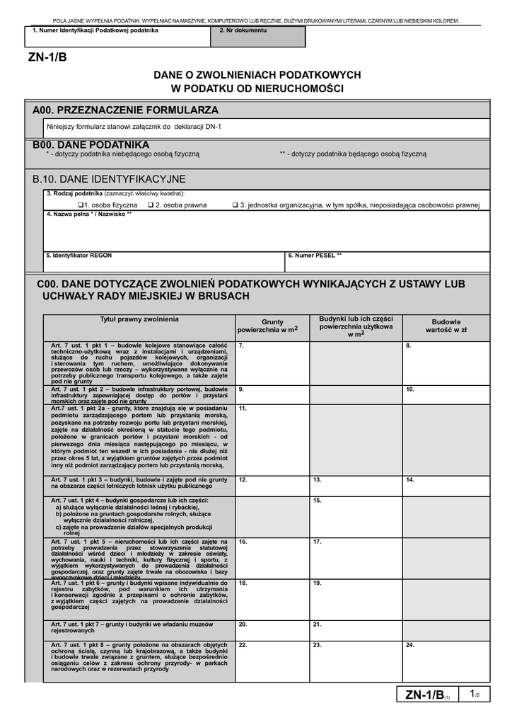 POLA JASNE WYPEŁNIA PODATNIK. WYPEŁNIAĆ NA MASZYNIE, KOMPUTEROWO LUB RĘCZNIE, DUŻYMI DRUKOWANYMI LITERAMI, CZARNYM LUB NIEBIESKIM KOLOREM. 1. Numer Identyfikacji Podatkowej podatnika 2. Nr dokumentu ZN-1/B DANE O ZWOLNIENIACH PODATKOWYCH W PODATKU OD NIERUCHOMOŚCI A00. PRZEZNACZENIE FORMULARZA Niniejszy formularz stanowi załącznik do deklaracji DN-1 B00. DANE PODATNIKA * - dotyczy podatnika niebędącego osobą fizyczną ** - dotyczy podatnika będącego osobą fizyczną B.10. DANE IDENTYFIKACYJNE 3. Rodzaj podatnika (zaznaczyć właściwy kwadrat): q1. osoba fizyczna q 2. osoba prawna q 3. jednostka organizacyjna, w tym spółka, nieposiadająca osobowości prawnej 4. Nazwa pełna * / Nazwisko ** 5. Identyfikator REGON 6. Numer PESEL ** C00. DANE DOTYCZĄCE ZWOLNIEŃ PODATKOWYCH WYNIKAJĄCYCH Z USTAWY LUB UCHWAŁY RADY MIEJSKIEJ W BRUSACH Tytuł prawny zwolnienia Grunty powierzchnia w m2 Budynki lub ich części powierzchnia użytkowa w m2 Budowle wartość w zł Art. 7 ust. 1 pkt 1 – budowle kolejowe stanowiące całość techniczno-użytkową wraz z instalacjami i urządzeniami, służące do ruchu pojazdów kolejowych, organizacji i sterowania tym ruchem, umożliwiające dokonywanie przewozów osób lub rzeczy – wykorzystywane wyłącznie na potrzeby publicznego transportu kolejowego, a także zajęte pod nie grunty Art. 7 ust. 1 pkt 2 – budowle infrastruktury portowej, budowle infrastruktury zapewniającej dostęp do portów i przystani morskich oraz zajęte pod nie grunty Art.7 ust. 1 pkt 2a - grunty, które znajdują się w posiadaniu podmiotu zarządzającego portem lub przystanią morską, pozyskane na potrzeby rozwoju portu lub przystani morskiej, zajęte na działalność określoną w statucie tego podmiotu, położone w granicach portów i przystani morskich - od pierwszego dnia miesiąca następującego po miesiącu, w którym podmiot ten wszedł w ich posiadanie - nie dłużej niż przez okres 5 lat, z wyjątkiem gruntów zajętych przez podmiot inny niż podmiot zarządzający portem lub przystanią morską, 7. 8. 9. 10. Art. 7 ust. 1 pkt 3 – budynki, budowle i zajęte pod nie grunty na obszarze części lotniczych lotnisk użytku publicznego 12. Art. 7 ust. 1 pkt 4 – budynki gospodarcze lub ich części: a) służące wyłącznie działalności leśnej i rybackiej, b) położone na gruntach gospodarstw rolnych, służące wyłącznie działalności rolniczej, c) zajęte na prowadzenie działów specjalnych produkcji rolnej Art. 7 ust. 1 pkt 5 – nieruchomości lub ich części zajęte na potrzeby prowadzenia przez stowarzyszenia statutowej działalności wśród dzieci i młodzieży w zakresie oświaty, wychowania, nauki i techniki, kultury fizycznej i sportu, z wyjątkiem wykorzystywanych do prowadzenia działalności gospodarczej, oraz grunty zajęte trwale na obozowiska i bazy wypoczynkowe dzieci i młodzieży Art. 7 ust. 1 pkt 6 – grunty i budynki wpisane indywidualnie do rejestru zabytków, pod warunkiem ich utrzymania i konserwacji zgodnie z przepisami o ochronie zabytków, z wyjątkiem części zajętych na prowadzenie działalności gospodarczej 11. 13. 14. 15. 16. 17. 18. 19. Art. 7 ust. 1 pkt 7 – grunty i budynki we władaniu muzeów rejestrowanych 20. 21. Art. 7 ust. 1 pkt 8 – grunty położone na obszarach objętych ochroną ścisłą, czynną lub krajobrazową, a także budynki i budowle trwale związane z gruntem, służące bezpośrednio osiąganiu celów z zakresu ochrony przyrody- w parkach narodowych oraz w rezerwatach przyrody 22. 23. 24. ZN-1/B (1) 1/2 POLA JASNE WYPEŁNIA PODATNIK. WYPEŁNIAĆ NA MASZYNIE, KOMPUTEROWO LUB RĘCZNIE, DUŻYMI DRUKOWANYMI LITERAMI, CZARNYM LUB NIEBIESKIM KOLOREM. Tytuł prawny zwolnienia Art. 7 ust. 1 pkt 8a będące własnością Skarbu Państwa: grunty pokryte wodami jezior o ciągłym dopływie lub odpływie wód powierzchniowych oraz grunty zajęte pod sztuczne zbiorniki wodne, Grunty powierzchnia w m2 Budynki lub ich części powierzchnia użytkowa w m2 Budowle wartość w zł 25. Art. 7 ust. 1 pkt 9 budowle wałów ochronnych, grunty pod wałami ochronnymi i położone w międzywalach, z wyjątkiem zajętych na prowadzenie działalności gospodarczej przez inne podmioty niż spółki wodne, ich związki oraz związki wałowe 26. Art. 7 ust. 1 pkt 10 – grunty stanowiące nieużytki, użytki ekologiczne, grunty zadrzewione i zakrzewione, z wyjątkiem zajętych na prowadzenie działalności gospodarczej Art. 7 ust. 1 pkt 11 – grunty stanowiące działki przyzagrodowe członków rolniczych spółdzielni produkcyjnych, którzy spełniają jeden z warunków: a) osiągnęli wiek emerytalny, b) są inwalidami zaliczonymi do I albo II grupy, c) są niepełnosprawnymi o znacznym lub umiarkowanym stopniu niepełnosprawności, d) są osobami całkowicie niezdolnymi do pracy w gospodarstwie rolnym albo niezdolnymi do samodzielnej egzystencji Art. 7 ust. 1 pkt 12 – budynki położone na terenie rodzinnych ogrodów działkowych, nieprzekraczające norm powierzchni ustalonych w przepisach Prawa budowlanego dla altan i obiektów gospodarczych, z wyjątkiem zajętych na działalność gospodarczą 28. 27. 29. 30. Art. 7 ust. 1 pkt 13 - budynki i budowle nowo wybudowane bądź zmodernizowane, oddane do użytkowania, wykorzystywane przez grupę producentów rolnych na działalność statutową, po uzyskaniu wpisu do rejestru grup – w okresie 5 lat od dnia uzyskania wpisu grupy do rejestru 31. 32. Art. 7 ust.1 pkt 14 – nieruchomości lub ich części zajęte na prowadzenie nieodpłatnej statutowej działalności pożytku publicznego przez organizacje pożytku publicznego Art. 7 ust. 2 pkt 1 – uczelnie; zwolnienie nie dotyczy przedmiotów opodatkowania zajętych na działalność gospodarczą . 33. 34. 35. 36. 37. 38. Art. 7 ust. 2 pkt 2 – szkoły, placówki, zakłady kształcenia i placówki doskonalenia nauczycieli – publiczne i niepubliczne, oraz organy prowadzące te szkoły, placówki i zak
