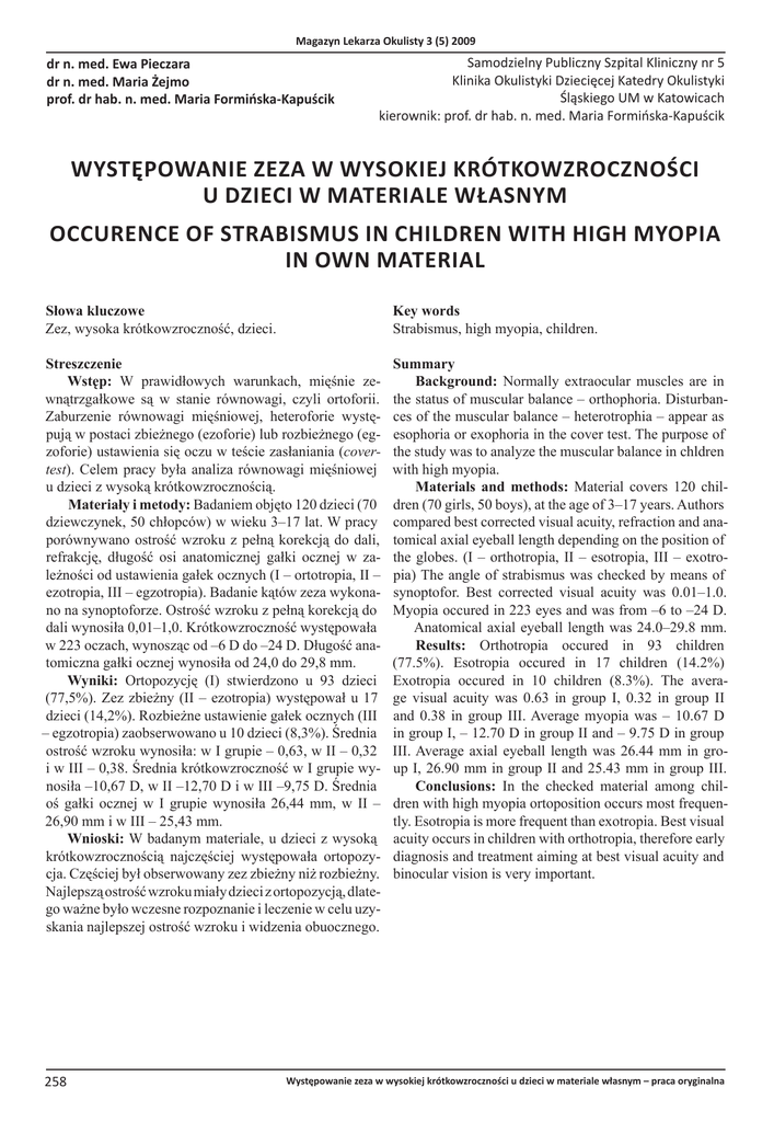 Magazyn Lekarza Okulisty 3 (5) 2009 dr n. med. Ewa Pieczara dr n. med. Maria Żejmo prof. dr hab. n. med. Maria Formińska-Kapuścik Samodzielny Publiczny Szpital Kliniczny nr 5 Klinika Okulistyki Dziecięcej Katedry Okulistyki Śląskiego UM w Katowicach kierownik: prof. dr hab. n. med. Maria Formińska-Kapuścik Występowanie zeza w wysokiej krótkowzroczności u dzieci w materiale własnym Occurence of strabismus in children with high myopia in own material Słowa kluczowe Zez, wysoka krótkowzroczność, dzieci. Key words Strabismus, high myopia, children. Streszczenie Wstęp: W prawidłowych warunkach, mięśnie zewnątrzgałkowe są w stanie równowagi, czyli ortoforii. Zaburzenie równowagi mięśniowej, heteroforie występują w postaci zbieżnego (ezoforie) lub rozbieżnego (egzoforie) ustawienia się oczu w teście zasłaniania (covertest). Celem pracy była analiza równowagi mięśniowej u dzieci z wysoką krótkowzrocznością. Materiały i metody: Badaniem objęto 120 dzieci (70 dziewczynek, 50 chłopców) w wieku 3–17 lat. W pracy porównywano ostrość wzroku z pełną korekcją do dali, refrakcję, długość osi anatomicznej gałki ocznej w zależności od ustawienia gałek ocznych (I – ortotropia, II – ezotropia, III – egzotropia). Badanie kątów zeza wykonano na synoptoforze. Ostrość wzroku z pełną korekcją do dali wynosiła 0,01–1,0. Krótkowzroczność występowała w 223 oczach, wynosząc od –6 D do –24 D. Długość anatomiczna gałki ocznej wynosiła od 24,0 do 29,8 mm. Wyniki: Ortopozycję (I) stwierdzono u 93 dzieci (77,5%). Zez zbieżny (II – ezotropia) występował u 17 dzieci (14,2%). Rozbieżne ustawienie gałek ocznych (III – egzotropia) zaobserwowano u 10 dzieci (8,3%). Średnia ostrość wzroku wynosiła: w I grupie – 0,63, w II – 0,32 i w III – 0,38. Średnia krótkowzroczność w I grupie wynosiła –10,67 D, w II –12,70 D i w III –9,75 D. Średnia oś gałki ocznej w I grupie wynosiła 26,44 mm, w II – 26,90 mm i w III – 25,43 mm. Wnioski: W badanym materiale, u dzieci z wysoką krótkowzrocznością najczęściej występowała ortopozycja. Częściej był obserwowany zez zbieżny niż rozbieżny. Najlepszą ostrość wzroku miały dzieci z ortopozycją, dlatego ważne było wczesne rozpoznanie i leczenie w celu uzyskania najlepszej ostrość wzroku i widzenia obuocznego. Summary Background: Normally extraocular muscles are in the status of muscular balance – orthophoria. Disturbances of the muscular balance – heterotrophia – appear as esophoria or exophoria in the cover test. The purpose of the study was to analyze the muscular balance in chldren with high myopia. Materials and methods: Material covers 120 children (70 girls, 50 boys), at the age of 3–17 years. Authors compared best corrected visual acuity, refraction and anatomical axial eyeball length depending on the position of the globes. (I – orthotropia, II – esotropia, III – exotropia) The angle of strabismus was checked by means of synoptofor. Best corrected visual acuity was 0.01–1.0. Myopia occured in 223 eyes and was from –6 to –24 D. Anatomical axial eyeball length was 24.0–29.8 mm. Results: Orthotropia occured in 93 children (77.5%). Esotropia occured in 17 children (14.2%) Exotropia occured in 10 children (8.3%). The average visual acuity was 0.63 in group I, 0.32 in group II and 0.38 in group III. Average myopia was – 10.67 D in group I, – 12.70 D in group II and – 9.75 D in group III. Average axial eyeball length was 26.44 mm in group I, 26.90 mm in group II and 25.43 mm in group III. Conclusions: In the checked material among children with high myopia ortoposition occurs most frequently. Esotropia is more frequent than exotropia. Best visual acuity occurs in children with orthotropia, therefore early diagnosis and treatment aiming at best visual acuity and binocular vision is very important. 258 Występowanie zeza w wysokiej krótkowzroczności u dzieci w materiale własnym – praca oryginalna