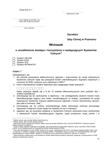 Załącznik nr 1 …………………………………… miejscowość i data ………………………………………………………… numer PESEL lub ID SISC 1 lub numer NIP, EORI lub ID SISC 2 ………………………………………………………… imię i nazwisko Dyrektor Izby Celnej w Poznaniu Wniosek o umożliwienie dostępu i korzystania z następujących Systemów Celnych 3 – System CELINA – System ECS – System ICS – System INTRASTAT Część I 4 Oświadczam, że: 1. dla potrzeb przesyłania elektronicznych zgłoszeń i dokumentów do wyżej wskazanych Systemów Celnych będę się posługiwał kodem identyfikacyjnym (loginem) tożsamym z numerem ID SISC nadanym przy rejestracji w SISC 5; 2. moim indywidualnym hasłem startowym jest następujące hasło awaryjne 6: Hasło awaryjne składa się z 8 do 12 znaków alfanumerycznych (bez polskich liter i znaków specjalnych. 3. zobowiązuję się do zachowania w tajemnicy i nie udostępniania osobom trzecim kodu identyfikacyjnego (loginu) oraz hasła, umożliwiających mi dostęp i przesyłanie do wyżej wskazanych Systemów Celnych elektronicznych zgłoszeń i innych dokumentów celnych, jako pliki w formacie „XML”; 4. zobowiązuję się do zmiany indywidualnego hasła startowego podczas pierwszego logowania i kolejnych zmian hasła nie rzadziej niż raz w miesiącu; 5. zgadzam się, że wszystkie działania w Systemach Celnych wykonane przez użytkownika o wskazanym kodzie identyfikacyjnym (loginie), będą przypisane mojej osobie i w 1 Należy wpisać, gdy wniosek składa osoba fizyczna; Należy wpisać, gdy wniosek składa podmiot; 3 Ilekroć jest mowa o Systemach Celnych należy rozumieć System CELINA, ECS, ICS i/lub INTRASTAT. Wybrane systemy należy oznaczyć symbolem x ; 4 Część I należy wypełnić wyłącznie w przypadku, gdy wnioskodawca przed dniem wejścia w życie „Instrukcji e-Klient Służby Celnej” nie był zarejestrowany w Podsystemie Danych Referencyjnych (PDR); 5 Dla osób posiadających numer PESEL będzie to ten numer, poprzedzony literami PL, do którego zostaną dodane cztery cyfry „0” (łącznie 17 znaków). Przykład: osoba posiadająca PESEL 11020300044 otrzyma ID SISC PL110203000440000. Dla osób nieposiadających numeru PESEL będzie to 15-znakowy numer poprzedzony literami PL (łącznie 17 znaków). 6 Hasło awaryjne ustalane jest w celu realizacji w drodze telefonicznej procedury awaryjnej, związanej z przywracaniem w PDR dostępu do Systemów Celnych. 2 12 przypadku stwierdzenia przez administratora udostępnienia tego loginu i hasła osobom trzecim, zostanie mi cofnięte uprawnienie do przesyłania elektronicznych zgłoszeń i dokumentów do Systemów Celnych; 6. w celu realizacji w drodze telefonicznej procedury awaryjnej, związanej z przywracaniem w Podsystemie Danych Referencyjnych (PDR) dostępu do Systemów Celnych, będę posługiwał się hasłem awaryjnym zdefiniowanym przy zakładaniu konta na PUESC. ……………………………………. podpis osoby składającej oświadczenie Część II 7 Oświadczam, że dane zawarte w przesyłanych do Systemów Celnych komunikatach, dla których wynik weryfikacji uzyskany za pomocą certyfikatu niekwalifikowanego SC 8 o numerze seryjnym ………………………………….….. jest pozytywny, będą traktowane jako dane podpisane przeze mnie, na równi ze złożeniem dla nich mojego odręcznego podpisu, stosownie do postanowień art. 199 ust. 2 RWKC9 i/lub § 12 rozporządzenia w sprawie zgłoszeń INTRASTAT 10. ……………………………………. podpis osoby składającej oświadczenie Część III 11 1. Informuję, że ………………………………………………….. …………………………………………………… Nazwa skrócona Reprezentanta – podmiotu gospodarczego Numer (NIP, EORI lub ID SISC) Reprezentanta – podmiotu gospodarczego jest upoważniony do przesyłania i/lub podpisywania zgłoszeń i innych dokumentów w postaci elektronicznych komunikatów do Systemów Celnych w imieniu następujących Podmiotów: Lp Nazwa skrócona i numer Podmiotu zakres 12 (NIP, EORI lub ID SISC) 1. CELINA ECS ICS INTRASTAT 2. CELINA ECS ICS INTRASTAT 3. CELINA ECS ICS INTRASTAT ……………………………………. ……………………………………. Podpis/-y osoby/ób uprawnionych Część II należy wypełnić wyłącznie w sytuacji, gdy dla potrzeb komunikowania się z Systemami Celnymi zamierza się wykorzystywać certyfikat niekwalifikowany SC - niezależnie od tego, czy była wypełniania Część I; 8 Certyfikat – dane w postaci elektronicznej zgodne z normą PKCS#7 służące do każdorazowego uzyskania kodu identyfikacyjnego w rozumieniu art. 199 ust. 2 RWKC. Certyfikaty te nie są certyfikatami w rozumieniu ustawy z dnia 18 września 2001 r. o podpisie elektronicznym (Dz. U. Nr 130, poz. 1450 z późn. zm.); 9 RWKC - Rozporządzenie Komisji (EWG) nr 2454/93 z dnia 2 lipca 1993 r. ustanawiające przepisy w celu wykonania rozporządzenia Rady Nr 2913/92 ustanawiającego Wspólnotowy Kodeks Celny (Dz. Urz. WE L 253 z 11.10.1993, str. 1, z późn. zm.; Dz. Urz. UE Polskie wydanie specjalne, roz. 2, t. 6, str. 3 z późn. zm.); 10 Gdy oświadczenie dotyczy Systemu INTRASTAT, zastosowanie mają przepisy rozporządzenia Ministra Finansów z dnia 3 listopada 2010 r. w sprawie zgłoszeń INTRASTAT (Dz. U. Nr 216, poz. 1422). 11 Część III jest przeznaczona wyłącznie dla podmiotów lub reprezentantów – podmiotów gospodarczych (np. agencji celnych). 12 Należy zaznaczyć właściwe systemy; 7 13 2. Lp. Informuję, że następujące osoby są upoważnione do przesyłania i/lub podpisywania zgłoszeń i innych dokumentów w postaci elektronicznych komunikatów do Systemów Celnych w imieniu ………………………………………………….. ………………………………………….. Nazwa Podmiotu gospodarczego Numer (NIP, EORI lu