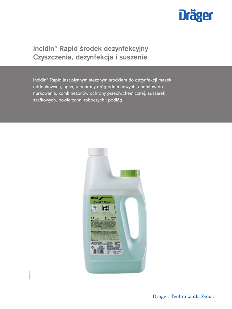 Incidin® Rapid środek dezynfekcyjny Czyszczenie, dezynfekcja i suszenie D-98828-2013 Incidin® Rapid jest płynnym stężonym środkiem do dezynfekcji masek oddechowych, sprzętu ochrony dróg oddechowych, aparatów do nurkowania, kombinezonów ochrony przeciwchemicznej, suszarek szafkowych, powierzchni roboczych i podłóg. 02 | Incidin® Rapid środek dezynfekcyjny Zalety Produkt Incidin jest płynnym środkiem do dezynfekcji i czyszczenia, charakteryzującym się specjalnym składem substancji czynnych zawierających aldehydy, szerokim zakresem zastosowań i szczególnie niskim wymaganym stężeniem podczas stosowania w kąpieli zanurzeniowej. Rejestracja ‒ Wyrób medyczny ECOLAB, klasa IIa zgodnie z dyrektywą 93/42/EWG CE 0297 ‒ Zarejestrowany jako produkt biocydowy Zalety produktu ‒ Stężony środek dezynfekcyjny niezawierający formaldehydów ‒ Skuteczna i bezpieczna dezynfekcja, nawet gdy środek stosowany jest w niewielkim stężeniu i czas ekspozycji w kąpieli zanurzeniowej jest krótki ‒ Szeroki wachlarz zastosowań w usuwaniu bakterii, drożdżaków i wirusów ‒ Wysoka kompatybilność materiałowa ‒ Łatwe dozowanie przy pomocy dozownika DG1 ‒ Wysoka wydajność dzięki niewielkiemu stężeniu podczas stosowania w kąpieli zanurzeniowej ‒ Na liście VAH*. Środek wirusobójczy * Association for Applied Hygiene (VAH, Stowarzyszenie Higieny Stosowanej) Instrukcja stosowania ‒ Należy zachować szczególną ostrożność przy stosowaniu biocydów. Przed użyciem należy najpierw zapoznać się z ulotką informacyjną i informacjami zamieszczonymi na etykiecie produktu. ‒ Ściśle przestrzegać odpowiednich instrukcji użytkowania masek oddechowych, sprzętu ochrony dróg oddechowych, kombinezonów ochrony przeciwchemicznej itp. firmy Dräger oraz instrukcji stosowania producenta środka do dezynfekcji! Incidin® Rapid środek dezynfekcyjny | 03 Powiązane produkty Sekusept® Cleaner płyn do czyszczenia D-98827-2013 Środek czyszczący Sekusept® jest stężonym płynnym środkiem do ręcznego czyszczenia masek oddechowych i sprzętu ochrony dróg oddechowych, aparatów do nurkowania i kombinezonów ochrony przeciwchemicznej przed dezynfekcją. Czyszczenie odzieży roboczej D-4073-2014 Odzież robocza jest często narażona na działanie szkodliwych czynników zewnętrznych. Aby odpowiednio przygotować odzież roboczą do ponownego użytku, należy ją oczyścić i zdezynfekować przy pomocy właściwego środka do dezynfekcji. Czyszczenie powierzchni i urządzeń testujących D-3957-2014 Higiena i czystość: Specjalne środki do czyszczenia i dezynfekcji wszelkiego rodzaju powierzchni zapewniają utrzymanie sterylnych warunków w miejscu pracy. Higiena osobista ST-7476-2008 Bezlitosne dla bakterii - łagodne dla skóry. Łagodne produkty do czyszczenia, dezynfekcji i pielęgnacji powierzchni nie podrażniają skóry nawet w przypadku częstego stosowania. 04 | Incidin® Rapid środek dezynfekcyjny Dane techniczne DOZOWANIE Wydajność (%) Dezynfekcja urządzeń i sprzętu 1,5 ochrony dróg oddechowych w kąpieli zanurzeniowej zgodnie z dyrektywą EN 14561/EN 14562 (bakteriobójcze/ drożdżobójcze środki) Stężenie (ml/l) Czas ekspozycji (min.) 15 15 TABELA DOZOWANIA – PŁYN W litrach Stężenie dozowania 1,5 % 1 litr 15 ml 2 litry 30 ml 3 litry 45 ml 4 litry 60 ml 5 litrów 75 ml 8 litrów 120 ml 10 litrów 150 ml 20 litrów 300 ml 30 litrów 450 ml Instrukcja stosowania Przykład: 10 litrów = 1,5 %-owy roztwór = 150 ml środka dezynfekcyjnego + 9,85 litrów wody. Do wody dodać stężony środek dezynfekcyjny z zachowaniem właściwych proporcji, krótko wymieszać. Roztwór można natychmiast zastosować. Wymieniać każdego dnia zgodnie z zaleceniami RKI* (Instytut Roberta Kocha) dotyczącymi roztworów dezynfekcyjnych. Nieużywany roztwór dezynfekcyjny może być zastosowany maksymalnie 14 dni po przygotowaniu. Przechowywać roztwór w czystych, przykrytych pojemnikach (zlewy, zbiorniki magazynowe). * Instytut Roberta Kocha, Berlin, Niemcy Informacje zamówieniowe Incidin® Rapid 1 x 2-litrowa butelka z ręcznym dozownikiem R 62 804 Incidin® Rapid 1 x 30-litrowy kanister R 61 883 Incidin® Rapid 3 x 2-litrowe butelki z ręcznym dozownikiem R 62 217 Incidin® Rapid 6-litrowy kanister R 61 880 Kontrolowany przez mikroprocesor dozownik ułatwia precyzyjne przygotowanie wodnego roztworu środka dezynfekcyjnego 65 70 187 AKCESORIA Dozownik DG1 Firma ECOLAB chętnie udzieli na życzenie dodatkowych informacji dotyczących czyszczenia urządzeń medycznych. Producent: INCIDIN® jest zastrzeżonym znakiem towarowym ECOLAB. Incidin® Rapid środek dezynfekcyjny | 05 Notatki 90 71 817 | 15.09-1 | Communications & Sales Marketing | PP | LE | Printed in Germany | Nie zawiera chloru – spełnia warunki ochrony środowiska | Zastrzegamy prawo zmian | © 2015 Drägerwerk AG & Co. KGaA 06 | Incidin® Rapid środek dezynfekcyjny Notatki CENTRALA Skontaktuj się z nami: Drägerwerk AG & Co. KGaA Moislinger Allee 53–55 23558 Lubeka, Niemcy www.draeger.com Dräger Safety Polska Sp. z.o.o. Siedziba firmy: ul. Chorzowska 25 41-902 Bytom Tel + 48 32 388 76 60 Fax + 48 32 601 26 24 MANUFACTURER Ecolab Deutschland GmbH Ecolab-Allee 1 40789 Monheim am Rhein Germany Phone: +49 (0) 2173-599-0 Znajdź lokalnego przedstawiciela handlowego na stronie: www.draeger.com/kontakt