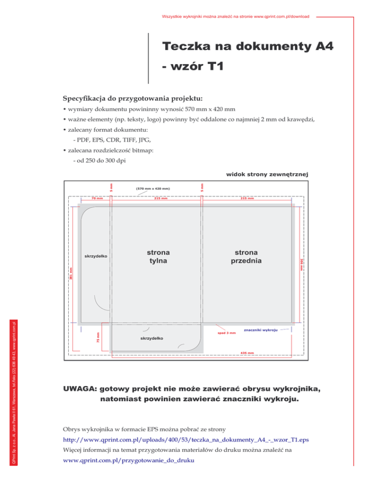 Wszystkie wykrojniki można znaleźć na stronie www.qprint.com.pl/download Teczka na dokumenty A4 - wzór T1 Specyfikacja do przygotowania projektu: • wymiary dokumentu powininny wynosić 570 mm x 420 mm • ważne elementy (np. teksty, logo) powinny być oddalone co najmniej 2 mm od krawędzi, • zalecany format dokumentu: - PDF, EPS, CDR, TIFF, JPG, • zalecana rozdzielczość bitmap: - od 250 do 300 dpi 70 mm 215 mm 215 mm strona przednia 75 mm QPrint Sp. z o.o., Al. Jana Pawła II 61, Warszawa, tel./faks (22) 636 49 43, www.qprint.com.pl 381 mm strona tylna spad 3 mm 306 mm skrzydełko (570 mm x 420 mm) 5 mm 5 mm widok strony zewnętrznej znaczniki wykroju skrzydełko 435 mm UWAGA: gotowy projekt nie może zawierać obrysu wykrojnika, natomiast powinien zawierać znaczniki wykroju. Obrys wykrojnika w formacie EPS można pobrać ze strony http://www.qprint.com.pl/uploads/400/53/teczka_na_dokumenty_A4_-_wzor_T1.eps Więcej informacji na temat przygotowania materiałów do druku można znaleźć na www.qprint.com.pl/przygotowanie_do_druku