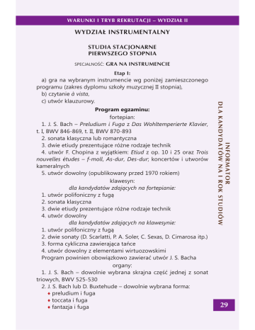 :$581.,,75<%5(.587$&-,q:<'=,$É,, :<'=,$É,167580(17$/1< 678',$67$&-21$51( 3,(5:6=(*267231,$ 63(&-$/12Ğü*5$1$,167580(1&,( EWDSI 3URJUDPHJ]DPLQX IRUWHSLDQ -6%DFK²3UHOXGLXPL)XJD]'DV:RKOWHPSHULHUWH.ODYLHU W,%:9W,,%:9 VRQDWDNODV\F]QDOXEURPDQW\F]QD GZLHHWLXG\SUH]HQWXMĆFHUyīQHURG]DMHWHFKQLN XWZyU)&KRSLQD] Z\MĆWNLHP Etiud ] RSL RUD] 7URLV QRXYHOOHV pWXGHV ² f-moll $VGXU 'HVGXU NRQFHUWyZ L XWZRUyZ NDPHUDOQ\FK XWZyUGRZROQ\RSXEOLNRZDQ\SU]HGURNLHP NODZHV\Q GODNDQG\GDWyZ]GDMĆF\FKQDIRUWHSLDQLH XWZyUSROLIRQLF]Q\]IXJĆ VRQDWDNODV\F]QD GZLHHWLXG\SUH]HQWXMĆFHUyīQHURG]DMHWHFKQLN XWZyUGRZROQ\ GODNDQG\GDWyZ]GDMĆF\FKQDNODZHV\QLH XWZyUSROLIRQLF]Q\]IXJĆ GZLHVRQDW\'6FDUODWWL3$6ROHU&6H[DV'&LPDURVDLWS IRUPDF\NOLF]QD]DZLHUDMĆFDWDĕFH XWZyUGRZROQ\]HOHPHQWDPLZLUWXR]RZVNLPL 3URJUDPSRZLQLHQRERZLĆ]NRZR]DZLHUDýXWZyU-6%DFKD RUJDQ\ - 6 %DFK ² GRZROQLH Z\EUDQD VNUDMQD F]ċğý MHGQHM ] VRQDW WULRZ\FK%:9 -6%DFKOXE'%X[WHKXGH²GRZROQLHZ\EUDQDIRUPD ʕSUHOXGLXPLIXJD ʕWRFFDWDLIXJD ʕIDQWD]MDLIXJD INFORMATOR ' / $ . $ 1 ' < ' $ 7 £ : 1 $ , 5 2 . 6 7 8 ' , £ : DJUDQDZ\EUDQ\PLQVWUXPHQFLHZJSRQLīHM]DPLHV]F]RQHJR SURJUDPX]DNUHVG\SORPXV]NRâ\PX]\F]QHM,,VWRSQLD EF]\WDQLHjYLVWD FXWZyUNODX]XURZ\ 29 AKADEMIA MUZYCZNA IM. IGNACEGO JANA PADEREWSKIEGO W POZNANIU :$581.,,75<%5(.587$&-,q:<'=,$É,, 30 GRZROQLHZ\EUDQ\XWZyUHSRNLURPDQW\]PXOXEQHRURPDQW\]PX&)UDQFN)0HQGHOVVRKQ%DUWKROG\05HJHU$*5LWWHU -*5KHLQEHUJHU05HJHU06XU]\ĕVNL)1RZRZLHMVNLLLQ SHUNXVMD %/\OORII²cUKXV(WXGHQU]F\NOXÅ(WXGHIRU6QDUH'UXPµ XWZyUGRZROQ\VROROXE]DNRPSDQLDPHQWHPQDNV\ORIRQ XWZyUGRZROQ\VROROXE]DNRPSDQLDPHQWHPQDNRWâ\ XWZyUGRZROQ\Z\NRU]\VWXMĆF\F]WHURSDâNRZĆWHFKQLNċJU\ QDZLEUDIRQ XWZyUGRZROQ\Z\NRU]\VWXMĆF\F]WHURSDâNRZĆWHFKQLNċJU\ QDPDULPEċ Uwaga! 3RQDGWR NDQG\GDFL SRGGDQL ]RVWDQĆ VSUDZG]LDQRZL XPLHMċWQRğFLWHFKQLF]Q\FKZJU]HWUHPRORQDZHUEOX WUHPROR QD NRWâDFK Z\NRQDQLH JDP QD NV\ORIRQLH LWS-HīHOLNDQG\GDWZ F]DVLHVZRMHMQDXNLZ V]NROH ğUHGQLHMQLH]HWNQĆâVLċUyZQRF]HğQLH]JUĆQDZLEUDIRQLH L PDULPELH Z\NRQXMH XWZyU QD MHGQ\P ] W\FK LQVWUXPHQWyZ LQVWUXPHQW\GċWH ZâDVQHSURJUDP\NDQG\GDWyZXZ]JOċGQLDMĆFHUyīQHVW\OHLIRUP\ PX]\F]QH LQVWUXPHQW\KLVWRU\F]QH ZâDVQH SURJUDP\ NDQG\GDWyZ XZ]JOċGQLDMĆFH FR QDMPQLHM GZD UyīQHVW\OHL]DZLHUDMĆFHXWZyUQDLQVWUXPHQWVROR Uwaga! .RPLVMHHJ]DPLQDF\MQHUH]HUZXMĆVRELHSUDZRGRZ\ERUXXWZRUyZOXELFKF]ċğFLGRSUH]HQWDFML EWDS II HJ]DPLQ]NV]WDâFHQLDVâXFKXPRīQDGRQLHJRSU]\VWĆSLýSRX]\VNDQLXZ,HWDSLHSU]\QDMPQLHMSNWZVNDOLSXQNWRZHM 63(&-$/12Ğü*5$1$,167580(1&,( :=$.5(6,(08=<.,-$==2:(-,(675$'2:(EWDS I DZ\NRQDQLHSURJUDPXQDZ\EUDQ\PLQVWUXPHQFLHZJ]DPLHV]F]RQHJRSRQLīHMSURJUDPX EVSUDZG]LDQXPLHMċWQRğFLJU\jYLVWD]XZ]JOċGQLHQLHPLPSURZL]DFMLRSDUWHMQDZ\]QDF]RQ\PSU]HELHJXKDUPRQLF]Q\P FXWZyUNODX]XURZ\ :$581.,,75<%5(.587$&-,q:<'=,$É,, 3URJUDPHJ]DPLQX ZV]\VWNLHLQVWUXPHQW\]Z\MĆWNLHPSHUNXVML GZDGRZROQHXWZRU\NODV\F]QH WU]\XWZRU\MD]]RZHZW\PMHGHQEOXHVOXEUK\WKPFKDQJHV SHUNXVMD GZDGRZROQHXWZRU\QDZHUEHOZW\PMHGHQRSDUW\QDUXG\PHQWDUQHMWHFKQLFHZHUEORZHM XWZyUGRZROQ\QDLQVWUXPHQWPHORG\F]Q\ WU]\XWZRU\MD]]RZHR]UyīQLFRZDQHMVW\OLVW\FHU\WPLFH EWDS II ZHU\ÀNDFMD X]GROQLHĕ PX]\F]Q\FK SUHG\VSR]\FML VâXFKRZ\FK L ]QDMRPRğFL ]DVDG PX]\NL GR HJ]DPLQX PRīQD SU]\VWĆSLý SR X]\VNDQLXZ,HWDSLHSU]\QDMPQLHMSNWZVNDOLSXQNWRZHM 63(&-$/12Ğü.2032=<&-$,$5$1Ó$&-$ :=$.5(6,(08=<.,-$==2:(-,(675$'2:(- EWDS I DSU]HGVWDZLHQLHSDUW\WXUZF]HğQLHMV]\FKGRNRQDĕNRPSR]\WRUVNLFKLOXEDUDQīHUVNLFK EVSUDZG]LDQZLHG]\RKDUPRQLLMD]]RZHMLKLVWRULLMD]]XVW\OH SU]HGVWDZLFLHOHLWS FJUDQDZ\EUDQ\PLQVWUXPHQFLHGRZROQ\XWZyUNODV\F]Q\RUD] GRZROQ\XWZyUZVW\OLVW\FHMD]]RZHMOXESRNUHZQHM GRSUDFRZDQLHNODX]XURZHVWZRU]HQLHLZ\NRQDQLHQDIRUWHSLDQLHLPSUHVMLPHORGLD]DNRPSDQLDPHQWHPQDNDQZLHSRGDQHJR SU]HELHJXKDUPRQLF]QHJR]DSLVDQHJRV\PERODPL INFORMATOR ' / $ . $ 1 ' < ' $ 7 £ : 1 $ , 5 2 . 6 7 8 ' , £ : Uwaga!'RGRNXPHQWyZQDOHī\GRâĆF]\ýQXW\GODVHNFMLDNRPSDQLXMĆFHM EWDS,, ZHU\ÀNDFMD X]GROQLHĕ PX]\F]Q\FK SUHG\VSR]\FML VâXFKRZ\FK L ]QDMRPRğFL ]DVDG PX]\NL GR HJ]DPLQX PRīQD SU]\VWĆSLý SR X]\VNDQLXZ,HWDSLHSU]\QDMPQLHMSNWZVNDOLSXQNWRZHM 63(&-$/12Ğü:2.$/,67<.$ :=$.5(6,(08=<.,-$==2:(-,(675$'2:(EWDS, 6SUDZG]HQLH X]GROQLHĕ PX]\F]Q\FK SUHG\VSR]\FML VâXFKRZ\FK L]QDMRPRğFL]DVDGPX]\NL 31 :$581.,,75<%5(.587$&-,q:<'=,$É,, AKADEMIA MUZYCZNA IM. IGNACEGO JANA PADEREWSKIEGO W POZNANIU EWDS,, 32 .DQG\GDWSU]\VWċSXMHGRQDVWċSQHJRHWDSXMHğOLX]\VNDZ,HWDSLH FRQDMPQLHMRFHQċGREUĆSNW DHJ]DPLQ]HğSLHZXXZ]JOċGQLDMĆF\WU]\XWZRU\]UyīQLFRZDQH VW\OLVW\F]QLH Z W\P SU]\QDMPQLHM MHGHQ XWZyU Z Mċ]\NX SROVNLP LMHGHQZMċ]\NXDQJLHOVNLPRUD]EOXHV EXWZyUNODX]XURZ\ F UHF\WDFMD RSDQRZDQ\FK SDPLċFLRZR IUDJPHQWyZ SRH]ML OXE SUR]\ Uwaga!3RGF]DVVNâDGDQLDGRNXPHQWyZQDOHī\]D]QDF]\ýF]\ NDQG\GDWSRVLDGDZâDVQHJRDNRPSDQLDWRUD:SU]\SDGNX NRQLHF]QRğFL ZVSyâSUDF\ ] DNRPSDQLDWRUHP ] XF]HOQL NDQG\GDW SURV]RQ\ MHVW R NRQWDNW Z FHOX XVWDOHQLDWHUPLQXSUyE\SRX]\VNDQLXSR]\W\ZQHJR Z\QLNXZHWDSLH,'RGRNXPHQWyZQDOHī\GRâĆF]\ý QXW\GODVHNFMLDNRPSDQLXMĆFHM 678',$67$&-21$51( '58*,(*267231,$ 63(&-$/12Ğü*5$1$,167580(1&,( DZ\NRQDQLHPLQXWRZHJRSURJUDPX EUR]PRZDNZDOLÀNDF\MQDQDWHPDW]ZLĆ]DQ\]NLHUXQNLHPVWXGLyZ 3URJUDPHJ]DPLQX IRUWHSLDQ GRZROQ\ SURJUDP ]UyīQLFRZDQ\ VW\OLVW\F]QLH ]DZLHUDMĆF\ XWZRU\ FRQDMPQLHM]GZyFKHSRN NODZHV\Q GRZROQ\ SURJUDP ]UyīQLFRZDQ\ VW\OLVW\F]QLH ]DZLHUDMĆF\ XWZRU\ FRQDMPQLHM]GZyFKHSRN RUJDQ\ GRZROQDIRUPDEDURNRZD NRPSOHWQDIRUPDURPDQW\F]QDOXEZVSyâF]HVQD SHUNXVMD GZDGRZROQHXWZRU\MHGHQ]QLFKRSDUW\QDUXG\PHQWDUQHM WHFKQLFHZHUEORZHM XWZyUGRZROQ\QDNRWâ\]DNRPSDQLDPHQWHPIRUWHSLDQX XWZyU GRZROQ\ QD ZLEUDIRQ Z\NRU]\VWXMĆF\ F]WHURSDâNRZĆ WHFKQLNċJU\ :$581.,,75<%5(.587$&-,q:<'=,$É,, XWZyU GRZROQ\ QD PDULPEċ Z\NRU]\VWXMĆF\ F]WHURSDâNRZĆ WHFKQLNċJU\ VSUDZG]LDQXPLHMċWQRğFLJU\jYLVWDQDZZLQVWUXPHQWDFK Uwaga!3RQDGWR NDQG\GDFL SRGGDQL ]RVWDQĆ VSUDZG]LDQRZL XPLHMċWQRğFL WHFKQLF]Q\FK Z JU]H WUHPROR QD ZHUEOX WUHPRORQDNRWâDFKZ\NRQ\ZDQLDJDPQDNV\ORIRQLHLWS 63(&-$/12Ğü*5$1$,167580(1&,( :=$.5(6,(08=<.,-$==2:(-,(675$'2:(- FJUDQDZ\EUDQ\PLQVWUXPHQFLHREHMPXMĆFDPLQXWRZ\ SURJUDP]DZLHUDMĆF\ WUDQVNU\SFMċLPSURZL]DFMLSRFKRG]ĆFHM]GRVWċSQHJRQDJUDQLD Sâ\WRZHJR DO